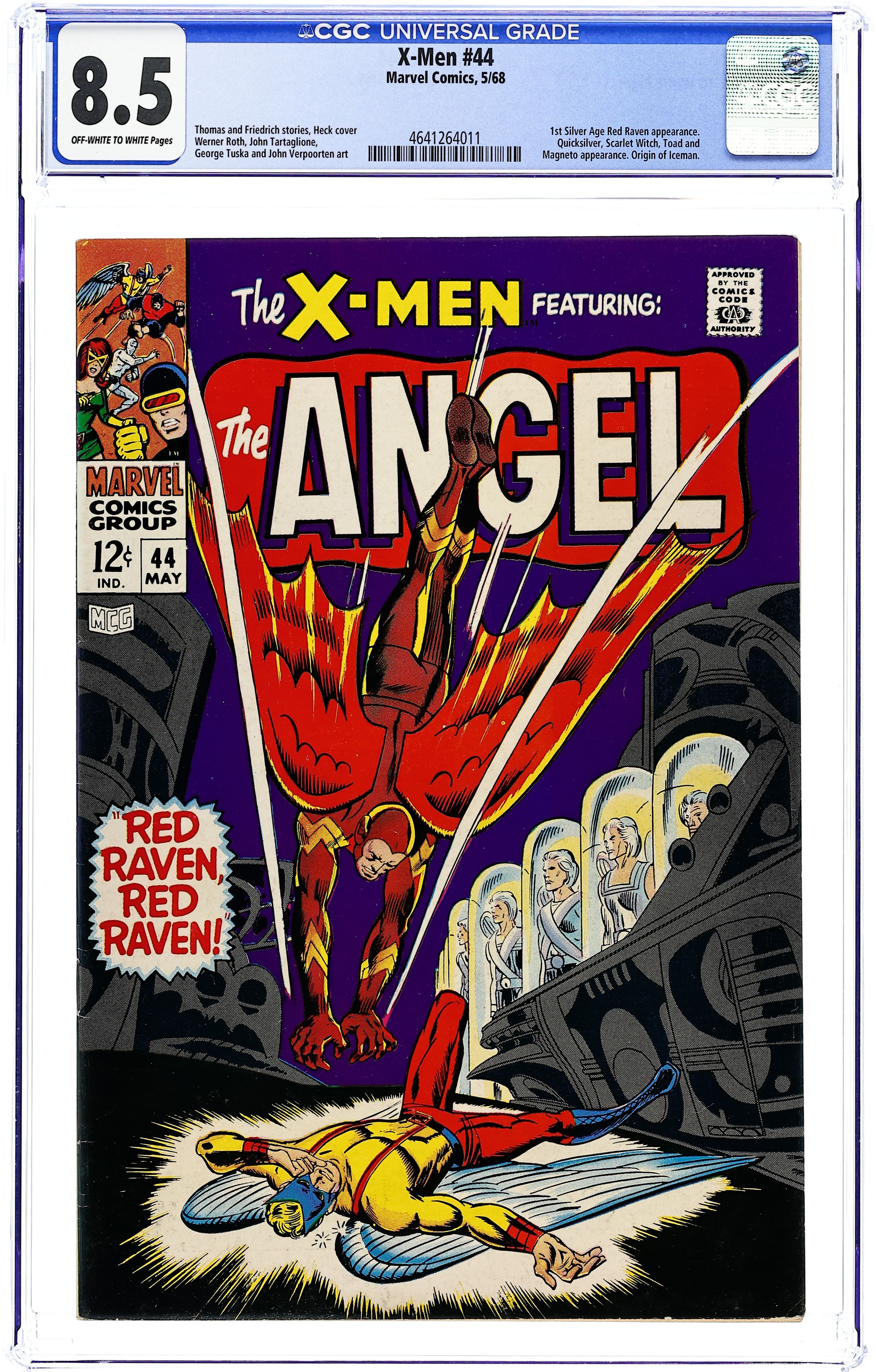 Starts Feb 23 First silver age appearance of the golden age Red Raven in "Red Raven, Red Raven..." Plot by Roy Thomas. Script by Gary Friedrich. Art by Don Heck (layouts), Werner Roth (pencils), and John Tartaglione (inks). Cover by Don Heck (pencils) and John Tartaglione (inks) with Marie Severin (alterations). The Uncanny X-Men have gone down to defeat at the hands of the Brotherhood of Evil Mutants! But auspiciously for the young mutants, Quicksilver convinces Magneto to spare their lives and keep Professor X's charges as prisoners instead! While in captivity the resourceful Angel escapes from his cage! Warren wants to free his friends next; however, Cyclops tells him to leave now and fly to Avengers Mansion! Angel starts flying east where he unbelievably runs into Sky-Island - the home of Red Raven and the bird-people! Wow, what a blast from the past! Is Red Raven going to help Angel or harm him? Appearances by the Scarlet Witch and Toad. Second story: "The Iceman Cometh!" Script by Gary Friedrich. Pencils by George Tuska. Inks by John Verpoorten. This five-page story presents the origin of Iceman (aka Bobby Drake). Cameo appearances by Professor X and Cyclops. (Notes: Red Raven previously appeared in Red Raven Comics (1940) #1. The letters page includes a letter from comics artist Keith Giffen. This story was reprinted in Uncanny X-Men #92.) 36 pages. Cover price $0.12.