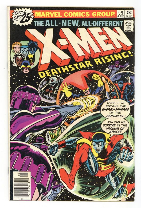 "Deathstar, Rising!" Part 2 of 3. Story by Chris Claremont. Art by Dave Cockrum and Frank Chiaramonte. The new X-Men boldly go where no X-Men have gone before as their battle with the mutant hating Sentinels takes to the edge of space and beyond. But before they can stop the madman Steve Lang, the X-Men will come face-to-face with the last people they expected to see! 36 pgs. Cover price $0.25.
