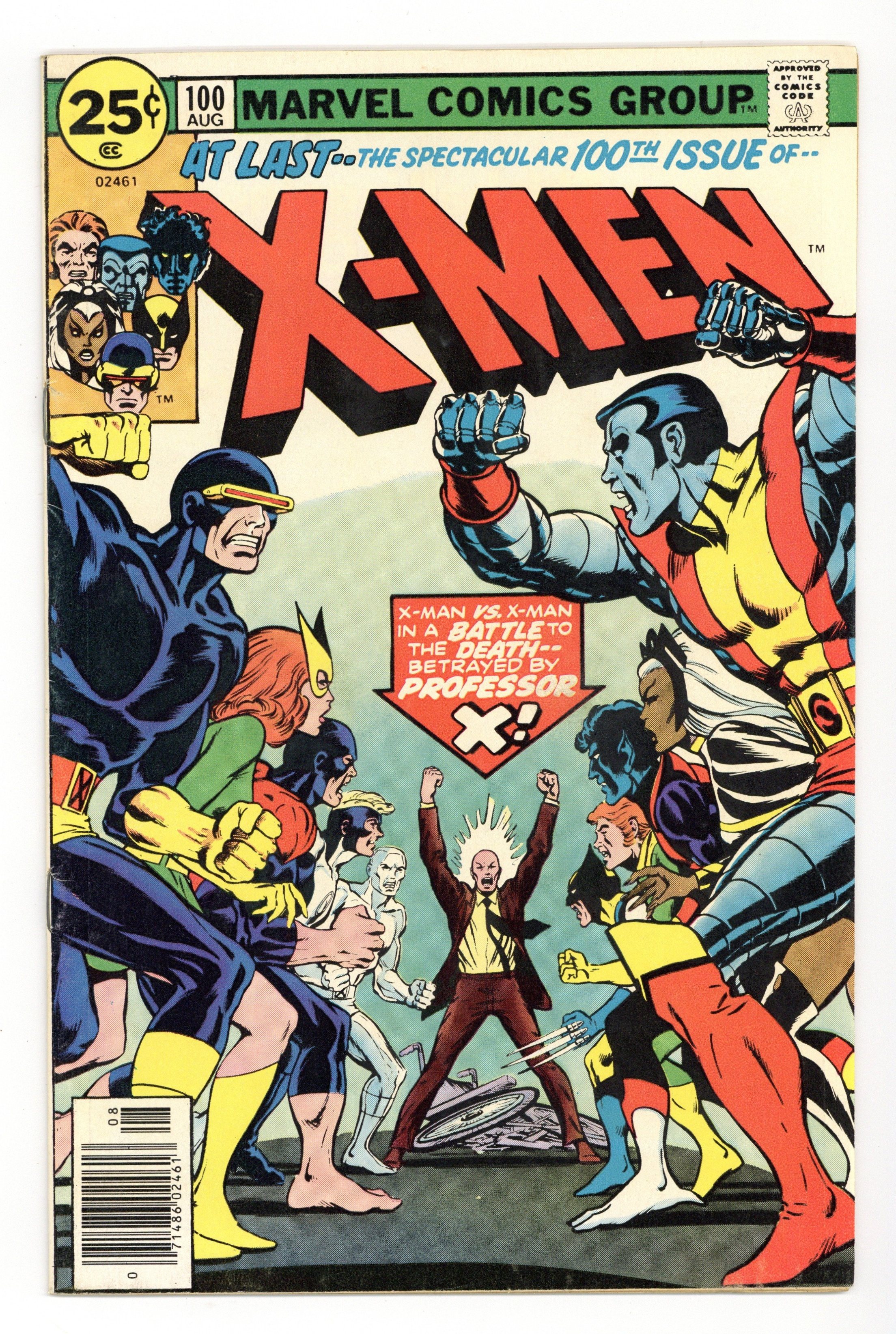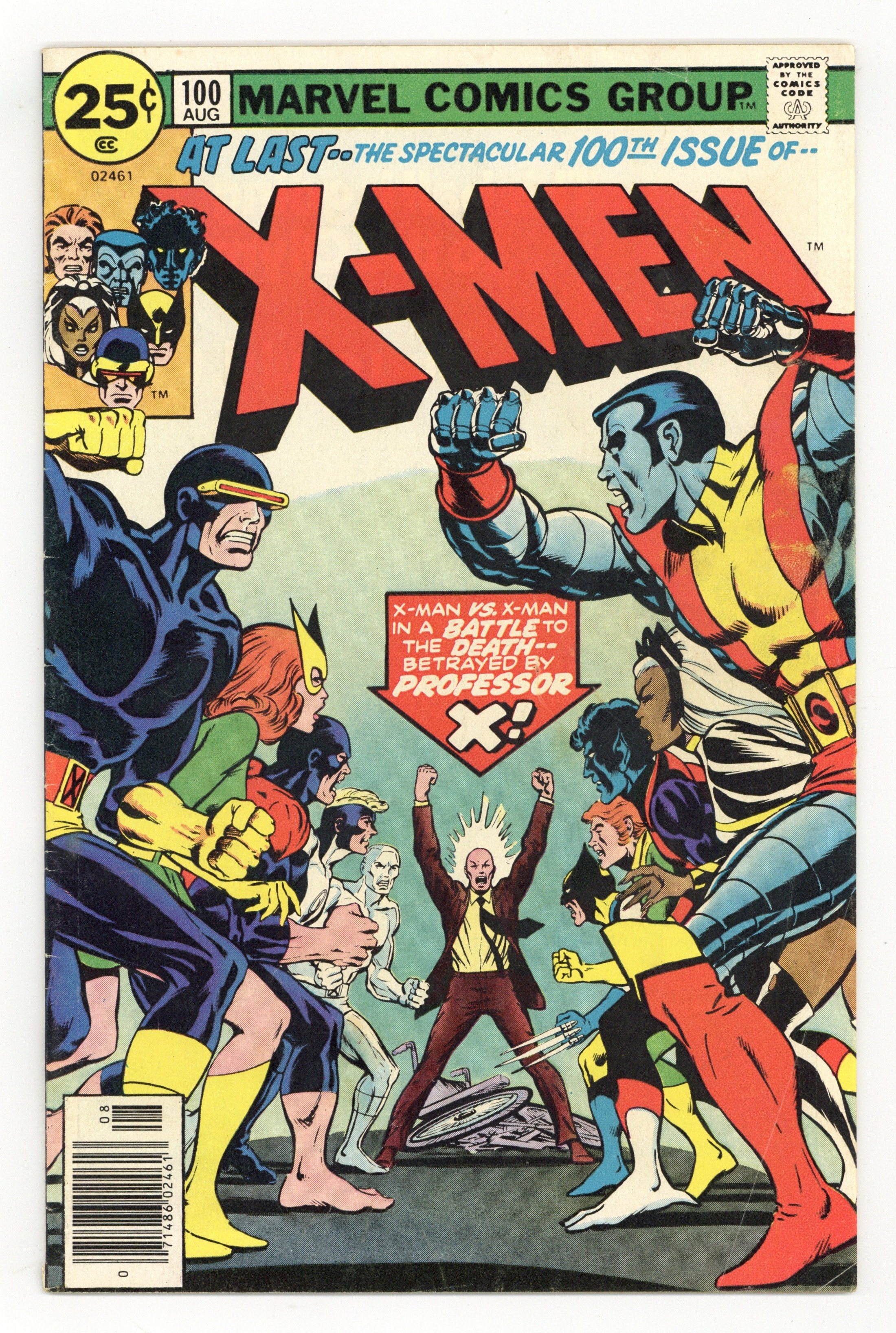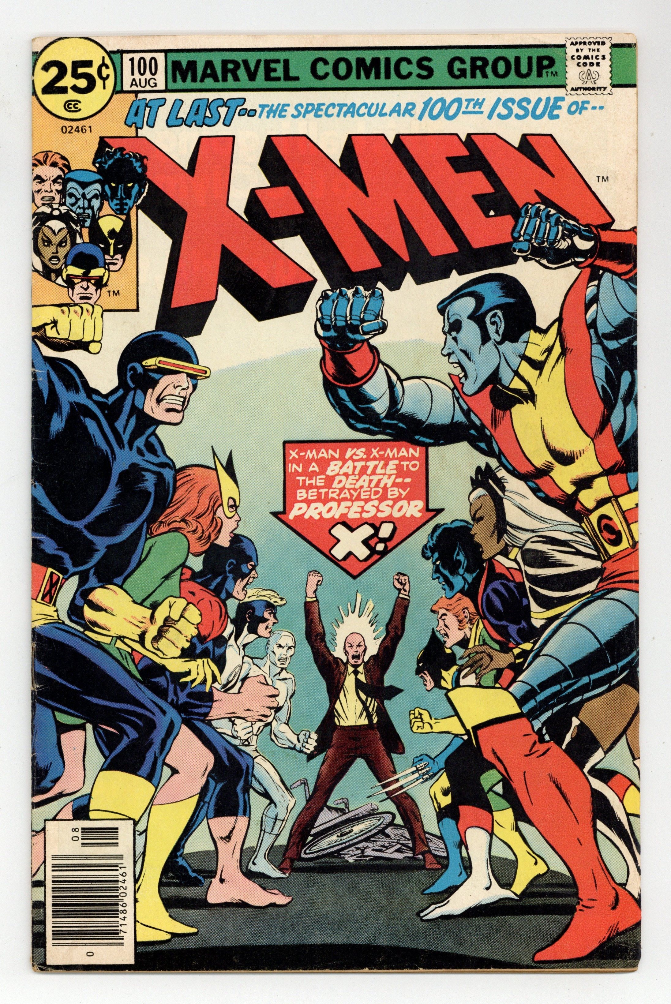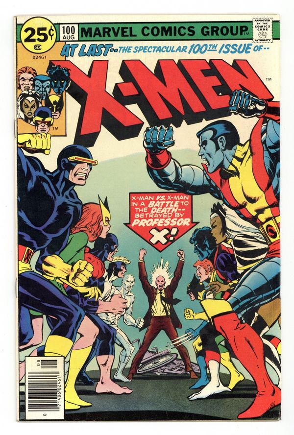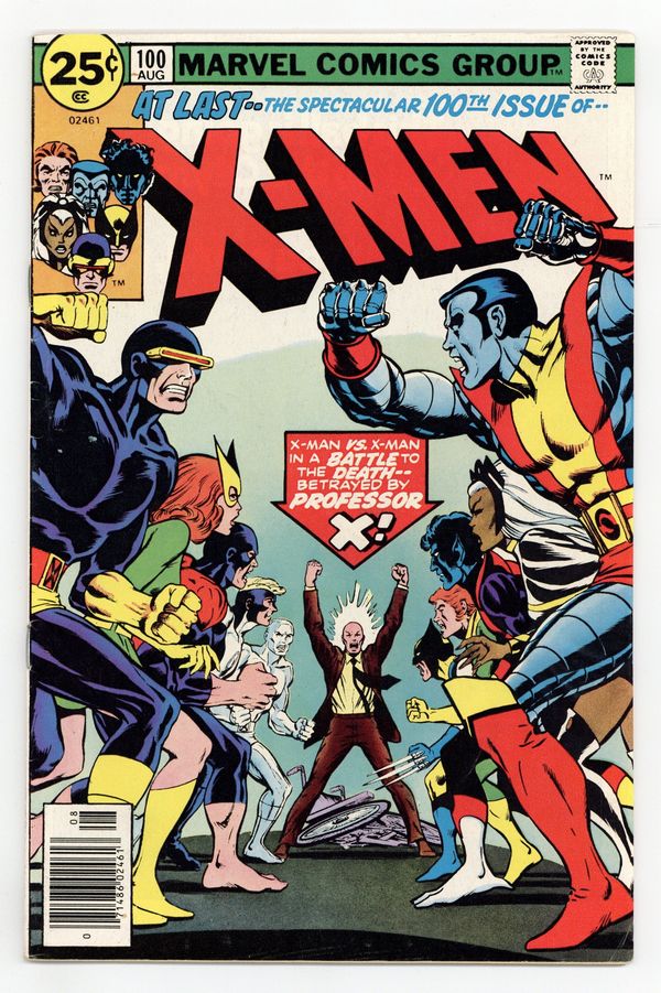 "Greater Love hath No X-Man...!" Part 3 of 3. Story by Chris Claremont. Art by Dave Cockrum. It's the old X-Men versus the new as Storm, Colossus, Nightcrawler, Banshee, and Wolverine face off with Ice Man, Angel, Beast and Marvel Girl! But why are X-Men battling X-Men and with which side will Cyclops' loyalties fall? Plus, will another X-Man have to make the ultimate sacrifice? Don't miss the shocking answers to these questions and more the most out of this world X-Men extravaganza yet! 36 pgs. Cover price $0.25.