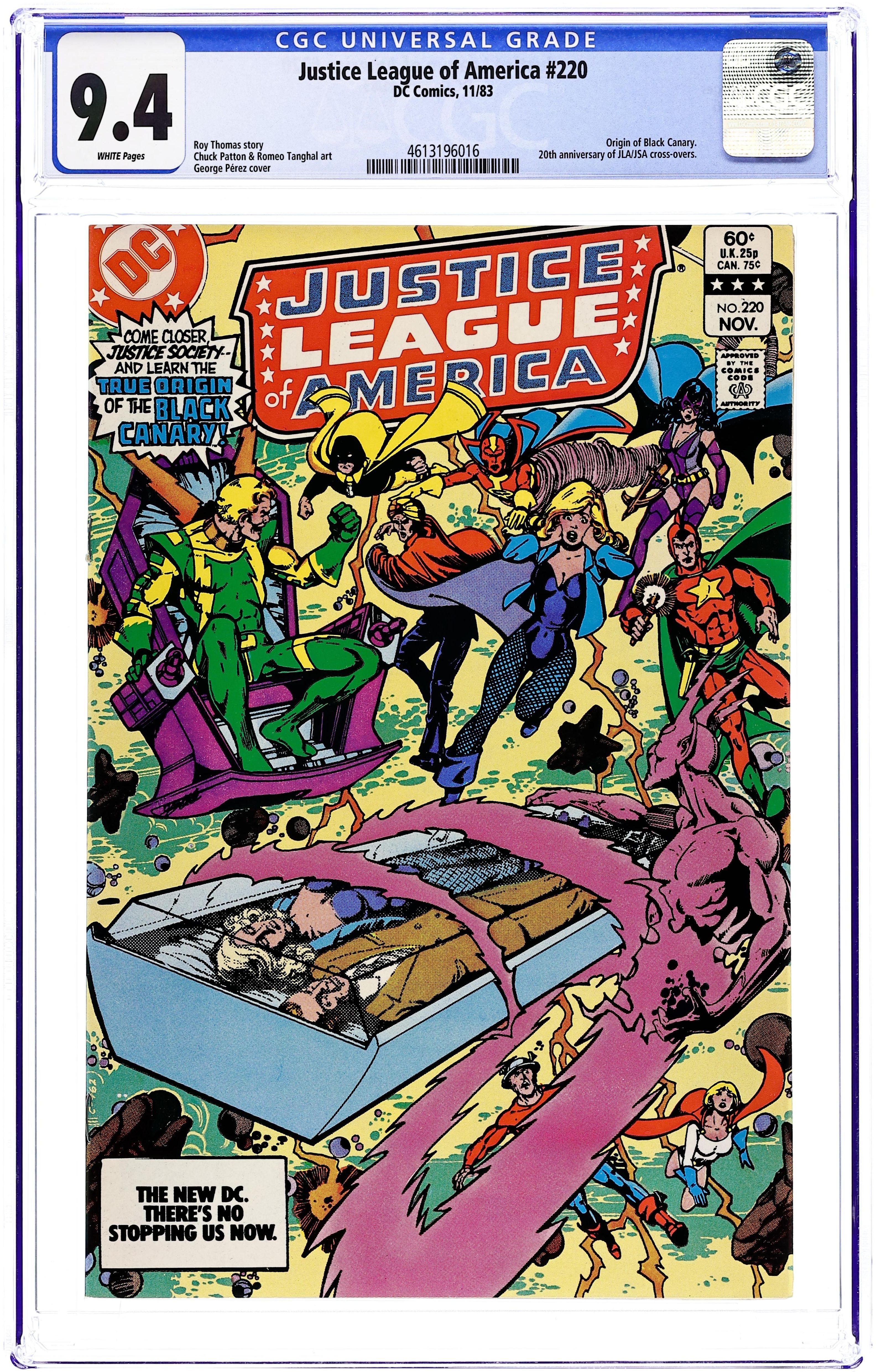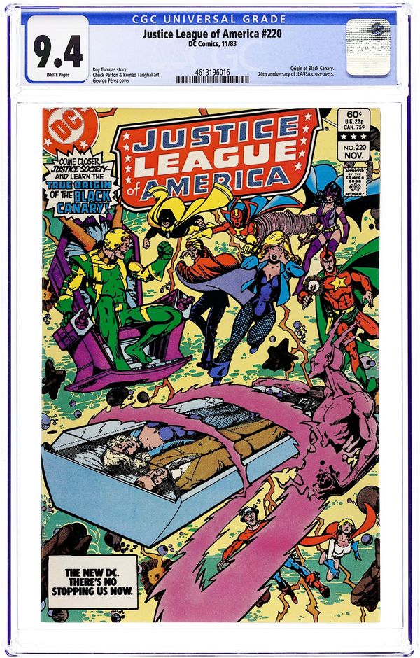Learn the true origin of the Black Canary! Guest-starring the Justice Society! "The Doppelganger Gambit" is written by Roy Thomas, with art by Chuck Patton, Romeo Tanghal and Pablo Marcos. Continued from last issue. Characters: Red Tornado; Flash [Barry Allen]; Green Lantern [Hal Jordan]; Zatanna; Firestorm; Black Canary; Elongated Man (all as the Justice League of America/JLA); Flash [Jay Garrick]; Power Girl; Hourman [Rex Tyler]; Huntress [Helena Wayne]; Starman [Ted Knight]; Sargon; Johnny Thunder's Thunderbolt; Johnny Thunder [Earth-2]; Hawkman [Carter Hall] (flashback); Atom [Al Pratt] (flashback); Green Lantern [Alan Scott] (flashback); Wonder Woman [Earth-2] (flashback); Dr. Mid-Nite (flashback) (all as the Justice Society of America/JSA); Jim Corrigan [Earth-1] (cameo); Johnny Thunder [Earth-1] (villain); Chronos; Fiddler; Icicle; Dr. Alchemy; The Wizard; Felix Faust. Cover by George Perez. Cover price $0.60.