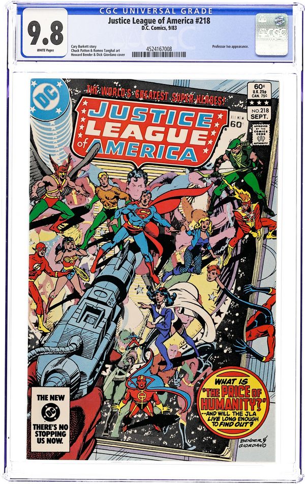 What is "The Price of Humanity"? And will the JLA live long enough to find out? Written by Cary Burkett, with art by Chuck Patton and Romeo Tanghal. Characters: Aquaman; Black Canary; Elongated Man; Green Arrow [Earth-1]; Hawkman [Katar Hol]; Red Tornado; Superman [Earth-1]; Wonder Woman [Earth-1] (all as the Justice Leauge of America/JLA); Professor Ivo (villain); Amazo (flashback). Cover by Howard Bender and Dick Giordano. Cover price $0.60.