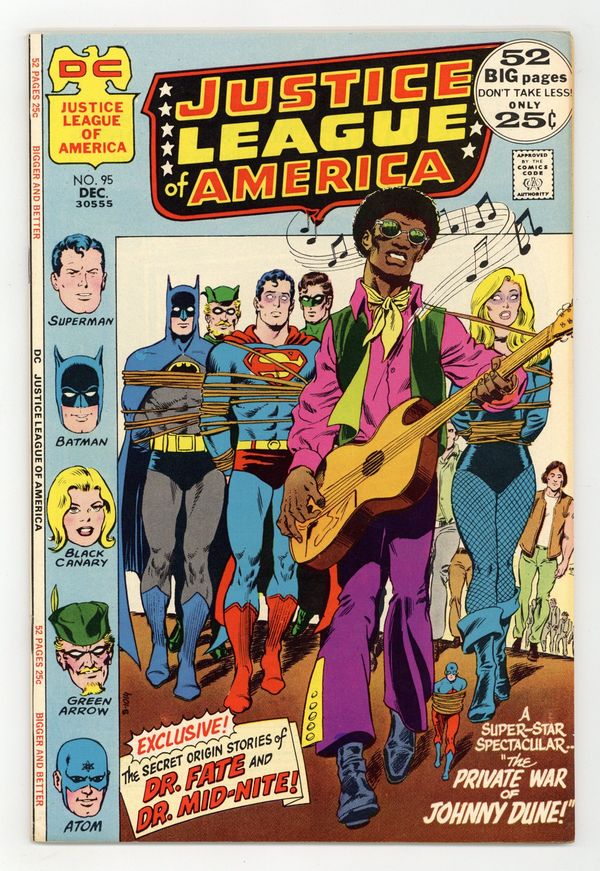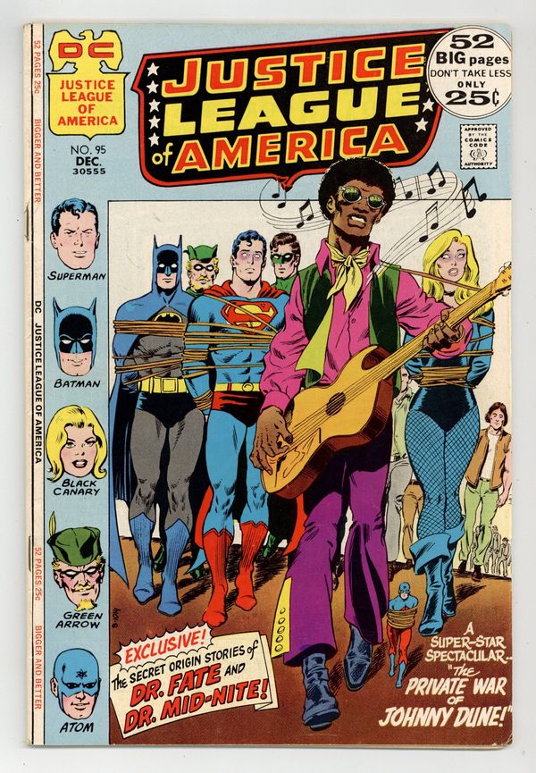 Cover pencils by Neal Adams, inks by Murphy Anderson. The Private War of Johnny Dune!, script by Mike Friedrich, pencils by Dick Dillin, inks by Joe Giella; Batman investigates the disappearance of Flash, Hawkman, and Green Lantern; American serviceman Johnny Dune is home from the war and can't get a job. How He Began starring Dr. Mid-Nite, Myra Mason, and "Killer" Maroni, script by Charles Reizenstein, art by Stan Aschmeier. The Origin of... Doctor Fate starring Doctor Fate, Sven Nelson, Nabu the Wise, and Negal, script by Gardner Fox, art by Howard Sherman. 52 pgs. $0.25. Cover price $0.25.