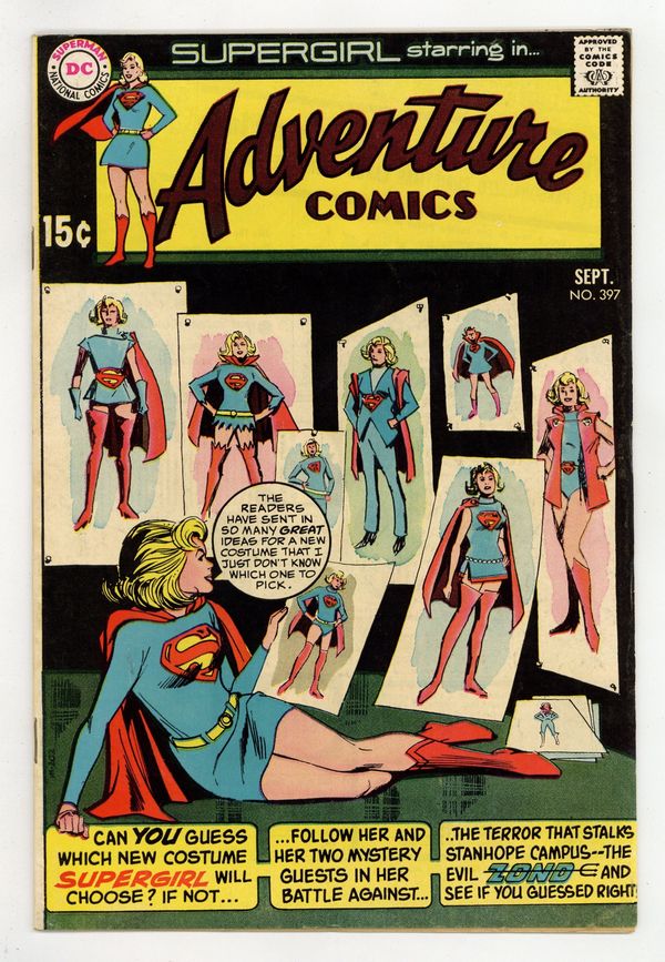 Cover pencils by Mike Sekowsky, inks by Dick Giordano. 1st appearance of the new Supergirl in Now...Comes Zond starring Supergirl, Wonder Woman, Morgana, and Zond, script and pencils by Mike Sekowsky, inks by Frank Giacoia; Supergirl battles Zond, who stalks the Stanhope campus; new costumes for Supergirl begin. Supergirl Meets Nasty, script and pencils by Mike Sekowsky, inks by Jack Abel. 36 Pages, Full Color. Cover price $0.15.