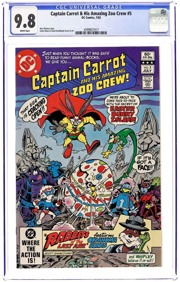 Direct Edition. "The Secret of Easter Bunny Island!" The Zoo Crew goes to Easter Bunny Island where they discover that alien eggs are buried. The issue also features battles against Dr. Hoot and a giant yolk monster. Explorer Oklahoma Bones and his partner, Whipley the snake, guest star. Script by Roy Thomas, pencils by Chad Grothkopf, inks by J. Chiang. Cover by Shaw and Grothkopf. Cover price $0.60.