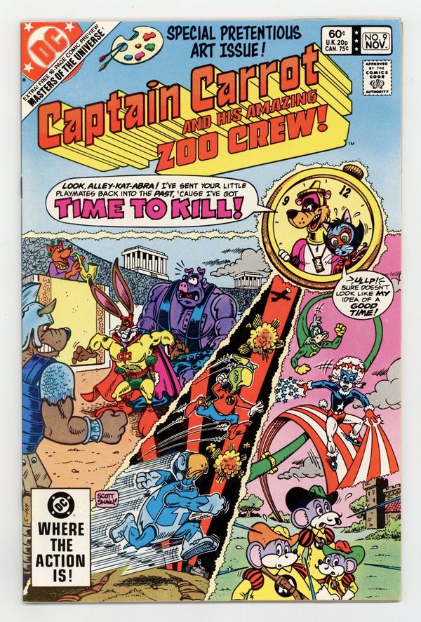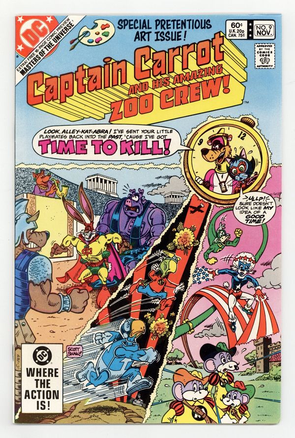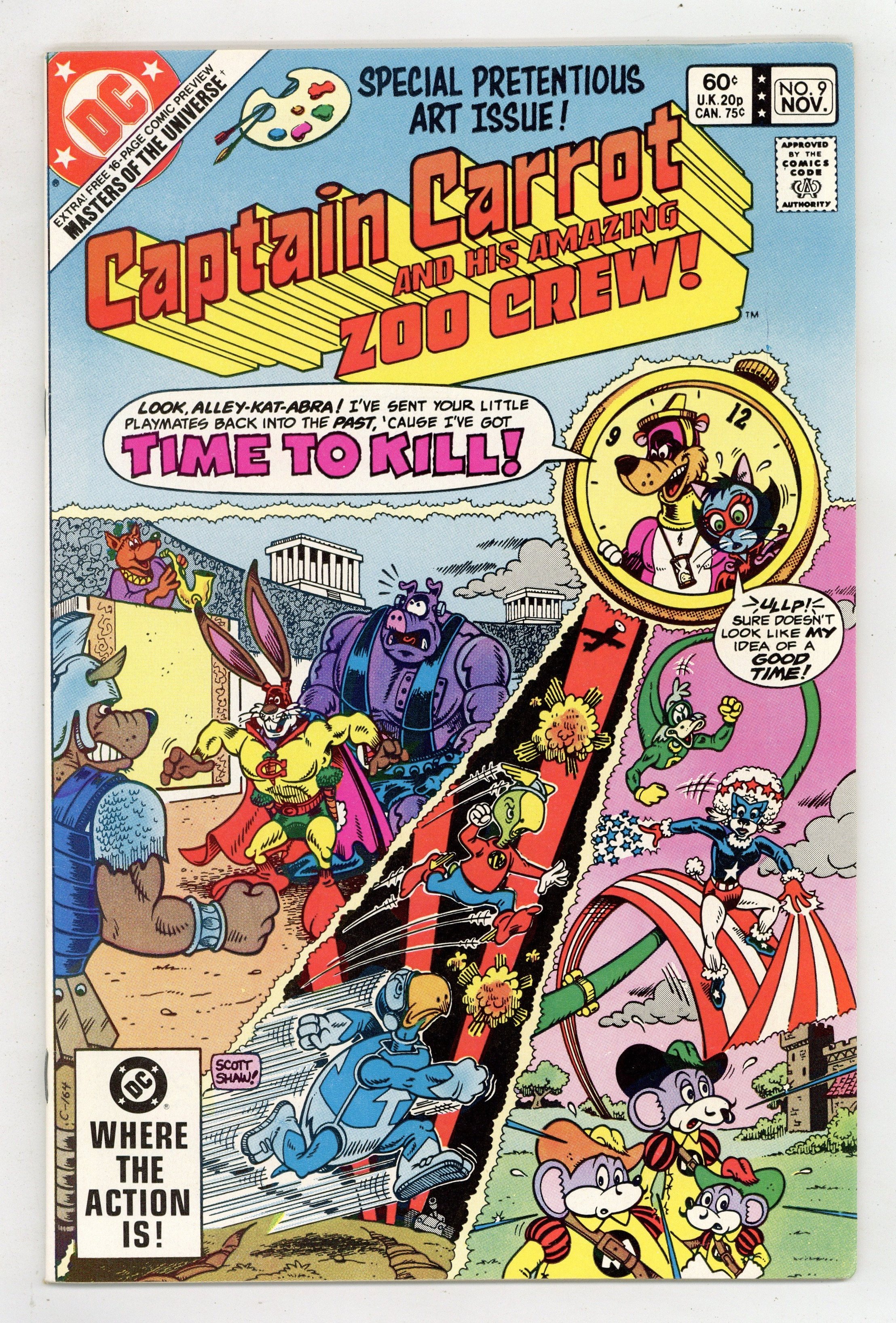 Direct Edition. "Time Varmints!" The Timekeeper sends the The Zoo Crew into the past, where the meet The Terrific Whatzit, The Three Musketeers, Nero Fox, and other funny animals. "Into the Deadly Dimension of Debbil-Dawg!" Alley-Kat-Abra battles Salavador Doggi inside a painting. Script by Roy Thomas and Scott Shaw, pencils by Shaw and Stan Goldberg, inks by Al Gordon. Cover by Shaw. Cover price $0.60.