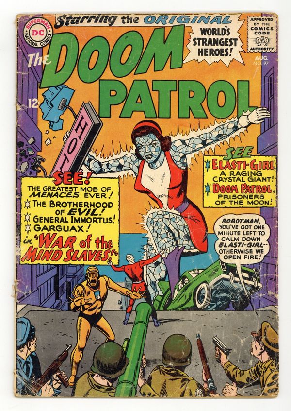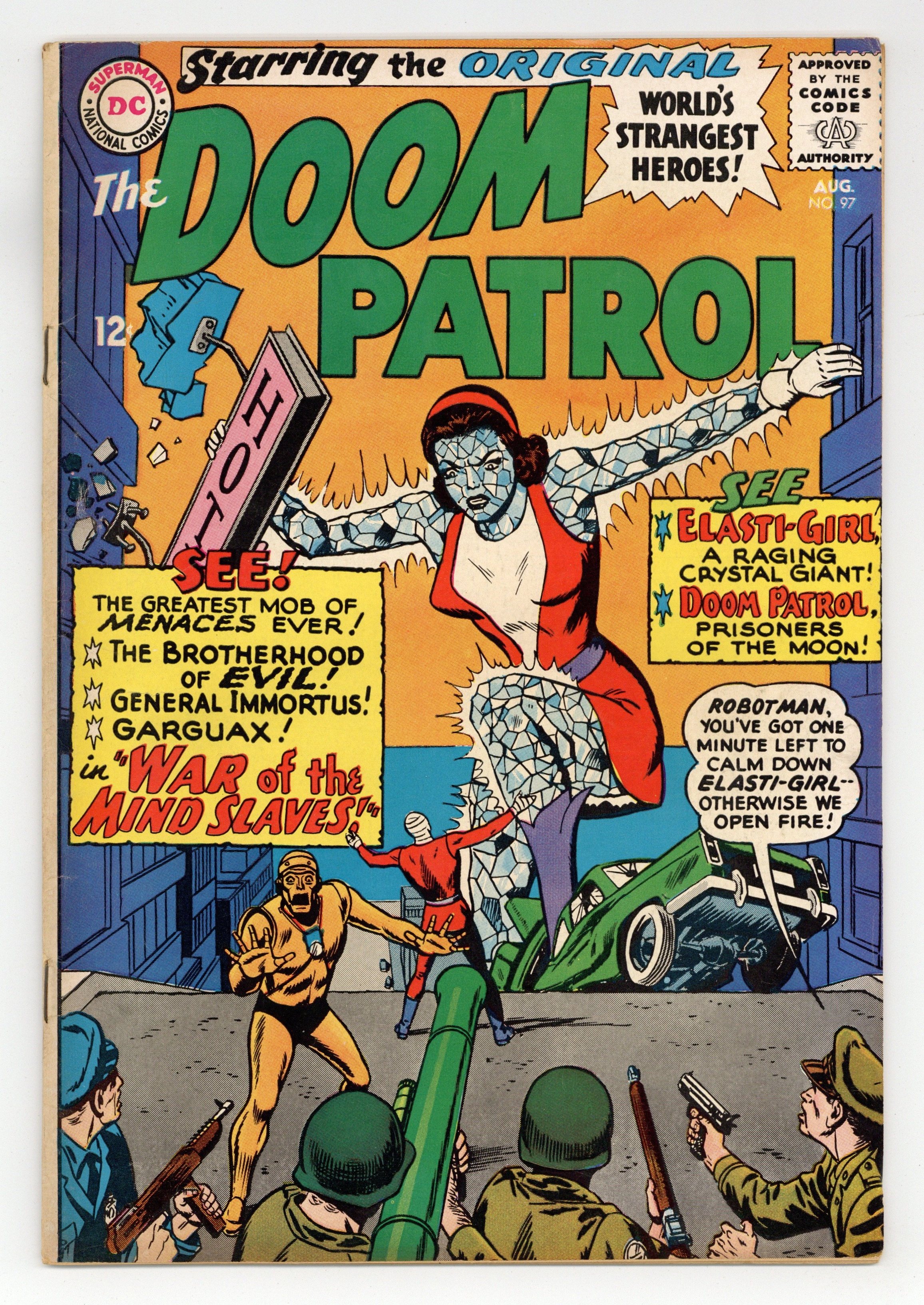 Cover by Bob Brown. The War Against the Mind Slaves (part 1), script by Arnold Drake, art by Bruno Premiani; With General Immortus and Garguax now members of the Brotherhood of Evil, the Doom Patrol go on practice sessions to hone their abilities, which go under great scrutiny of the Chief so that they fight more efficiently; Meanwhile, on the Brotherhood of Evil's moon base, Garguax convinces the Brotherhood of Evil to seek out larger stakes than monetary gain and instead to seek out world domination as the start in a bid to take over the known universe. Three Trails to Terror (part 2). Little Pete humor page by Henry Boltinoff. Prisoners of the Moon (part 3). Comic writer Roy Thomas gets a mention on the letters page. 36 pgs., full color. $0.12. Cover price $0.12.