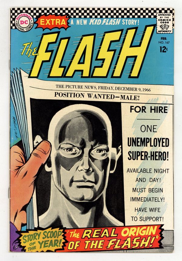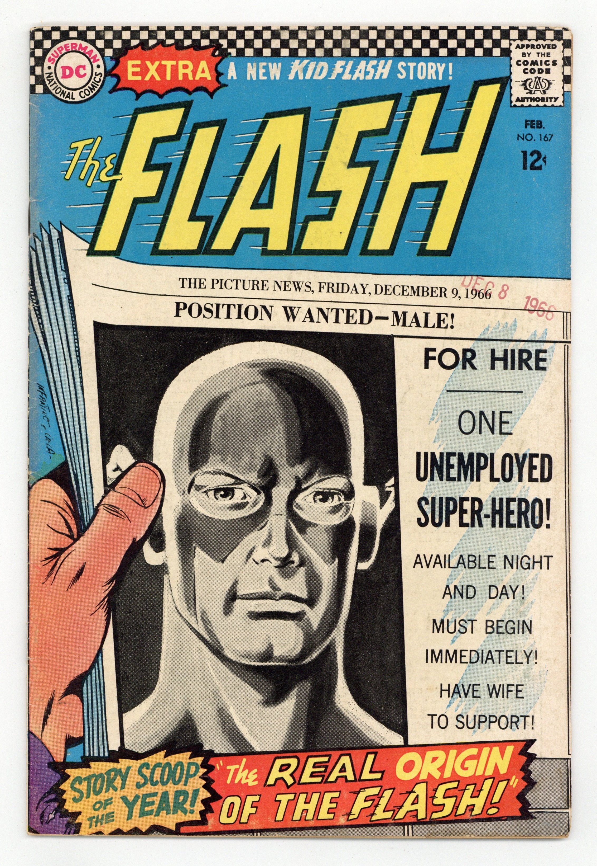 Tags: Print Run Statistics$16.75Cover pencils by Carmine Infantino, inks by Joe Giella. The Real Origin of the Flash!, script by Gardner Fox, pencils by Carmine Infantino, inks by Sid Greene; The Real Origin of the Flash; Sheds new light on the origin of the Flash by showing that a goofy angel (?) was behind the whole thing(??); this is the famous Mopee issue that was quickly rejected from Flash continuity. Batman 189 ad. Caps Hobby Hints strip by Henry Boltinoff. The Hypnotic Super-Speedster starring Kid Flash, script by Gardner Fox, pencils by Carmine Infantino, inks by Sid Greene; a hypnotist at Wallys school orders a kid to run around the world. Letter from super fan Peter Sanderson, Jr. G.I. Joe Club ad. 36 Pages, Full Color. Cover price $0.12.