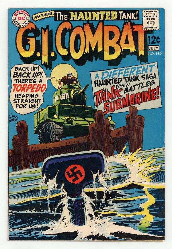 Last 12c cover-priced issue. Cover by Joe Kubert. Written by Robert Kanigher and Howard Liss. Art by Ross Andru, Joe Kubert, Ed Robbins, Fred Ray and Mike Esposito. There's a torpedo heading straight for the Haunted Tank! It's a different Haunted Tank saga when tank battles submarine in "Kill Now - Pay Later" by Robert Kanigher, Ross Andru, Joe Kubert and Mike Esposito. Plus: "No-Name Hill" by Kanigher and Ed Robbins. And: "The 13th Bullet" by Howard Liss and Fred Ray. 36 Pages, Full Color. Cover price $0.15.
