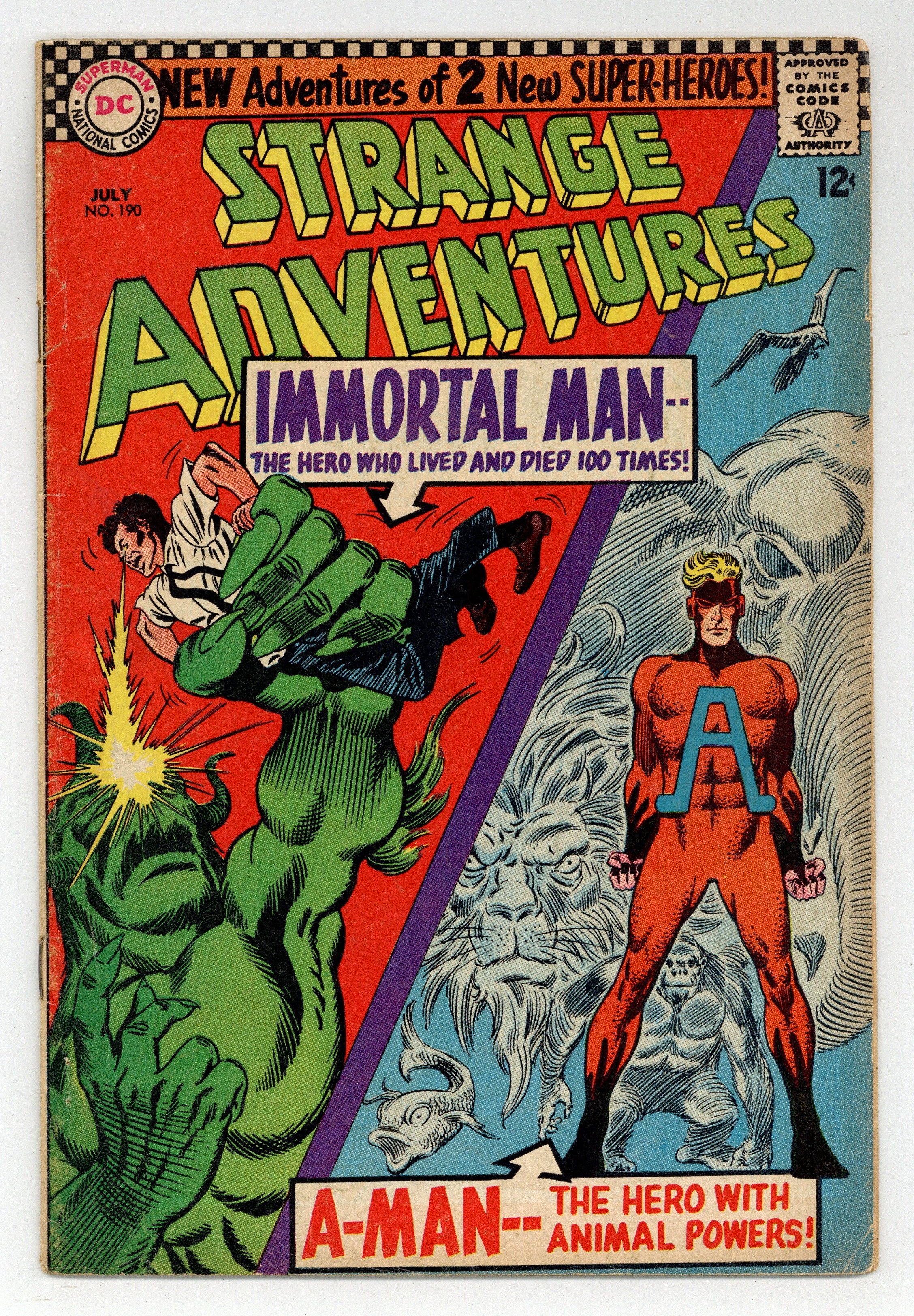 First appearance of Animal Man in costume in "A-Man--the Hero With the Animal Powers" (pencils by Carmine Infantino); and "Immortal Man." Statement of ownership--average print run 313,000; average paid circulation 187,000. 36 Pages, Full Color. Cover price $0.12.