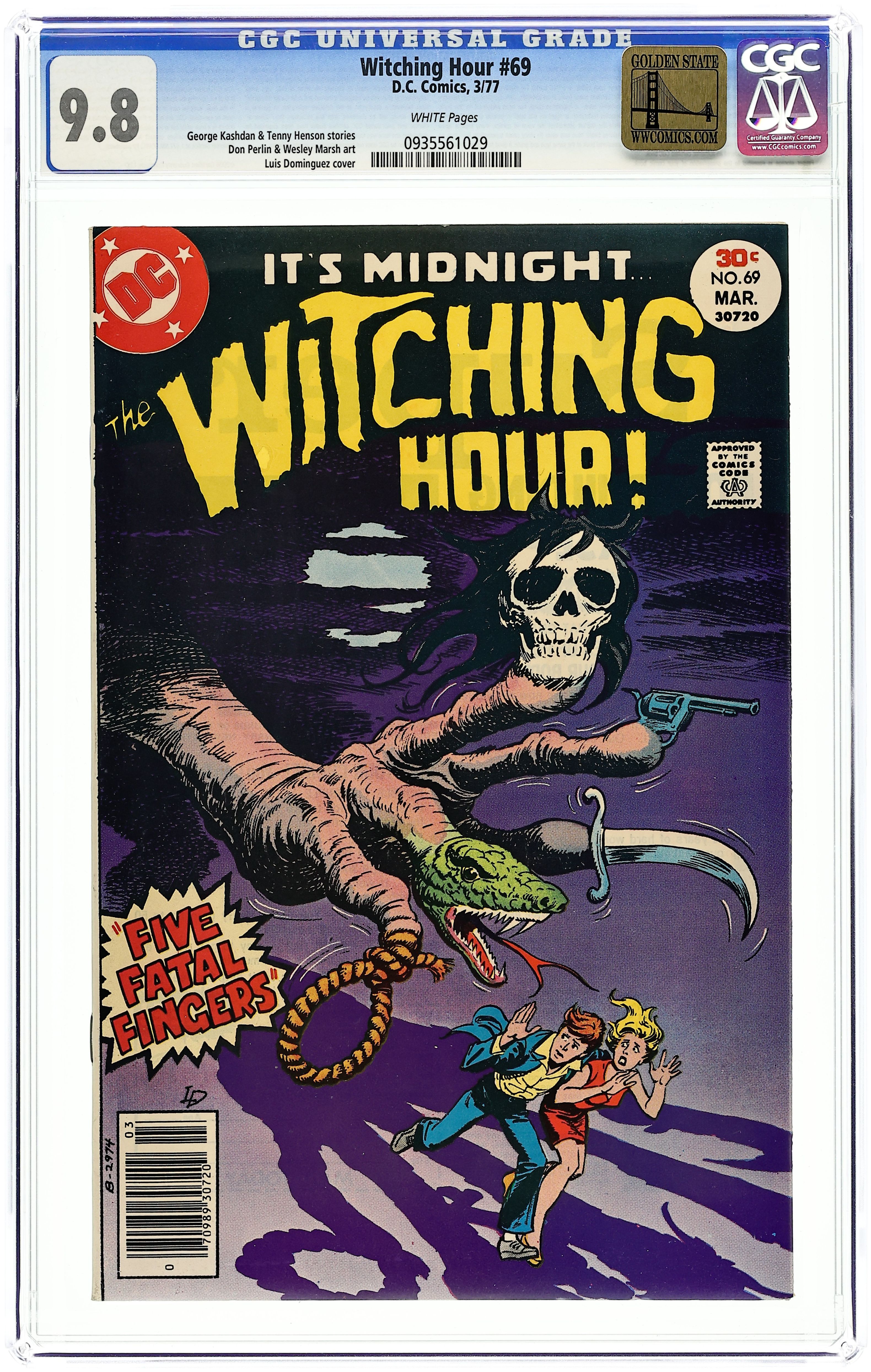 Featuring: 1 page The Witching Hour introductory story starring Mordred, Cynthia and Mildred, drawn by E.R. Cruz; 8 page story "Five Fatal Fingers" written by George Kashdan and drawn by Don Perlin; 4 page story "The Captain's Curse"; 4 page story "The Girl Who Grew Younger" written by Murray Boltinoff (as Wesley Marsh) and pencilled by Tenny Henson. Cover by Luis Dominguez. 36 Pages, Full Color. Cover price $0.30.