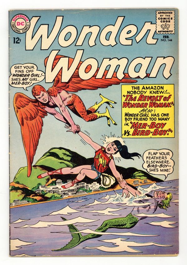 Cover pencils by Ross Andru, inks by Mike Esposito. "Revolt of Wonder Woman," script by Robert Kanigher, pencils by Ross Andru, inks by Mike Esposito; Wonder Woman, exhausted by the many demands upon her and disheartened by peoples perception of her as a "fighting machine," succumbs to despair, wishing she could find someone who appreciates her for herself. Special Christmas Quiz - "Christmas in Many Lands!" by Jack Schiff, art by Ruben Moreira. "Mer-Boy vs Bird-Boy," script by Robert Kanigher, pencils by Ross Andru, inks by Mike Esposito; Mer-Boy and Bird-Boy compete for the hand of Wonder Girl by defeating threats to Paradise Island. 36 pages, Full Color. Cover price $0.12.