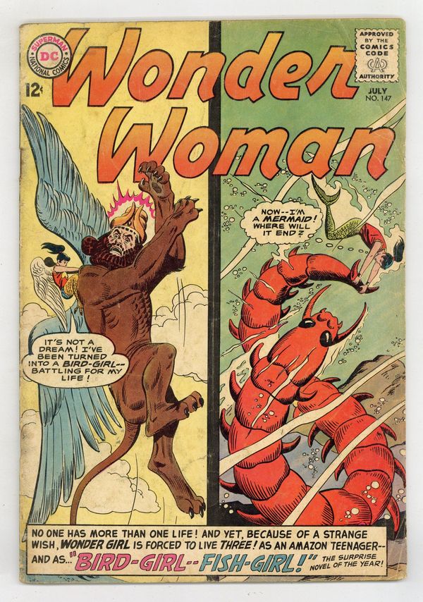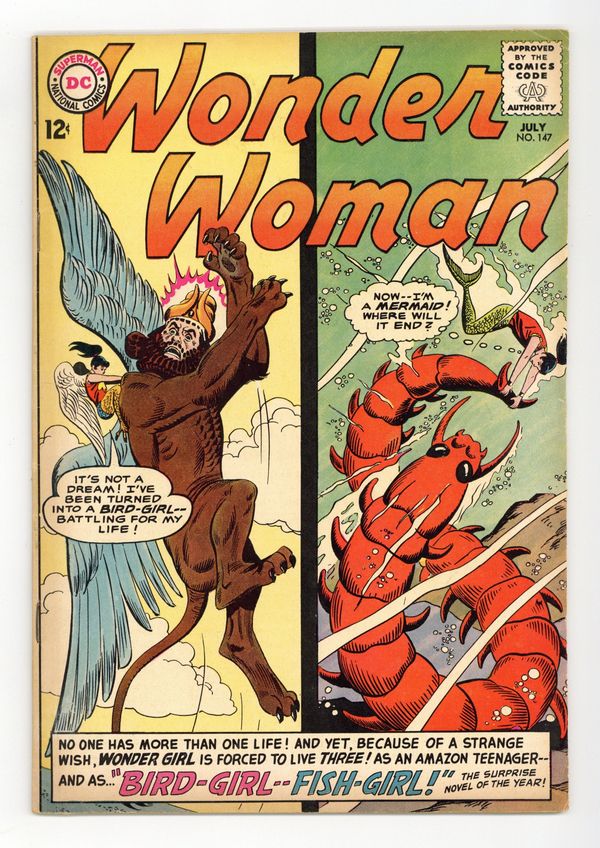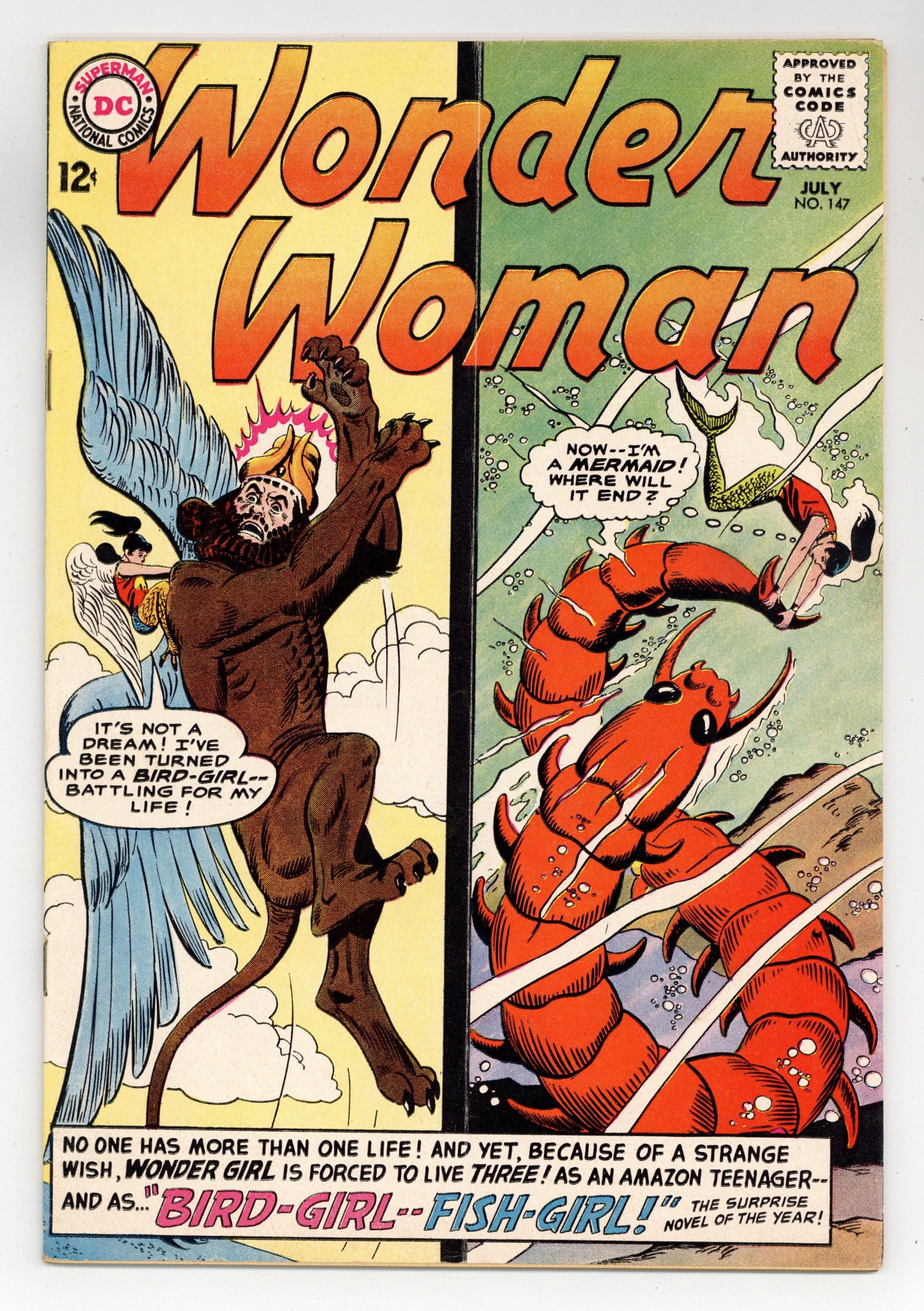 Cover pencils by Ross Andru, inks by Mike Esposito. "Bird-Girl - Fish-Girl!", script by Robert Kanigher, pencils by Ross Andru, inks by Mike Esposito; Mer-Boy hitches an airborne ride with Bird-Boy, both of whom keep from touching Paradise Island as they watch Wonder Girl pass a battery of tests implemented by the "goddess" Athena. As a reward, Athena dubs Wonder Girl a true Amazon, and tells her she will grant the first request made of her; Mer-Boy and Bird-Boy make their requests simultaneously, wishing that Wonder Girl be turned into a mermaid or a bird-girl so that she can spend all her time with one of them; Wonder Girl cannot decide which she will choose, so Athena chooses for her, giving her wings and bird-like legs to go first with Bird-Boy; Wonder Girl meets Bird-Boys parents and friends, but finds she has no taste for worm pie or birdseed pizza; She fights off a flying Sphinx, but tells Athena she was not meant to be a bird-girl; Next, she is transformed into a mermaid, and accompanies Mer-Boy, only to find that she is "a fish out of water," despite defeating a giant centipede. Rocky and Bullwinkle star in a one-page Cheerios ad. 36 pages, Full Color. Cover price $0.12.