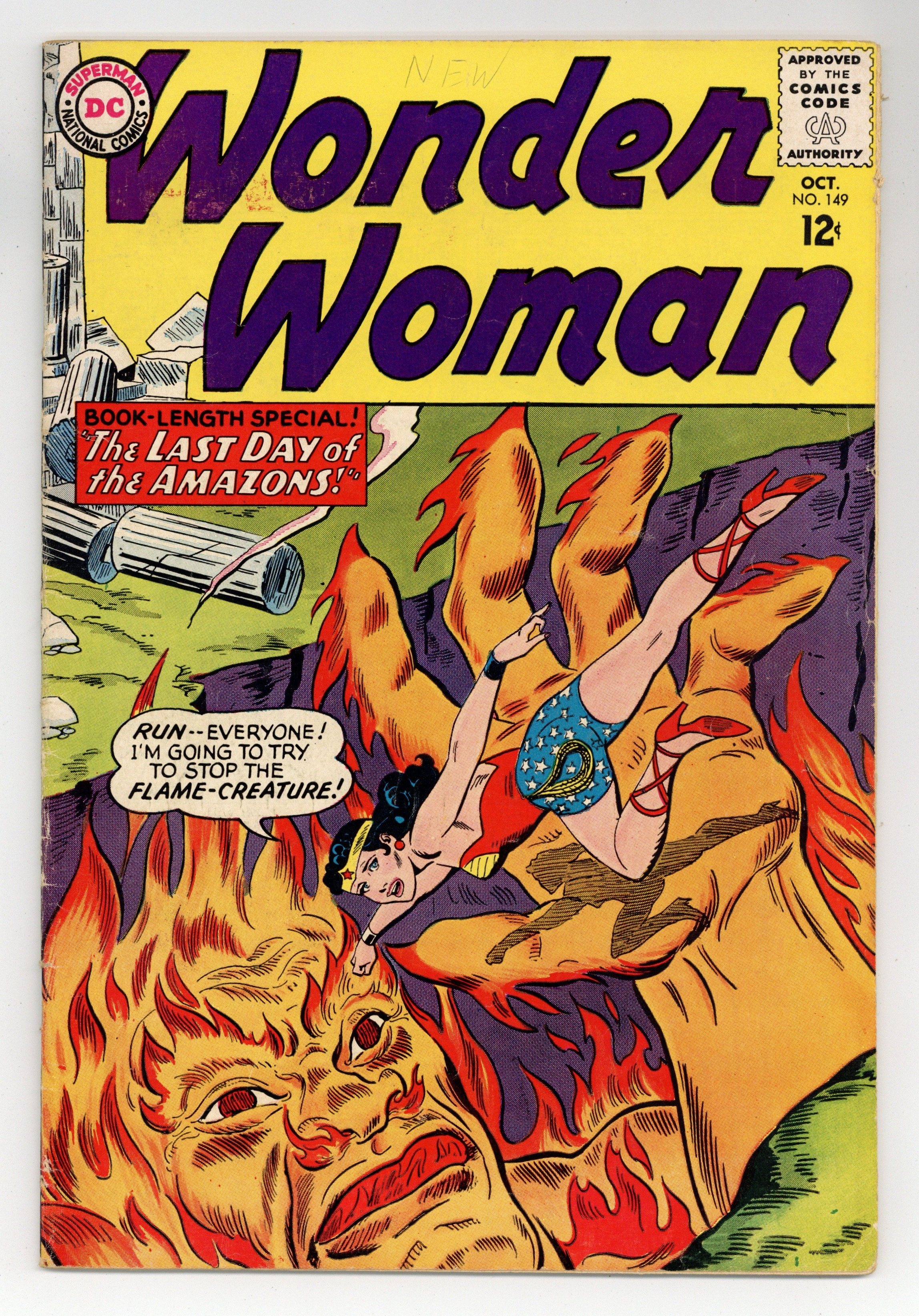 Cover pencils by Ross Andru, inks by Mike Esposito. Smoking is for Squares! public service announcement. The Wonder Woman family (Wonder Woman, Wonder Girl, Wonder Tot, and Wonder Queen) in an "impossible tale," "The Last Day of the Amazons!", script by Robert Kanigher, pencils by Ross Andru, inks by Mike Esposito; Queen Hippolyta continues to long for the prince she once loved; She calls upon Athena to help her fashion a statue in his image; When the image is brought to life, the presence of a man on Paradise Island threatens to doom the island and everyone on it; Aphrodites jealousy, because Hippolyta did not call on her for matters of the heart, does not help matters. 36 pages, Full Color. Cover price $0.12.