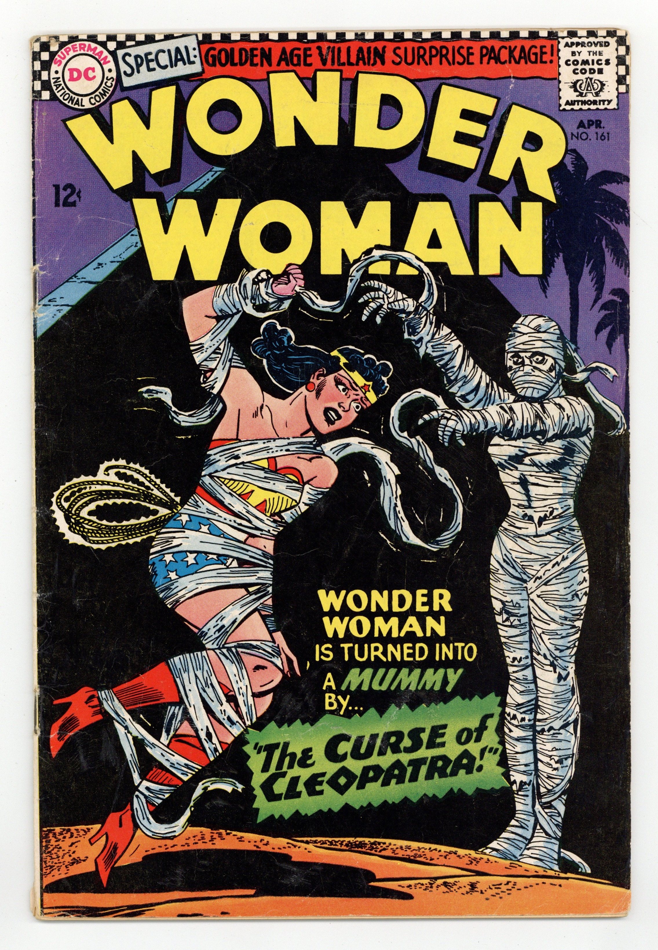 Cover pencils by Ross Andru, inks by Mike Esposito. "The Curse of Cleopatra," script by Robert Kanigher, pencils by Ross Andru, inks by Mike Esposito; When Countess Draska Nishki comes to Lt. Diana Princes office and offers her services as a spy for hire, Diana rebuffs her, and is tossed around the room by the judo-trained spy; Later, Wonder Woman and Steve Trevor are witness to a "war" between two rival movie studios, each turning out a Cleopatra epic; Magnum Magnus of Magnus Pictures contacts them and asks them to play the parts of Cleopatra and Mark Antony, because the actor and actress who were originally essaying those parts have fallen into catatonia. "Battle Inside of a Brain," script by Robert Kanigher, pencils by Ross Andru, inks by Mike Esposito; Wonder Woman is asked by Gen. Darnell to make sure Steve Trevor gets to the Pentagon safely with info on a new rocket plane he has tested; On the way, they are stopped and overcome by the Angle Man and his gang. Letter to the editor from writer/producer Mike Uslan. 36 pages, Full Color. Cover price $0.12.