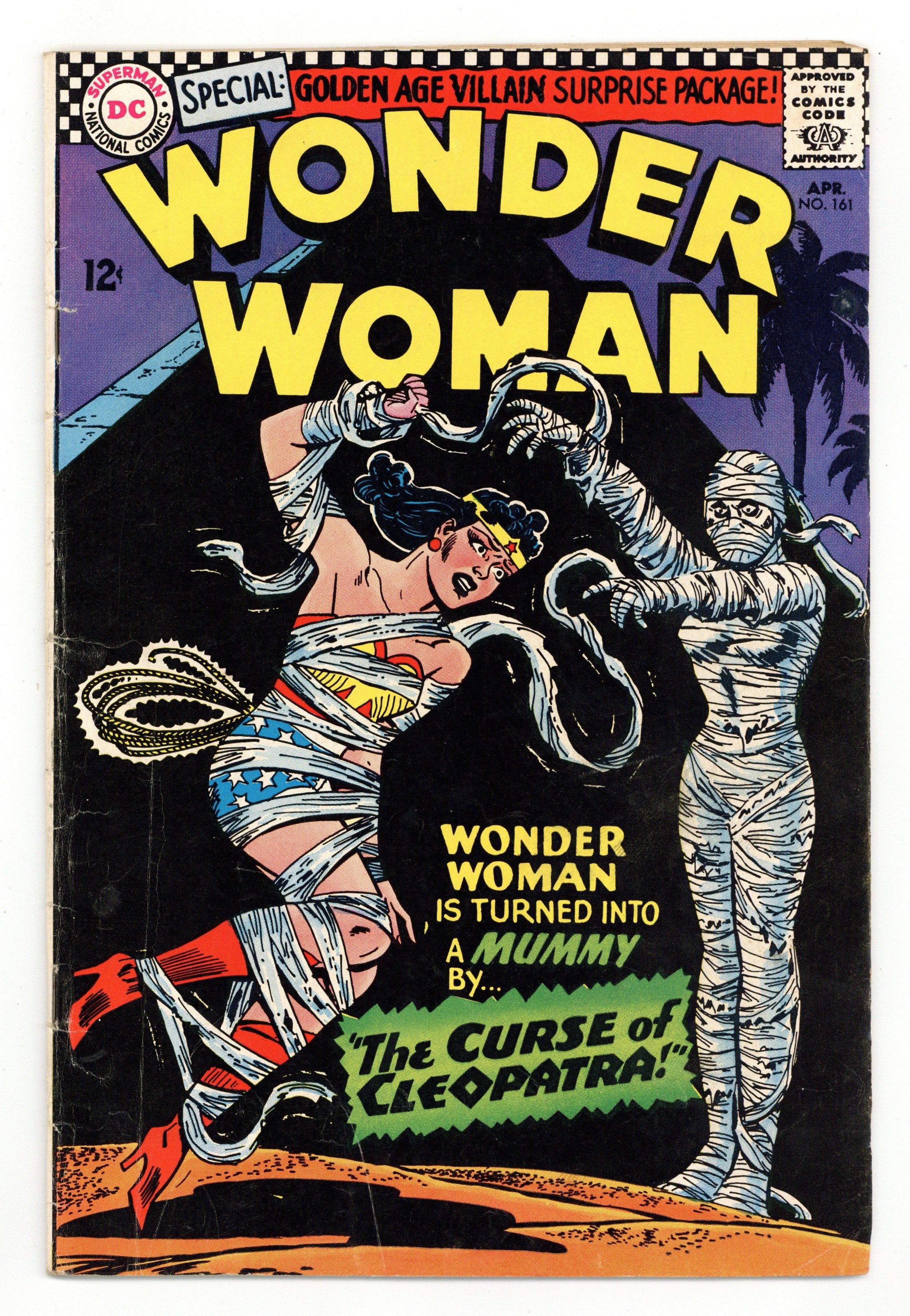 Tags: Wonder Woman$37.50Cover pencils by Ross Andru, inks by Mike Esposito. "The Curse of Cleopatra," script by Robert Kanigher, pencils by Ross Andru, inks by Mike Esposito; When Countess Draska Nishki comes to Lt. Diana Princes office and offers her services as a spy for hire, Diana rebuffs her, and is tossed around the room by the judo-trained spy; Later, Wonder Woman and Steve Trevor are witness to a "war" between two rival movie studios, each turning out a Cleopatra epic; Magnum Magnus of Magnus Pictures contacts them and asks them to play the parts of Cleopatra and Mark Antony, because the actor and actress who were originally essaying those parts have fallen into catatonia. "Battle Inside of a Brain," script by Robert Kanigher, pencils by Ross Andru, inks by Mike Esposito; Wonder Woman is asked by Gen. Darnell to make sure Steve Trevor gets to the Pentagon safely with info on a new rocket plane he has tested; On the way, they are stopped and overcome by the Angle Man and his gang. Letter to the editor from writer/producer Mike Uslan. 36 pages, Full Color. Cover price $0.12.
