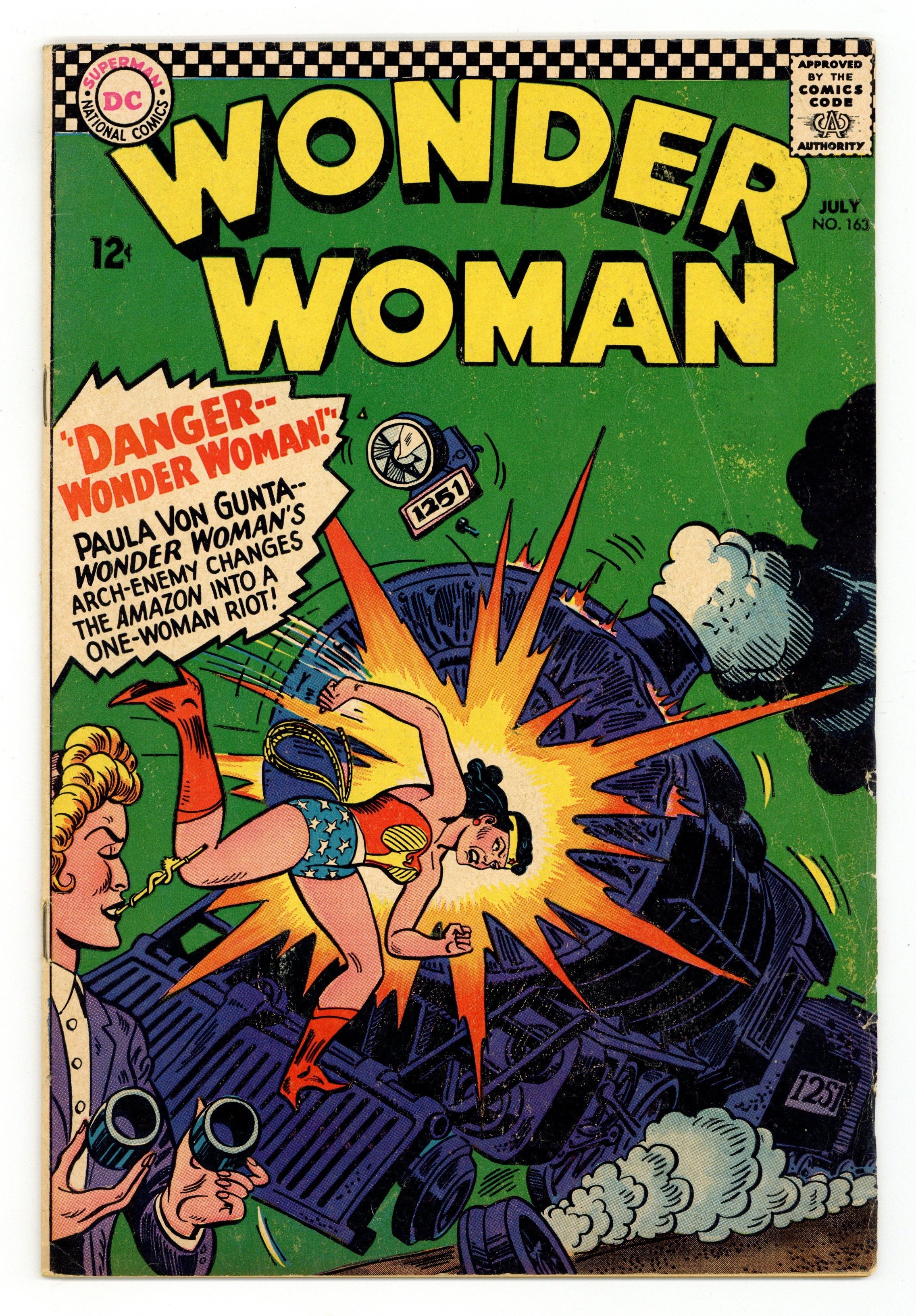Tags: Print Run Statistics$40.00Cover pencils by Ross Andru, inks by Mike Esposito. "Giganta - the Gorilla Girl," script by Robert Kanigher, pencils by Ross Andru, inks by Mike Esposito; When Dr. Psycho notices Diana Prince and Steve Trevor near the cage of Giganta, a female gorilla, he decides to victimize Wonder Woman by hypnotizing Giganta into falling in love with Steve Trevor; The gorilla grabs Steve and, when Diana changes into Wonder Woman, overpowers the heroine, but falls victim to the Magic Lasso; A Professor Zool appears on the scene, asking that the gorilla be turned over to him for evolutionary experimentation, and Psycho decides to capitalize on it. "Danger - Wonder Woman," script by Robert Kanigher, pencils by Ross Andru, inks by Mike Esposito; While pulling a jewel robbery with her gang, female criminal Paula Von Gunta sees Wonder Woman walking by with Steve, unaware of the crime being pulled off, and becomes infatuated with Major Trevor. Letter to the editor from Irene Vartanoff. Statement of ownership - average print run 346,000; average paid circulation 209,918. 36 pages, Full Color. Cover price $0.12.