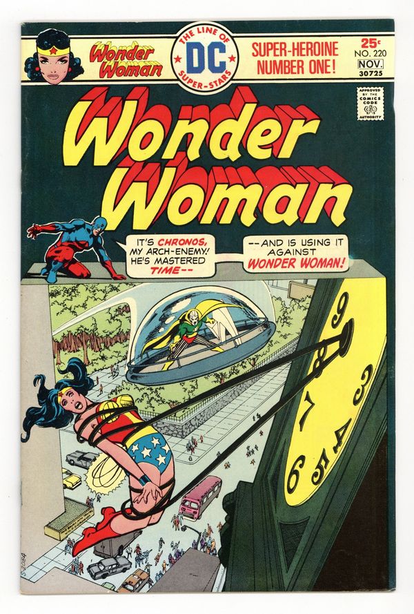 Cover pencils by Dick Giordano, inks by Dick Giordano and Terry Austin. "The Man Who Wiped Out Time!", script by Martin Pasko, art by Dick Giordano, Neal Adams, and Terry Austin; Atom and Hawkman compete to observe Wonder Woman's 10th mission, with Atom apparently winning, as he observes Diana's battle against Chronos. Brief Justice League of America appearance. Captain Marvel stars in a one-page Hostess ad, "Minerva Menace!" 36 pages, Full Color. Cover price $0.25.