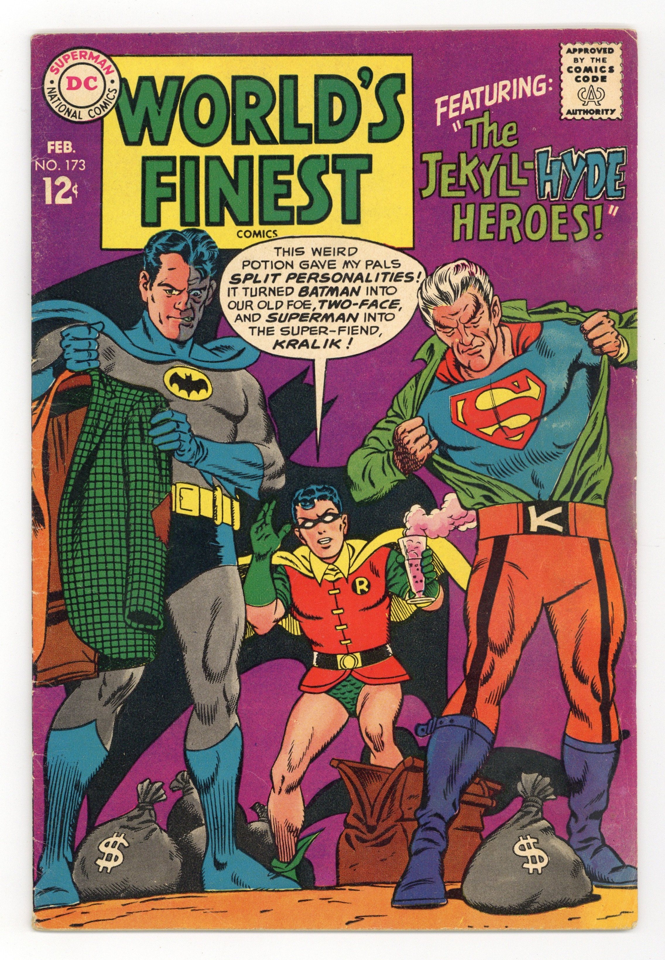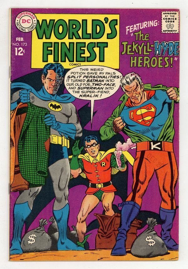 1st Silver Age appearance of Two-Face. Cover pencils by Curt Swan, inks by George Klein. The Jekyll-Hyde Heroes starring Superman and Batman, script by Jim Shooter, pencils by Curt Swan, inks by George Klein; Dr. Arron's Psyche-Distortor chemicals cause complete character reversal in Superman and Batman, turning them into their own worst enemies. The Super-Key to Fort Superman--Editors' Round Table: Superman, script by Jerry Coleman, pencils by Wayne Boring, inks by Stan Kaye; Someone has broken into Superman's Fortress of Solitude, so Superman searches the place for clues. Half-page ad with Neal Adams's pencils for the cover of Lois Lane 81. 36 Pages, Full Color. Cover price $0.12.