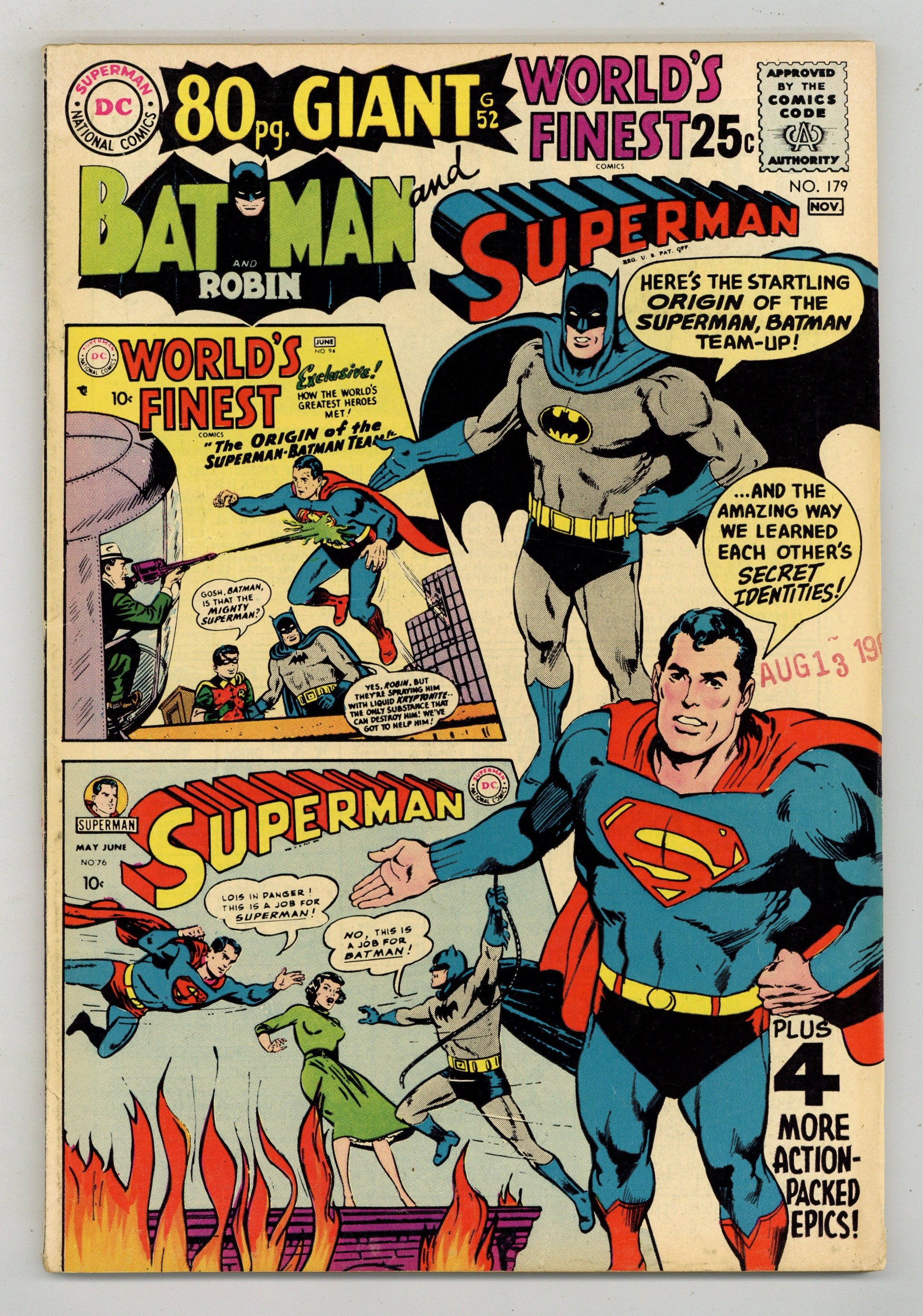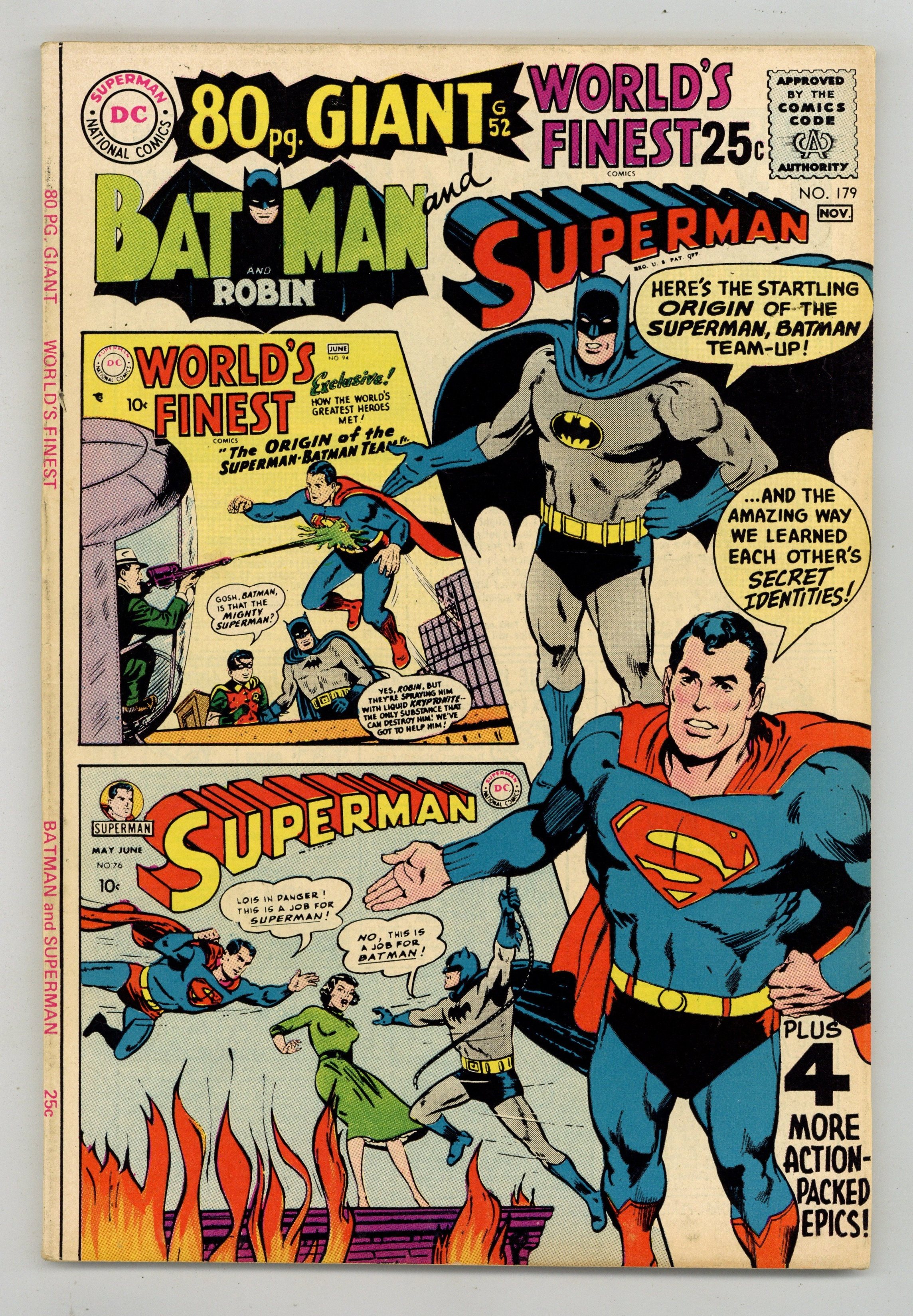 Cover pencils by Neal Adams, Curt Swan, and Win Mortimer, inks by Neal Adams, Stan Kaye, and Win Mortimer. The Origin of the Superman-Batman Team starring Superman and Batman, script by Edmond Hamilton, pencils by Dick Sprang, inks by Stan Kaye; When Batman learns Lex Luthor has kryptonite, he goes to Metropolis to warn Superman. The Mightiest Team in the World, script by Edmond Hamilton, pencils by Curt Swan , inks by Stan Kaye (1-8) and John Fischetti (9-12); Superman and Batman learn each other's IDs while sharing a cabin during an ocean voyage. Batman--Double for Superman, script by Alvin Schwartz, pencils by Curt Swan, inks by Stan Kaye. When Gotham City Challenged Metropolis starring Superman and Batman, script by Edmond Hamilton, pencils by Curt Swan, inks by Stan Kaye. The Dictator of Kandor, script by Bill Finger, pencils by Dick Sprang, inks by Stan Kaye. The Club of Heroes, script by Edmond Hamilton, pencils by Dick Sprang, inks by Stan Kaye. 84 Pages, Full Color. Cover price $0.25.