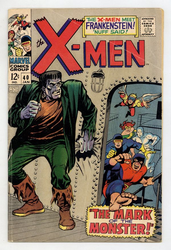 Cover art by George Tuska. The Mark of the Monster!, script by Roy Thomas, pencils by Don Heck, inks by George Tuska; the X-Men battle the Frankenstein monster, who is revealed SPOILER WARNING to be an android. The First Evil Mutant!--The Origins of the Uncanny X-Men, script by Roy Thomas, pencils by Werner Roth, inks by John Verpoorten; the origin of Jack ODiamond; Cyclops origin continued. 36 pgs. $0.12. Cover price $0.12.