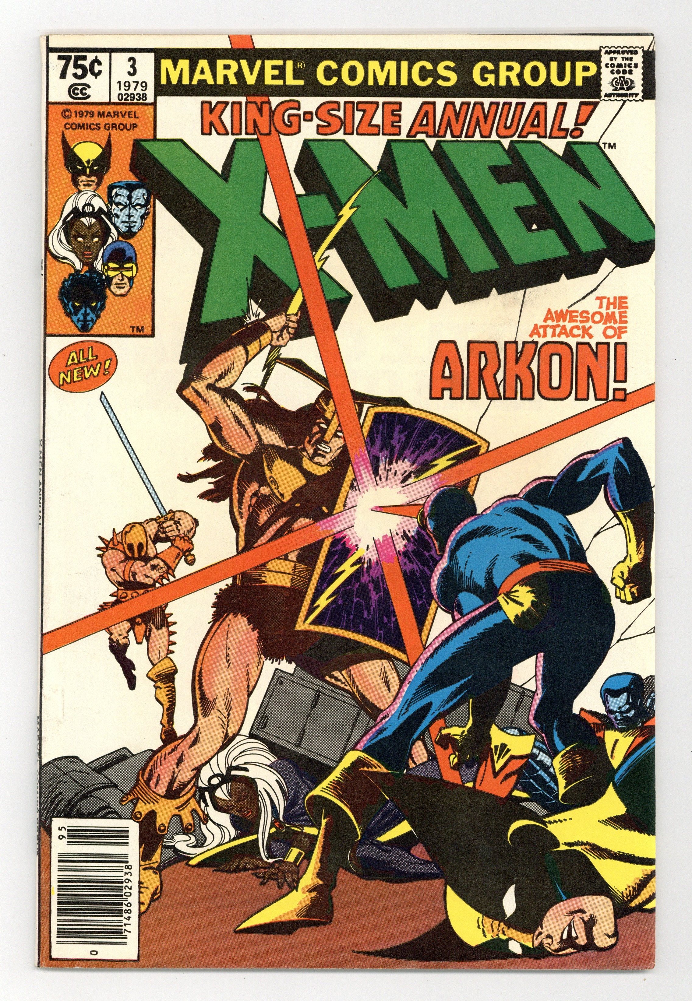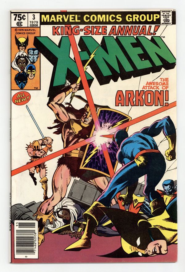 Direct Edition. A Fire in the Sky! - Written by Chris Claremont. Art by George Pérez and Terry Austin. Cover by Frank Miller and Terry Austin. The X-Men battle Arkon and are transported to his world where they are asked to help save it. Story takes place between Uncanny X-Men (1963 1st Series) #124 and 125. Characters in this issue: X-Men [Cyclops; Storm; Wolverine; Colossus; Nightcrawler; Banshee]; Edwin Jarvis; VILLAINS: Arkon; Imperions; CAMEO FLASHBACK: Captain America [Steve Rogers]; Thor; Iron Man [Tony Stark]. 52 pages, full color. Cover price $0.75.