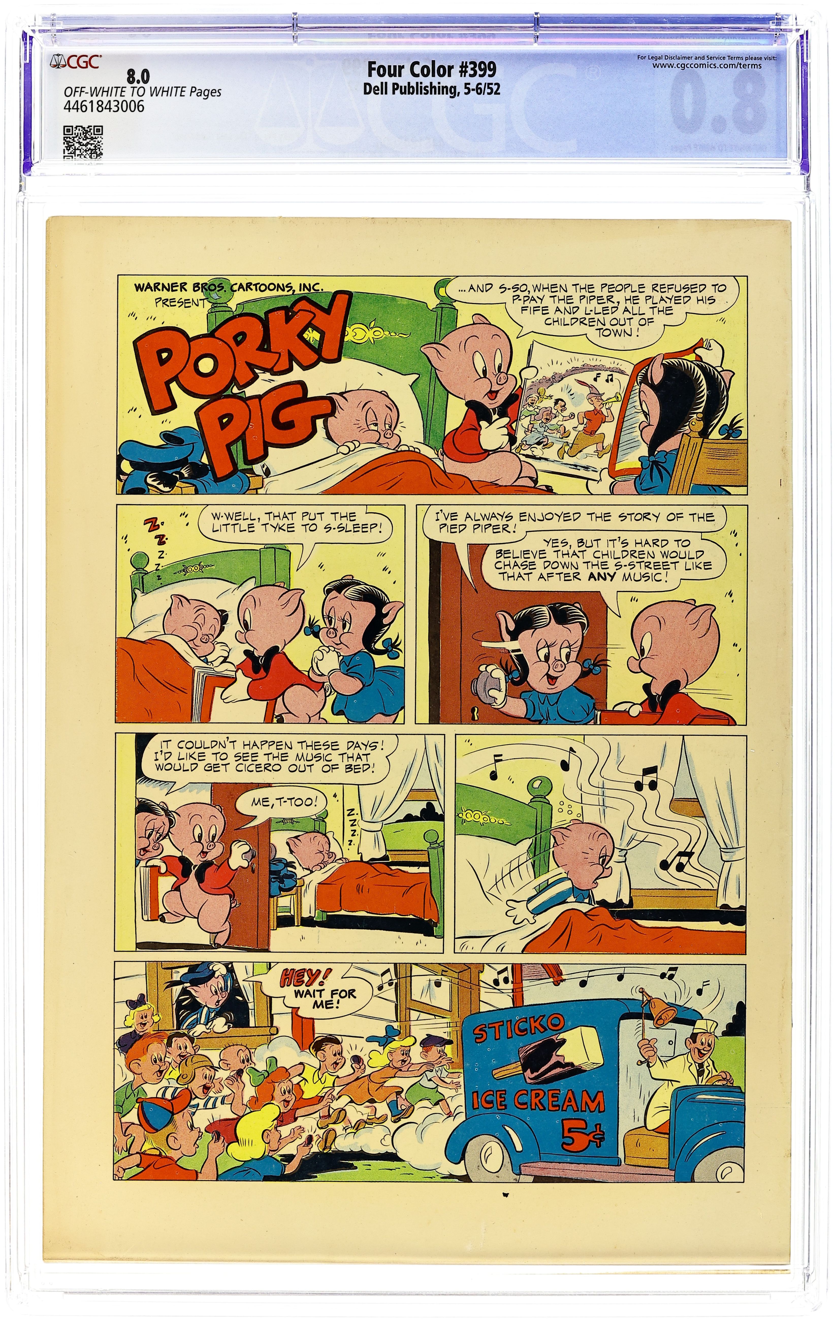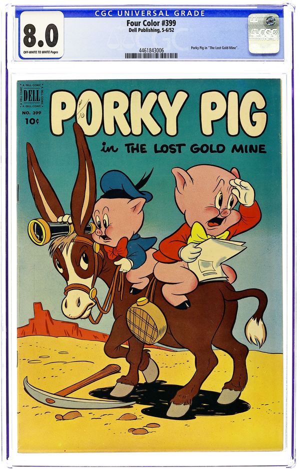 Indicia title is "PORKY PIG in THE LOST GOLD MINE, No. 399." Cover art by Ralph Heimdahl. The Lost Gold Mine, art by Tony Strobl; On Bugs' advice, Porky and Cicero go to Tumbleweed Springs to hunt wild flowers for Cicero's school assignment, but the pair set off a gold rush when they find what appears to be an old mine shaft. Harry Hog, the Bully, art by John Carey; Sylvester tries to teach Porky how to box so that he can stand up to Harry Hog, the local bully. A Great Dane for Cicero, art by John Carey; Porky gets Cicero a Great Dane from the dog pound for his birthday. 36 pages, full color. Cover price $0.10.