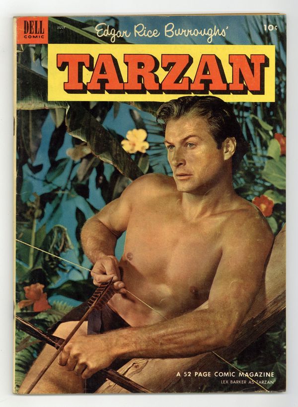 Lex Barker photo cover. "Tarzan Defends a City," script by Gaylord Du Bois, art by Jesse Marsh; Returning to Cathne, Tarzan and the Cathnians find the city under siege by Terribs; More help for Cathne arrives in the form of the Gallugos, looking for a new home; The siege is lifted and Tarzan helps the Gallugos select a new site for their city, with the approval of Cathnian king Jathon. "Boy Faces the Fangs of the Mamba," script by Gaylord Du Bois, art by Jesse Marsh; Ungali, the former witch doctor of the Matusis, frames Boy for the theft of King Atumbo's throne stool; Boy is kidnapped by the Matusis and forced to undergo trial by mamba; Tarzan arrives in time to take Boy's place. "Tarzan and the Treasure of the Apes," script by Gaylord Du Bois, art by Jesse Marsh; When hunters discover a mangani wearing a ruby necklace, they become obsessed with killing other mangani for jewelry; The apes had found a pirate's treasure chest and were wearing the jewelry from it; They were also fighting each other over the treasure. "Silent Journey" text story starring Mabu. "Brothers of the Spear," script by Gaylord Du Bois, art by Russ Manning; Dan-El and Natongo free Mothibi from Ulgo's guards and then capture the bulk of Ulgo's army. 52 pages, full color. Cover price $0.10.