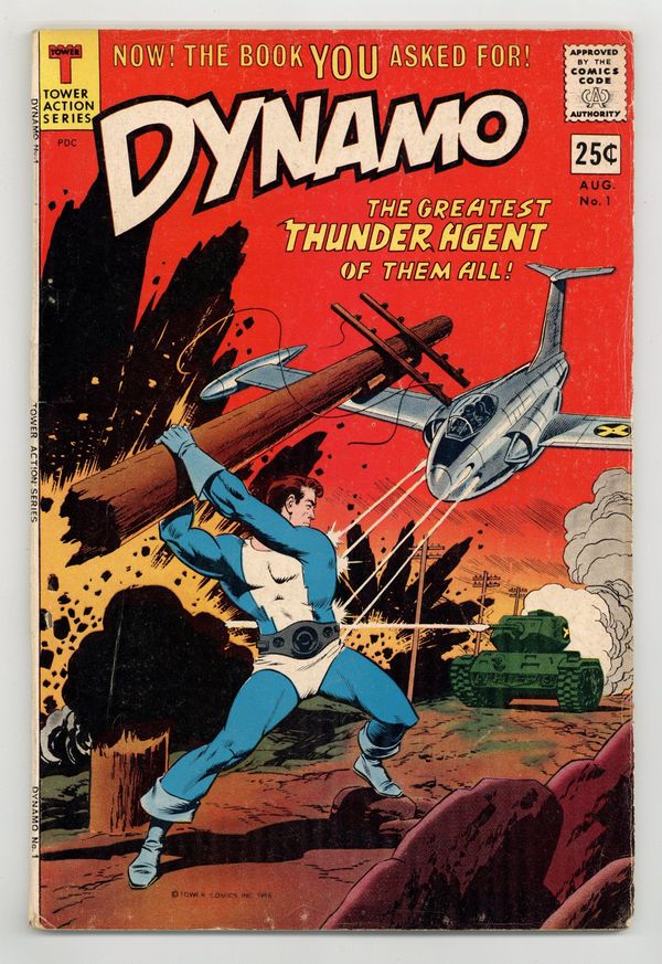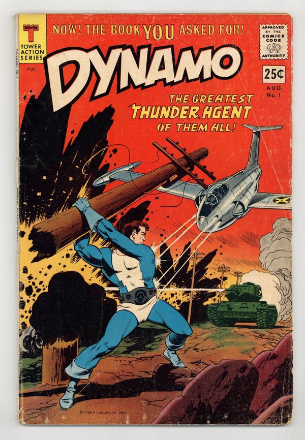 Published Aug 1966 by Tower Comics.$21.50Cover art by Wally Wood. "Menace from the Moon," art by Wally Wood; Observatories on Earth are being mysteriously destroyed; The President of the United States calls Noman and Dynamo in for a mission to investigate the suspected source of the destruction, a military base on the moon; Noman discovers a civilization living on the dark side of the moon. "A Day in the Life of Dynamo," script by Wally Wood and Tim Battersby, pencils by Mike Sekowsky, inks by Frank Giacoia; Len Brown plans on asking the Chief for a raise, but before he can get to it, adventure whisks him away; First to Hong Kong, where he is at the mercy of the Red Dragon, then to the subterranean world, where he must stop the Overlord's ambition of creating nuclear Armageddon on the surface world. "Back to the Stone Age," script by Tim Battersby, Wally Wood, and Dan Adkins, pencils by Reed Crandall, inks by Wally Wood; THUNDER makes the mistake of putting Demo in the same prison cell as Dr. Sparta; The two pool their resources, and are sprung from prison by Dr. Sparta's minion, Wilbur. "Dynamo Meets the Amazing Andor," pencils by Steve Ditko, inks by Wally Wood; The subterranean scientist Lord Uru reports on his latest project to overthrow the surface dwellers to the Overlord; His project involved raising an abandoned surface baby, and subjecting the child to treatments to control its mind and give it super-human strength. "Wonder Weed, Super Hero", art by John Giunta; Weed is an ordinary THUNDER agent with no special suit or powers, and he envies the others; Doctor Oom, a villainous master of telepathy and hypnotism, exploits Weed's envy by planting the hypnotic suggestion that he really has super-powers. 68 pgs., full color. Cover price $0.25.