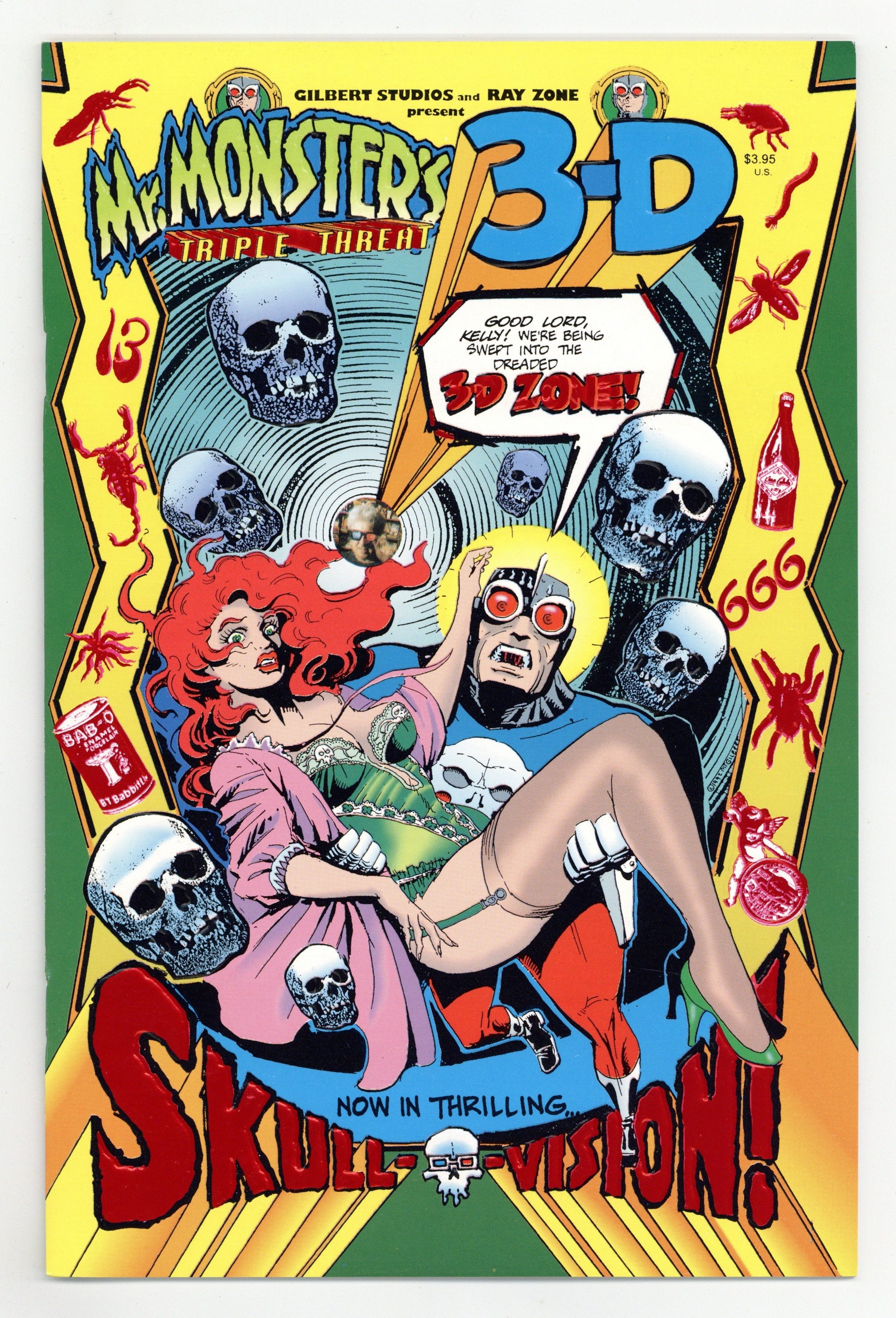 Stories and art by Michael T. Gilbert, Alan Moore, Dave Stevens, Tom Sutton, William Messner-Loebs, Fred Kelly, Terry Beatty, Denis Kitchen, Kim and Simon Deitch, Paul Ollswang, Brian Buniak, Jeff Bonivert, Mark Pacella, and Paul Chadwick, with 3-D effects by Ray Zone. Cover by Michael T. Gilbert. Back cover by Lyndal Ferguson. All-star 3-D hijinks with Mr. Monster, Concrete, King Kong, and Kirbayru, the Thing from the 1960s Comic Book! Plus classic Mr. Monster pages of the past, reprinted in 3-D. 32 pages, Full Color with 3-D effects. Cover price $3.95.