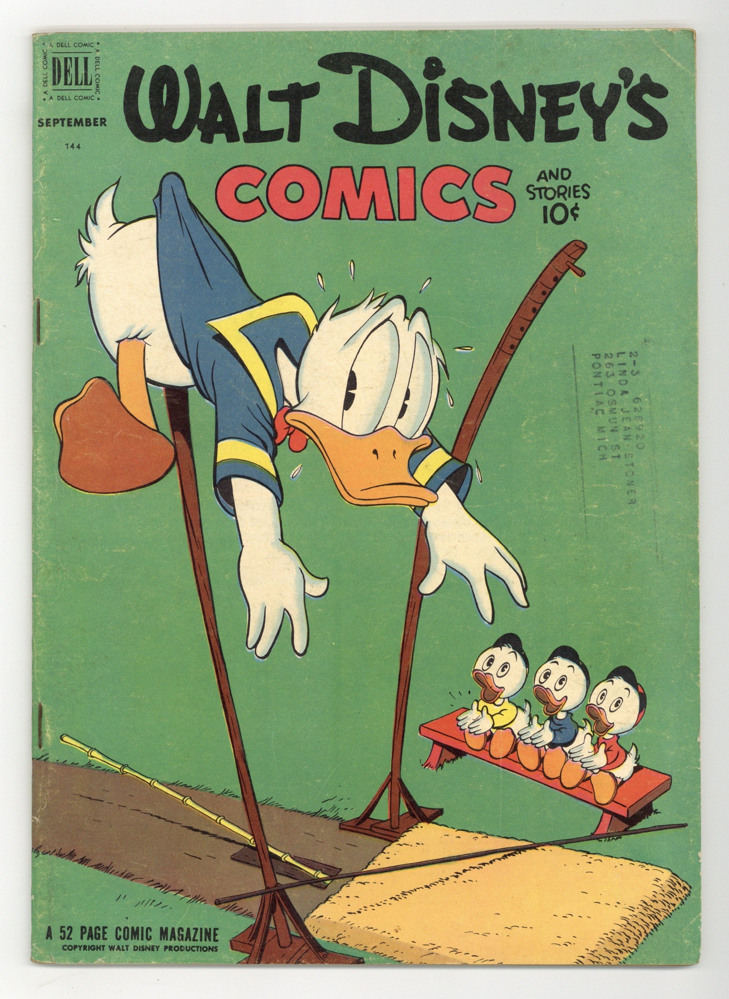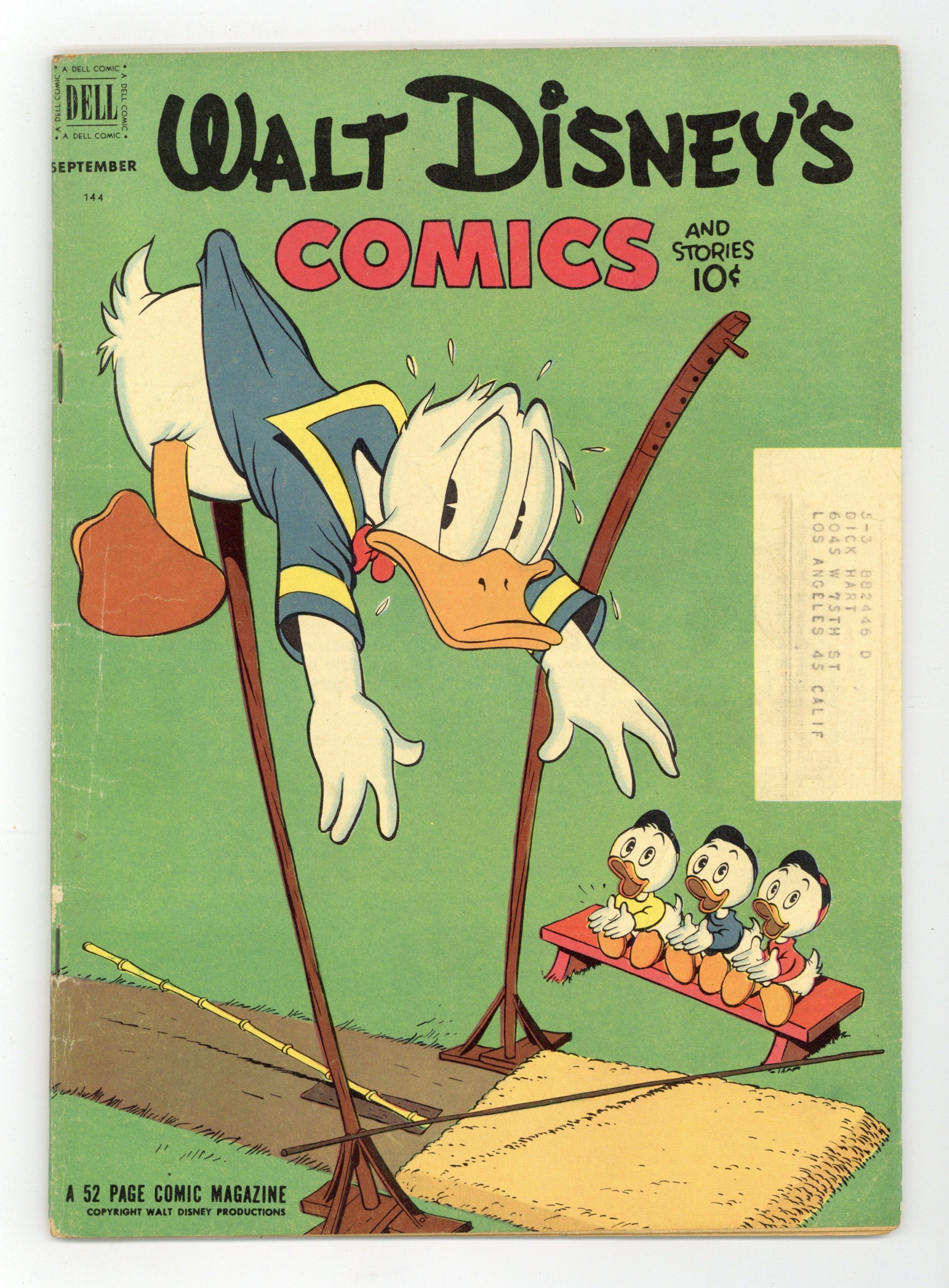 Cover by Carl Barks. Stories and art by Carl Barks, Bill Walsh, Manuel Gonzales, Bob Karp, Don Christensen, Frank McSavage, Gil Turner, Dick Hall, and Al Taliaferro. Sometimes listed as Vol. 12 #12. The long-running vehicle for Disney character comics featured art by Carl Barks, the legendary Good Duck Artist. Mickey discovers that Señora Magoola is actually his old foe Pete in disguise. In a story by Barks, Uncle Scrooge has so much money that he lets Donald and his nephews get rid of some of it. The Big Bad Wolf follows the Three Little Pigs on their beach vacation. Donald Duck; Li'l Bad Wolf; Little Hiawatha; The Picnic Puzzle; Mickey Mouse: The Mysterious Pill Plot. 48 pages, Full Color. Cover price $0.10.