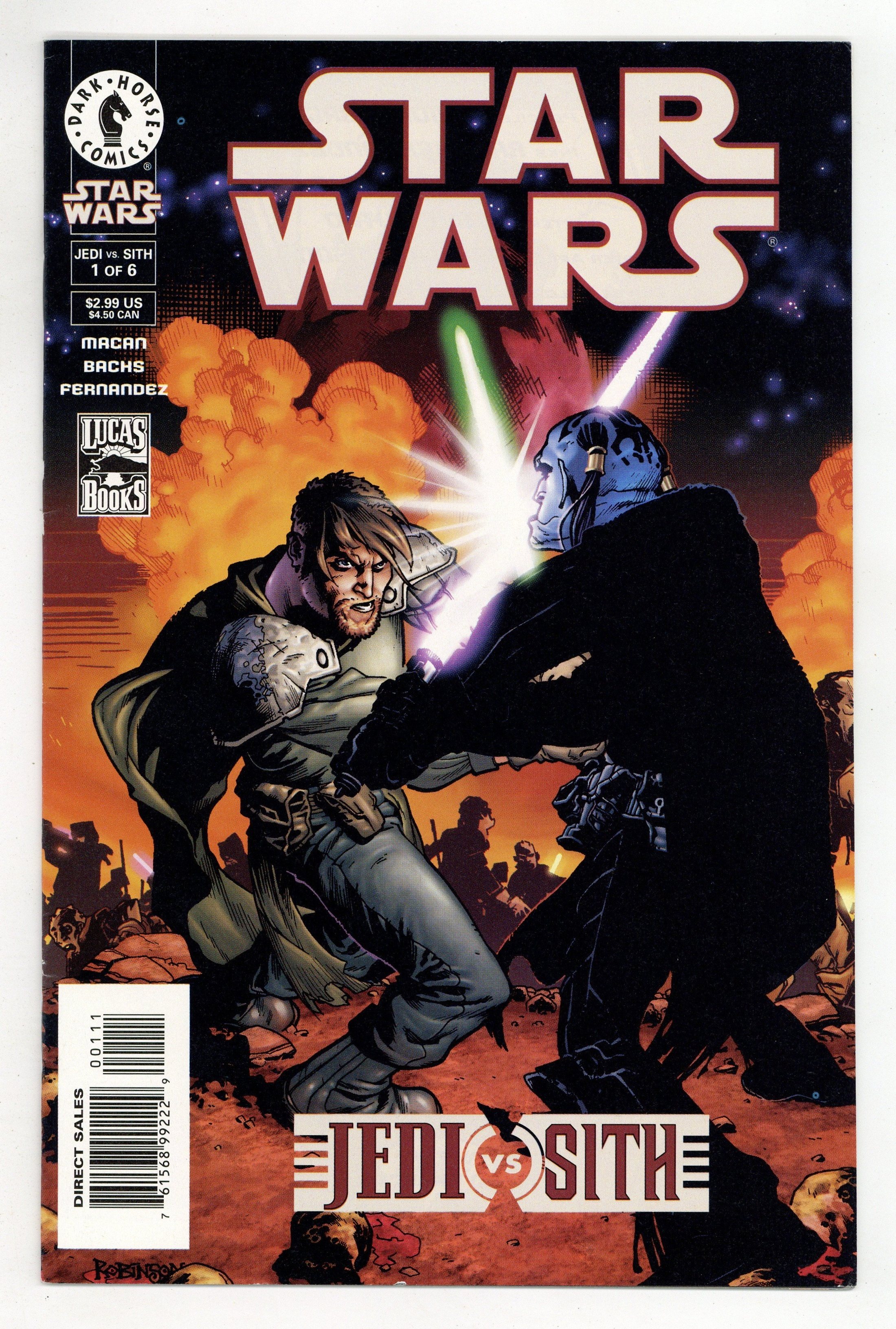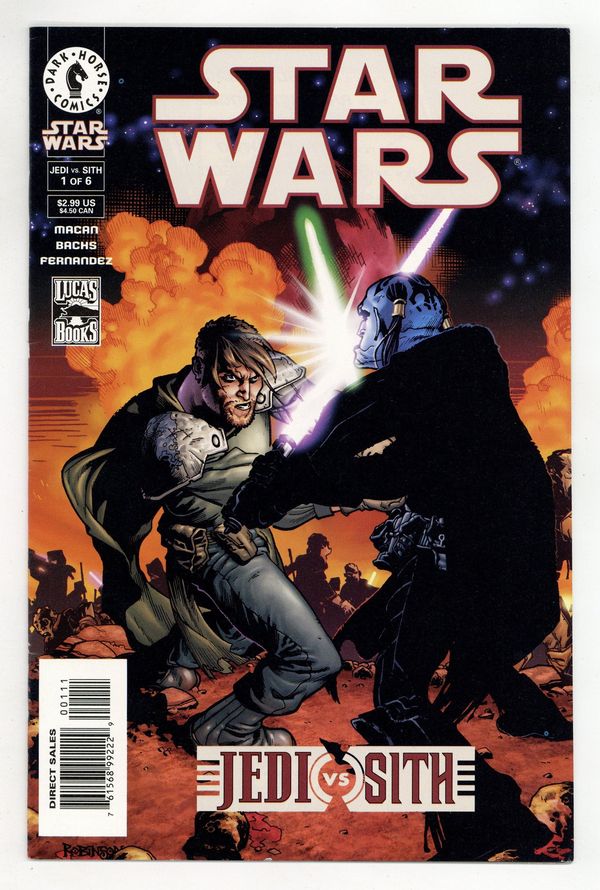 Direct Edition. Story by Darko Macan Art by Ramon F. Bachs and Raul Fernandez. Cover by Andrew Robinson. According to legend, the Sith are always two: A master and an apprentice. It was not always this way. A thousand years ago the Sith were many and they battled endlessly with the Jedi Army of Light. Lord Kaan ruled the Sith Brotherhood of Darkness and sought the destruction of Lord Hoth and his Jedi followers. Recruited into the war by a scout, three friends venture onto the battleground and march into destinies far greater and different than any of them could have ever imagined...FC, 32pg (1 of 6) . . . $2.99 Cover price $2.99.