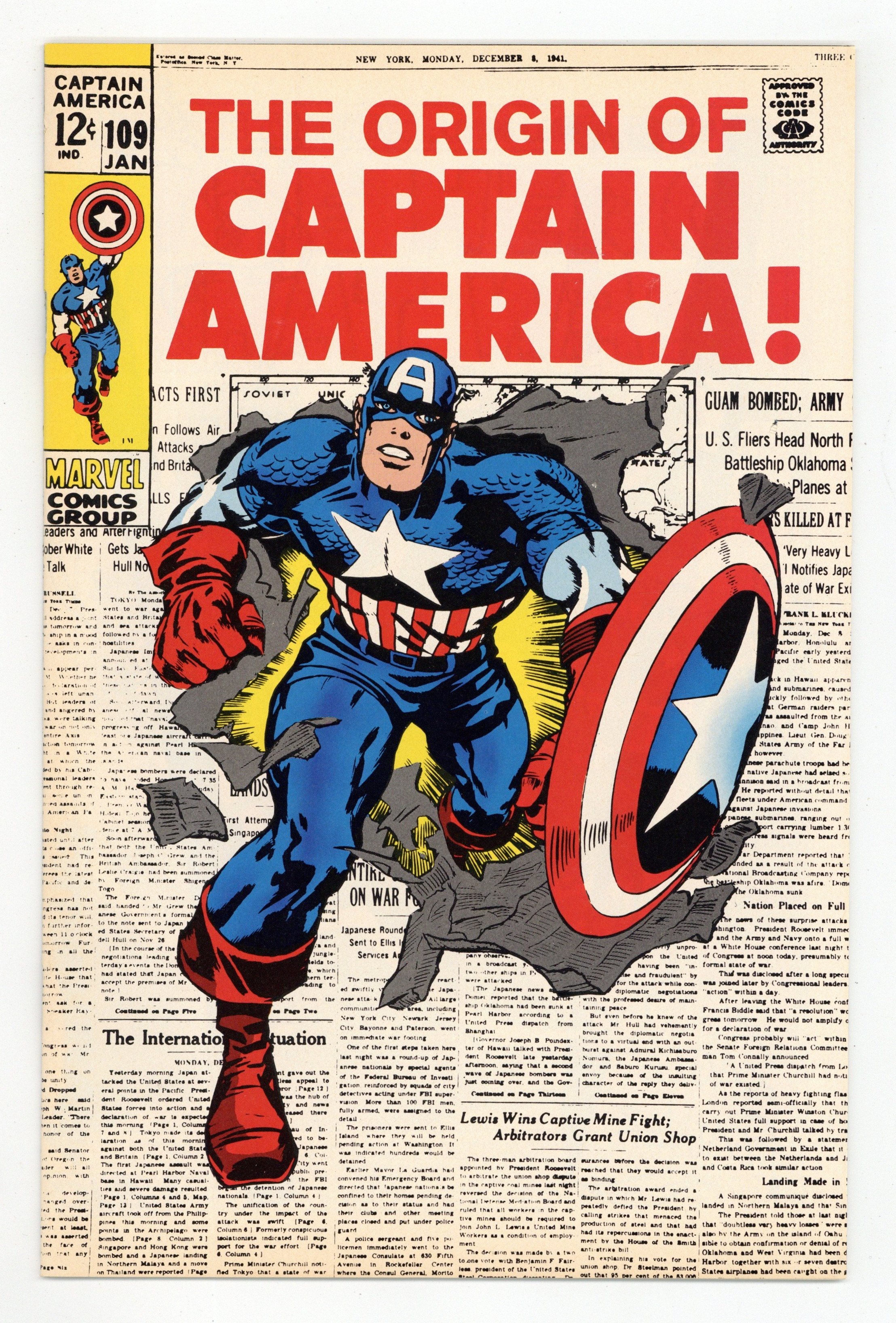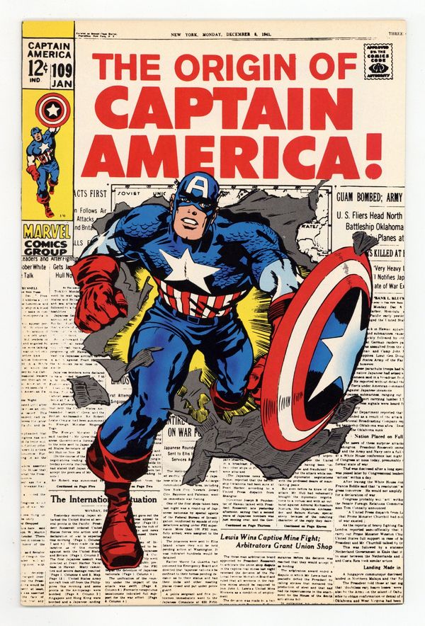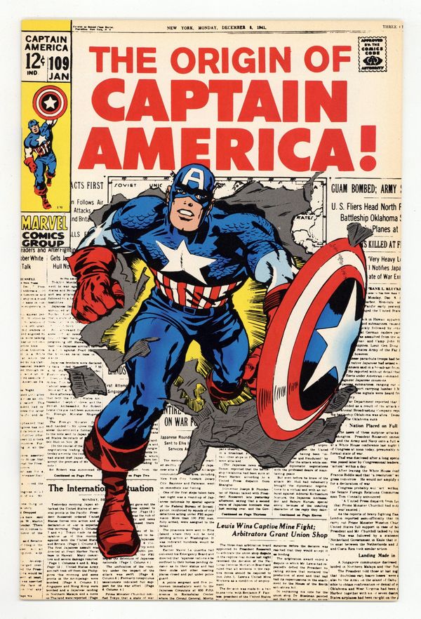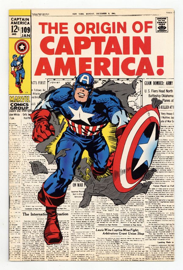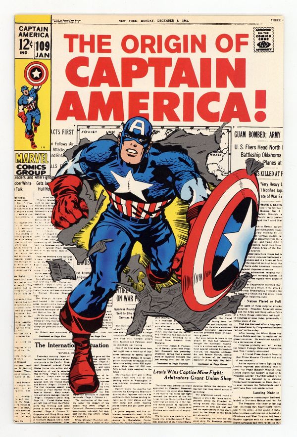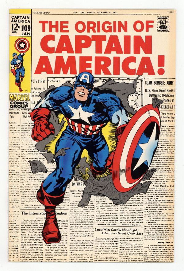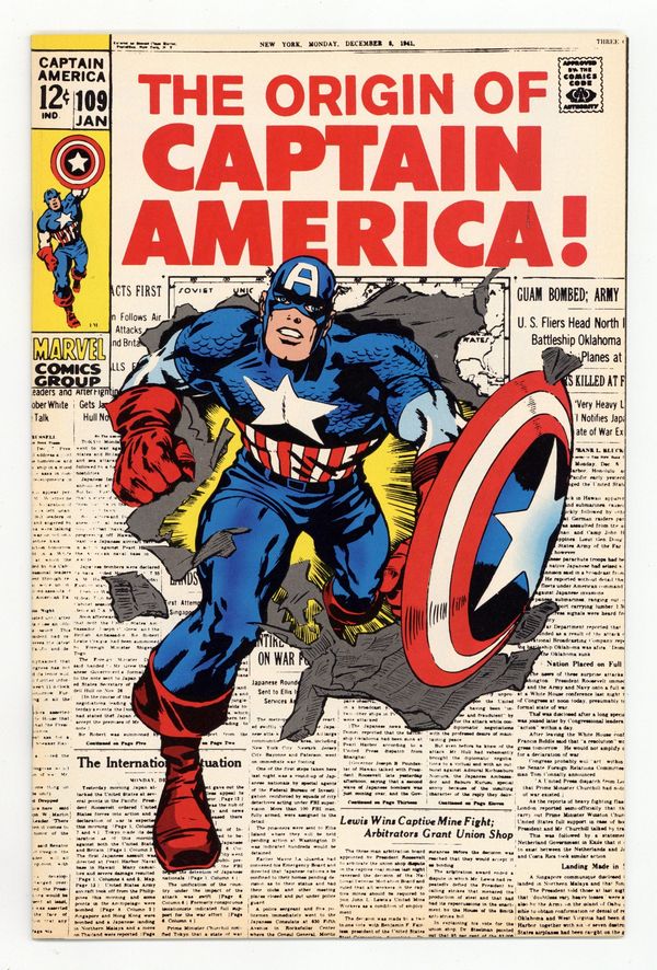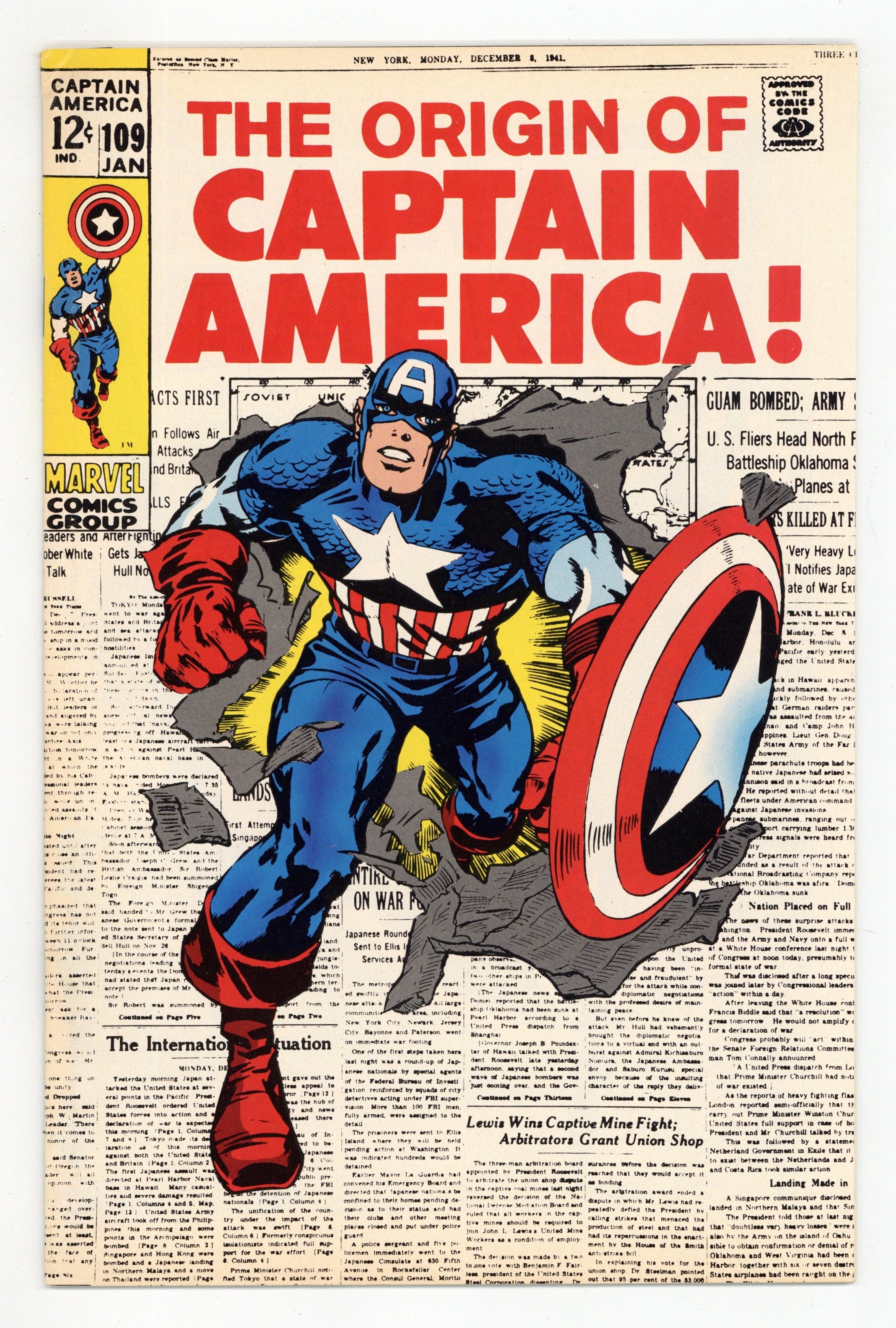 $16.001994 reprint available only through JC Penney catalog. Captain America's origin is retold in "The Hero That Was." Script by Stan Lee, pencils by Jack Kirby, inks by Syd Shores. Brief appearances by Bucky Barnes and Nick Fury. Letter to the editor from comics writer Don McGregor. Kirby/Shores cover. NOTE: Low print run. Can be identified by Stridex ad on back cover. Cover price $0.12.
