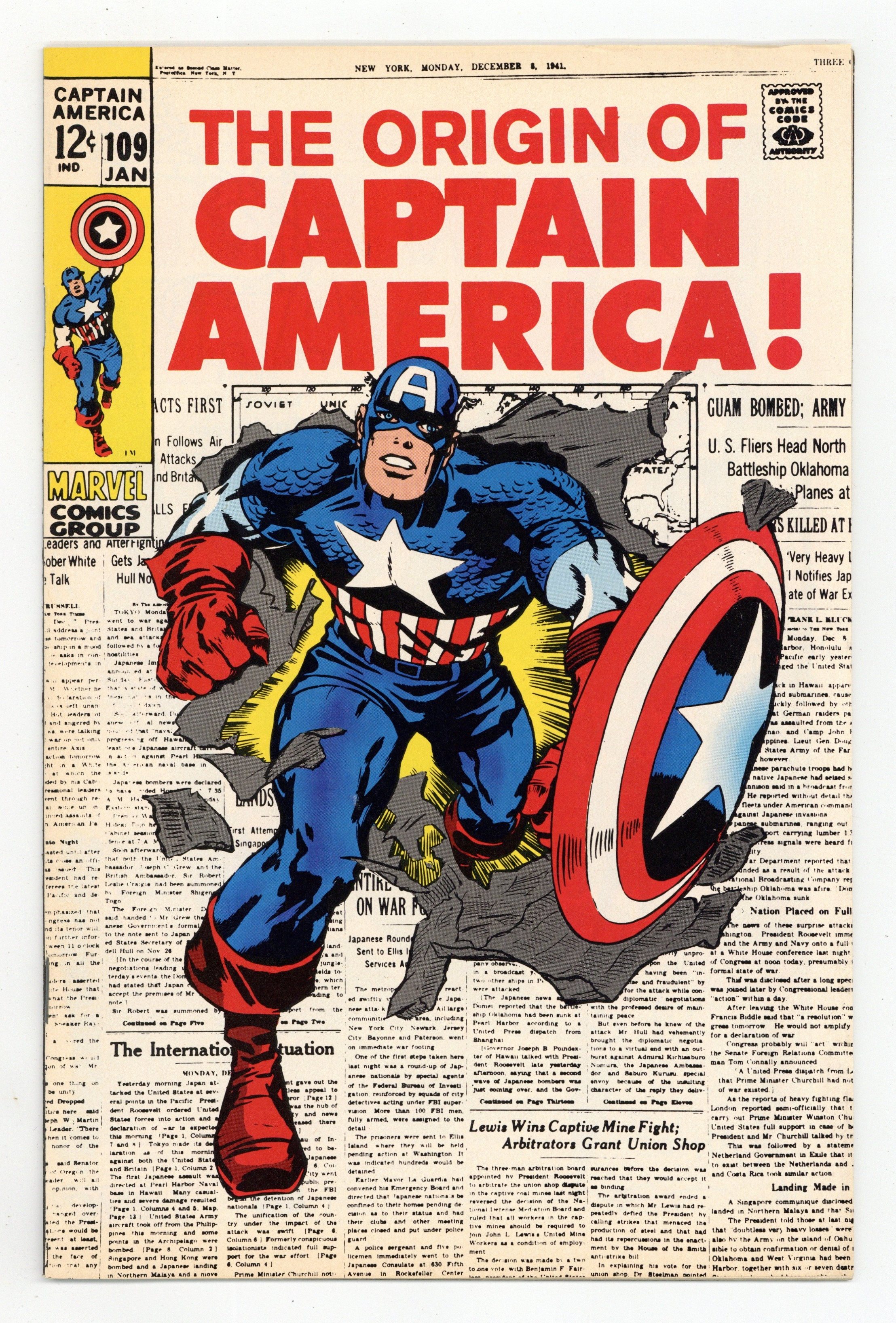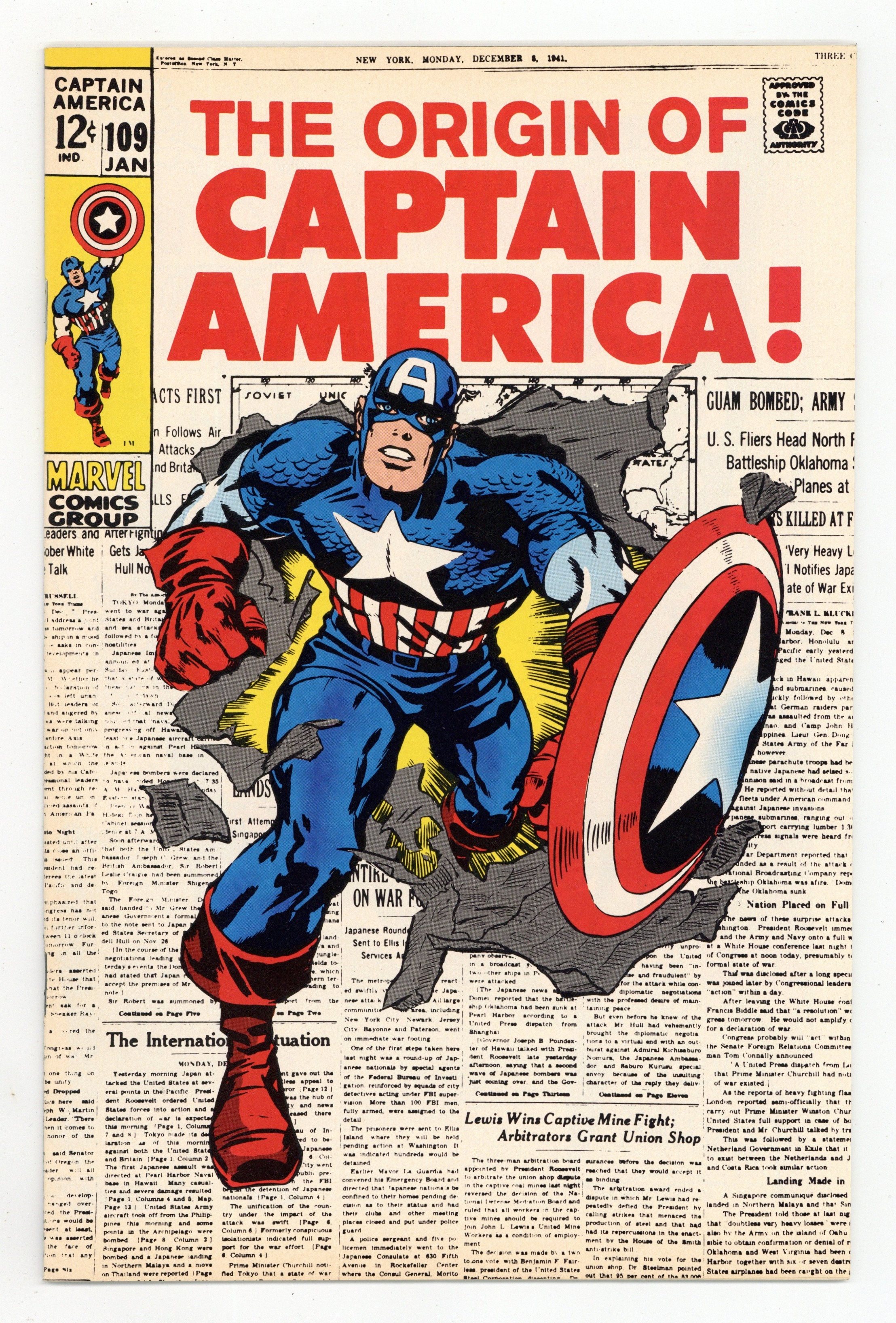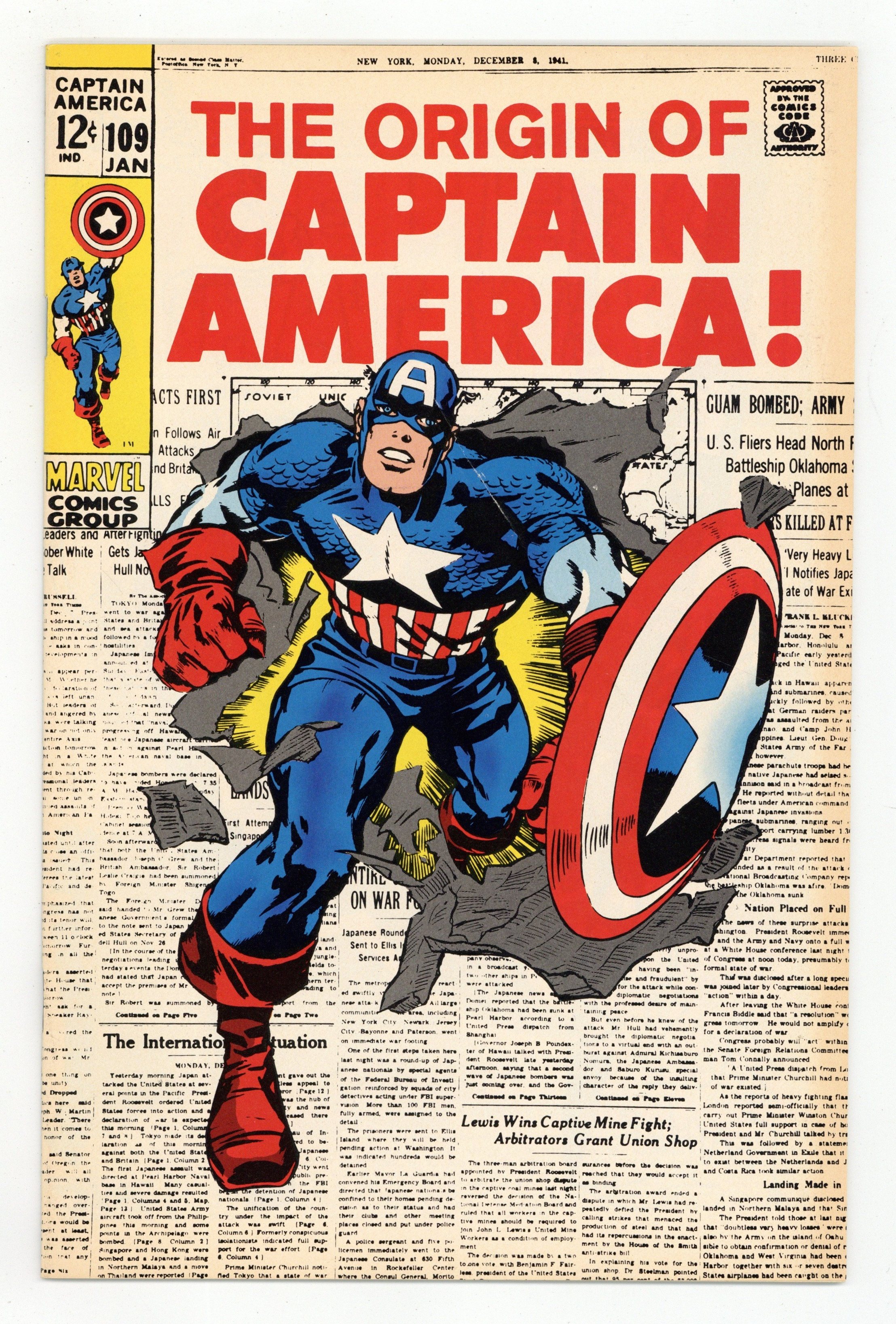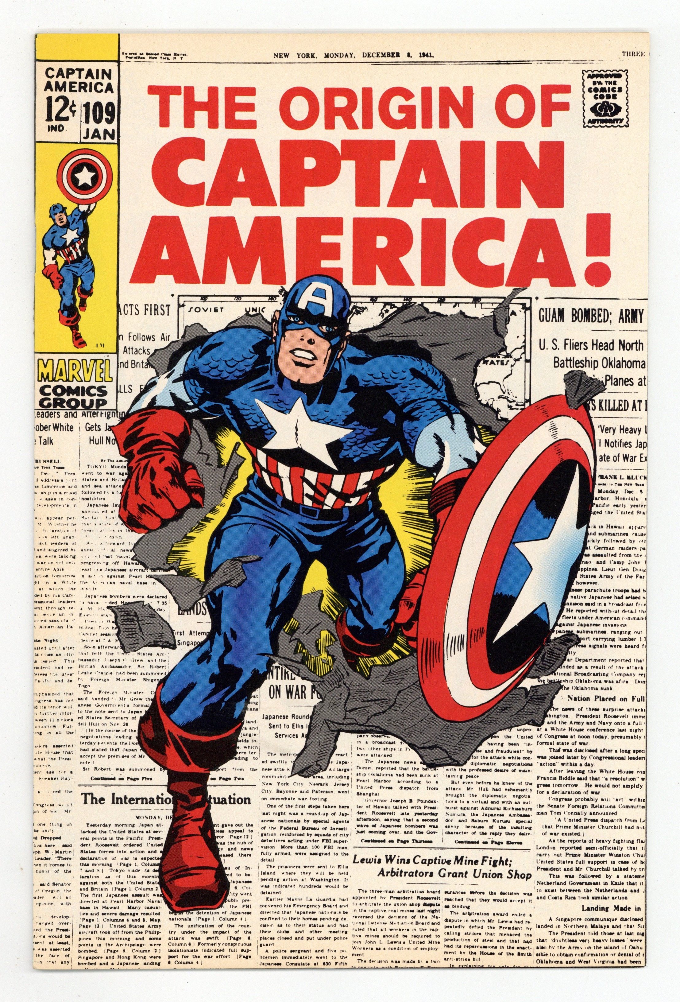 $24.001994 reprint available only through JC Penney catalog. Captain America's origin is retold in "The Hero That Was." Script by Stan Lee, pencils by Jack Kirby, inks by Syd Shores. Brief appearances by Bucky Barnes and Nick Fury. Letter to the editor from comics writer Don McGregor. Kirby/Shores cover. NOTE: Low print run. Can be identified by Stridex ad on back cover. Cover price $0.12.
