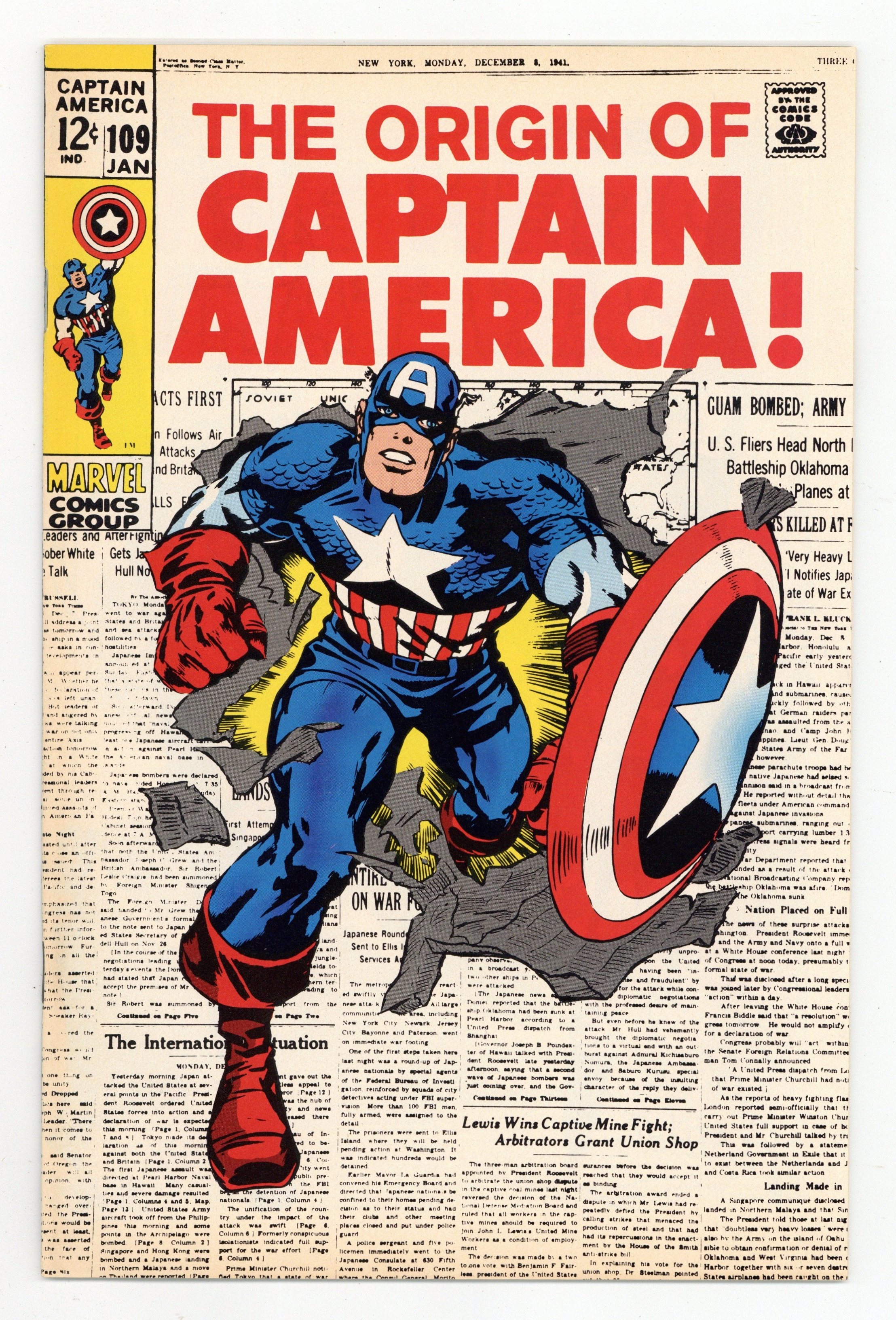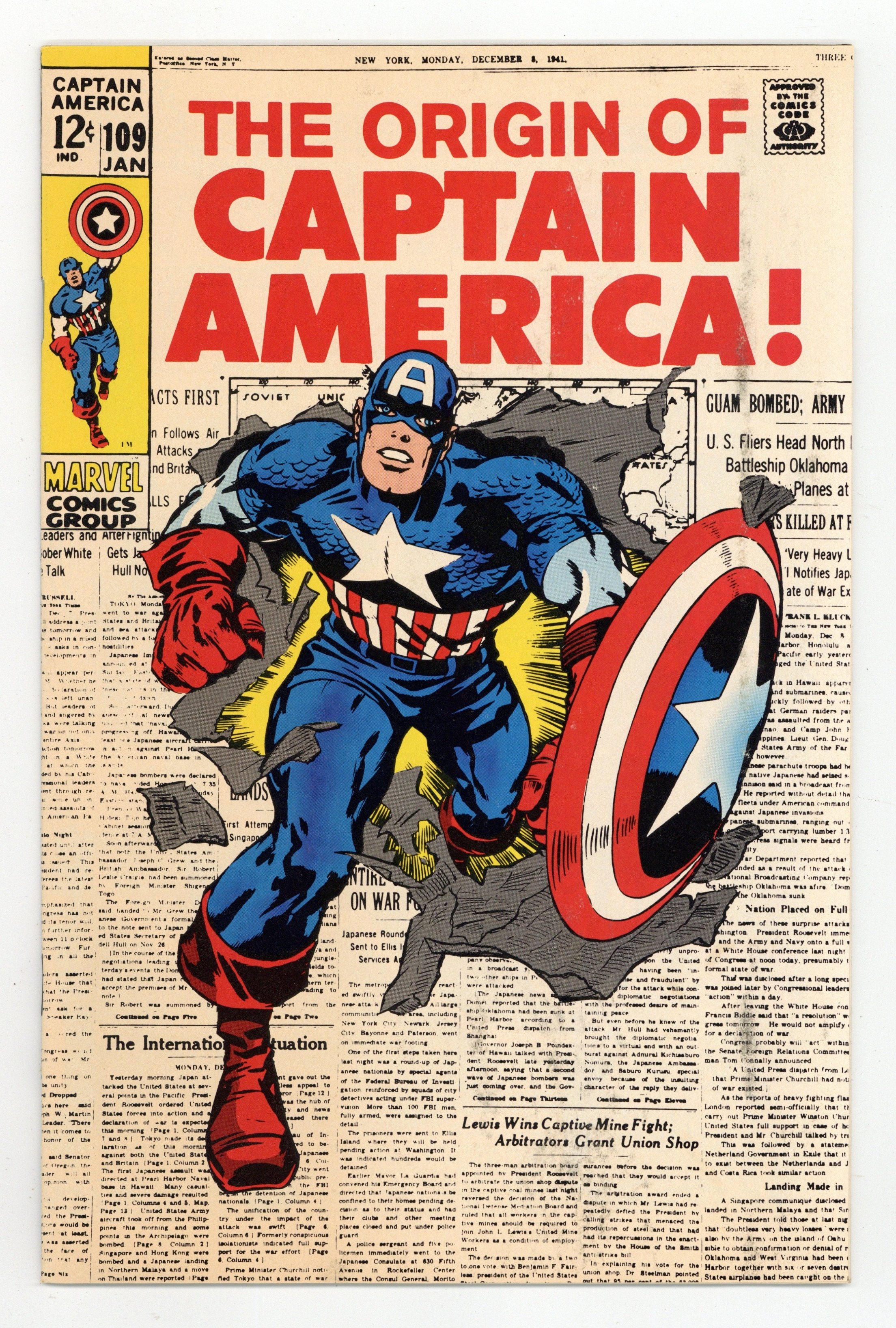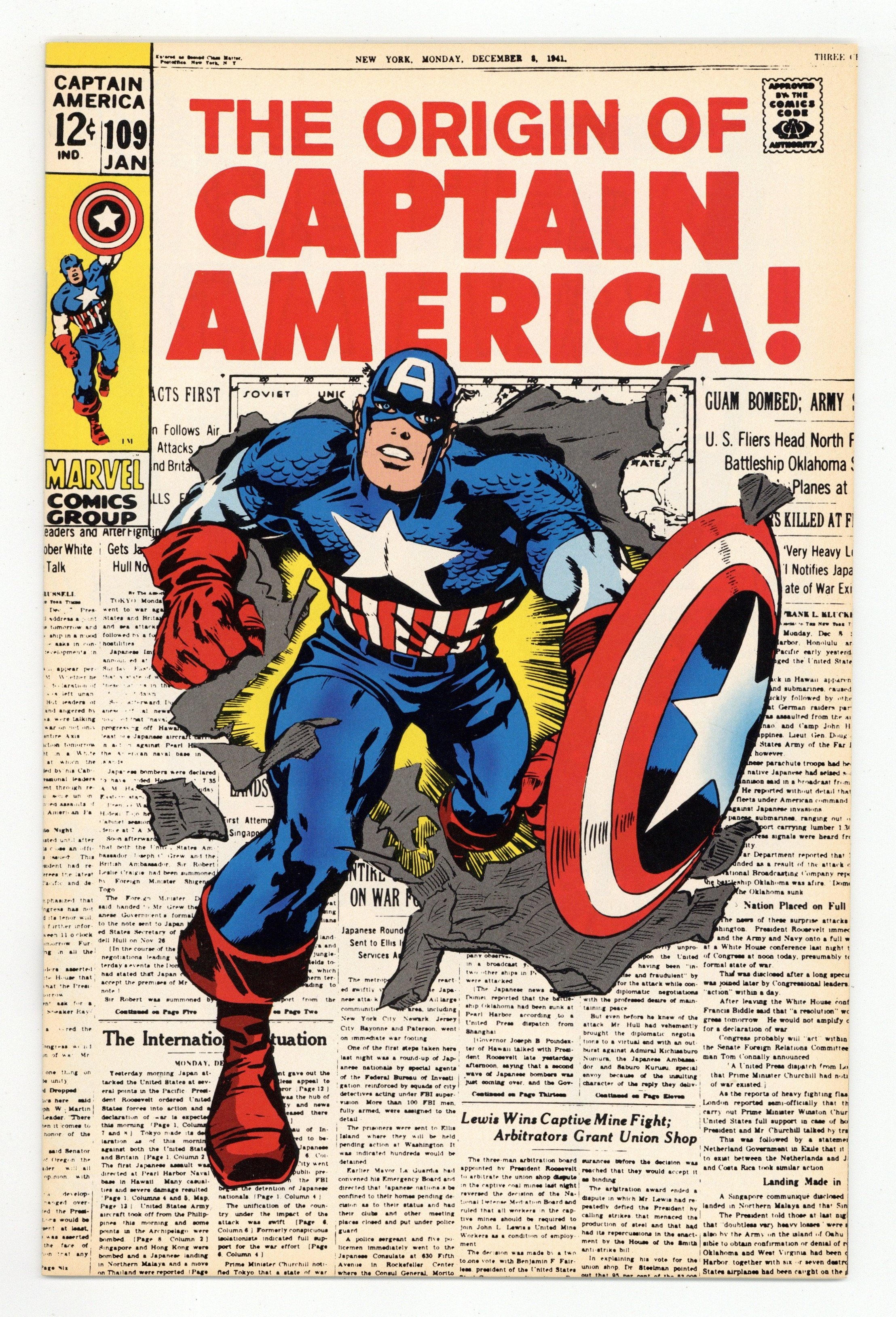 $25.001994 reprint available only through JC Penney catalog. Captain America's origin is retold in "The Hero That Was." Script by Stan Lee, pencils by Jack Kirby, inks by Syd Shores. Brief appearances by Bucky Barnes and Nick Fury. Letter to the editor from comics writer Don McGregor. Kirby/Shores cover. NOTE: Low print run. Can be identified by Stridex ad on back cover. Cover price $0.12.
