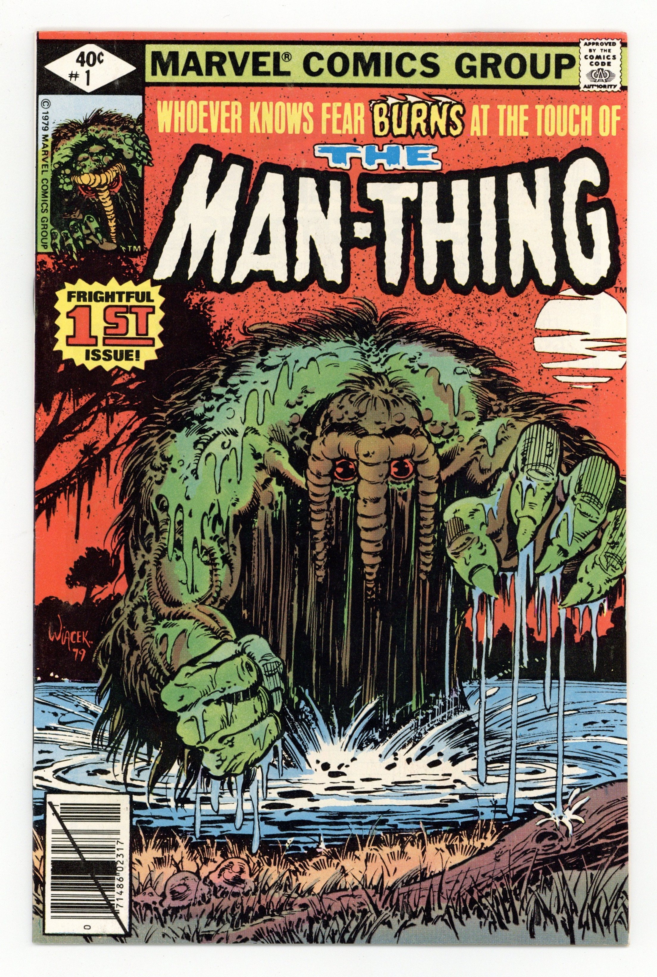 Direct Edition. "Regeneration and Rebirth!" Written by Michael Fleisher. Art by Jim Mooney and Bob Wiacek. Whoever knows fear BURNS at the touch of the Man-Thing. A group of scientist set out to cure the shambling mass of muck and flora the Man-Thing, a monstrous creature that was once known as Ted Sallis. But before they can treat the monster, they must capture it. A feat easier said than done. 32 pages, FC. Cover price $0.40.