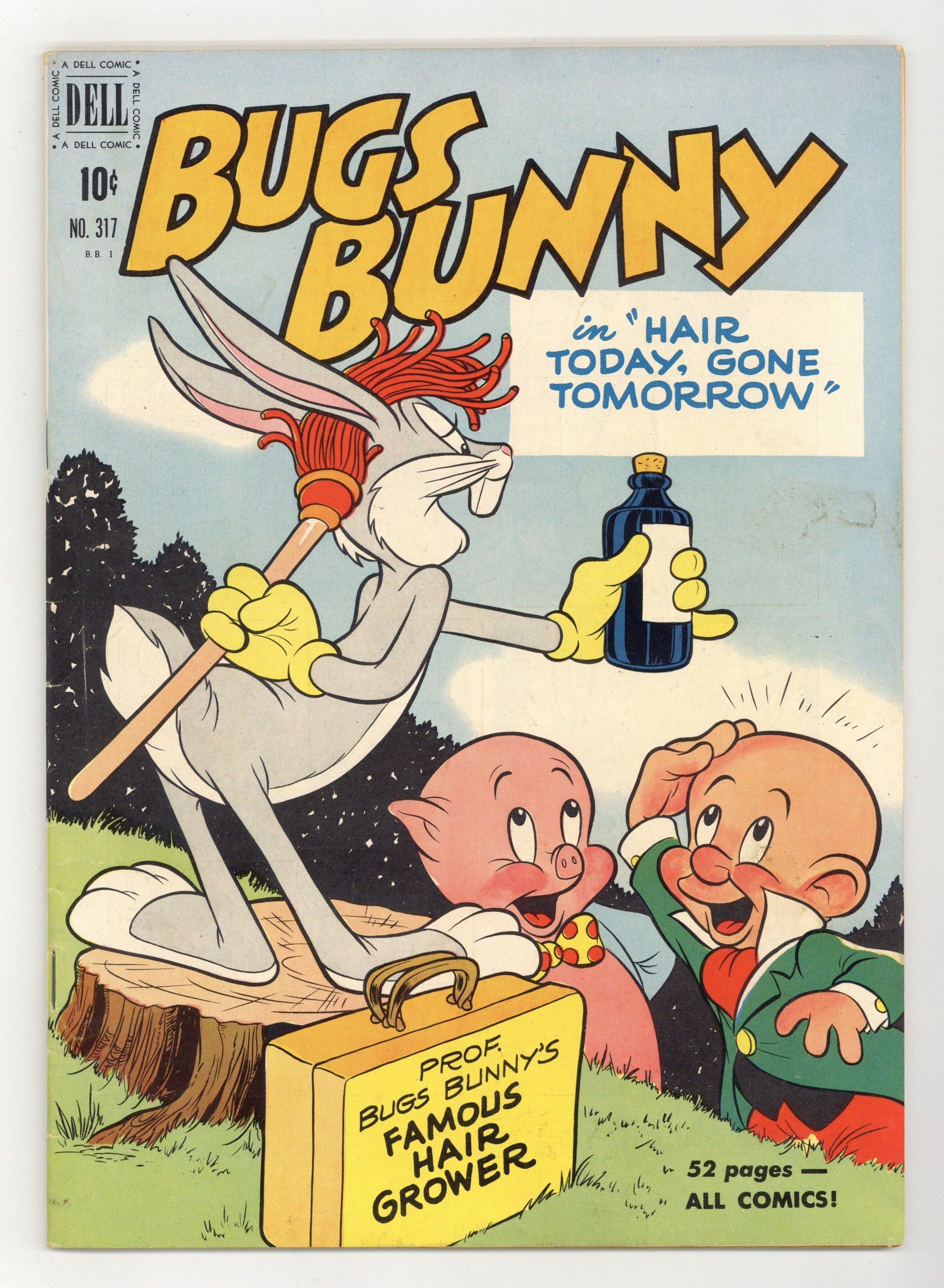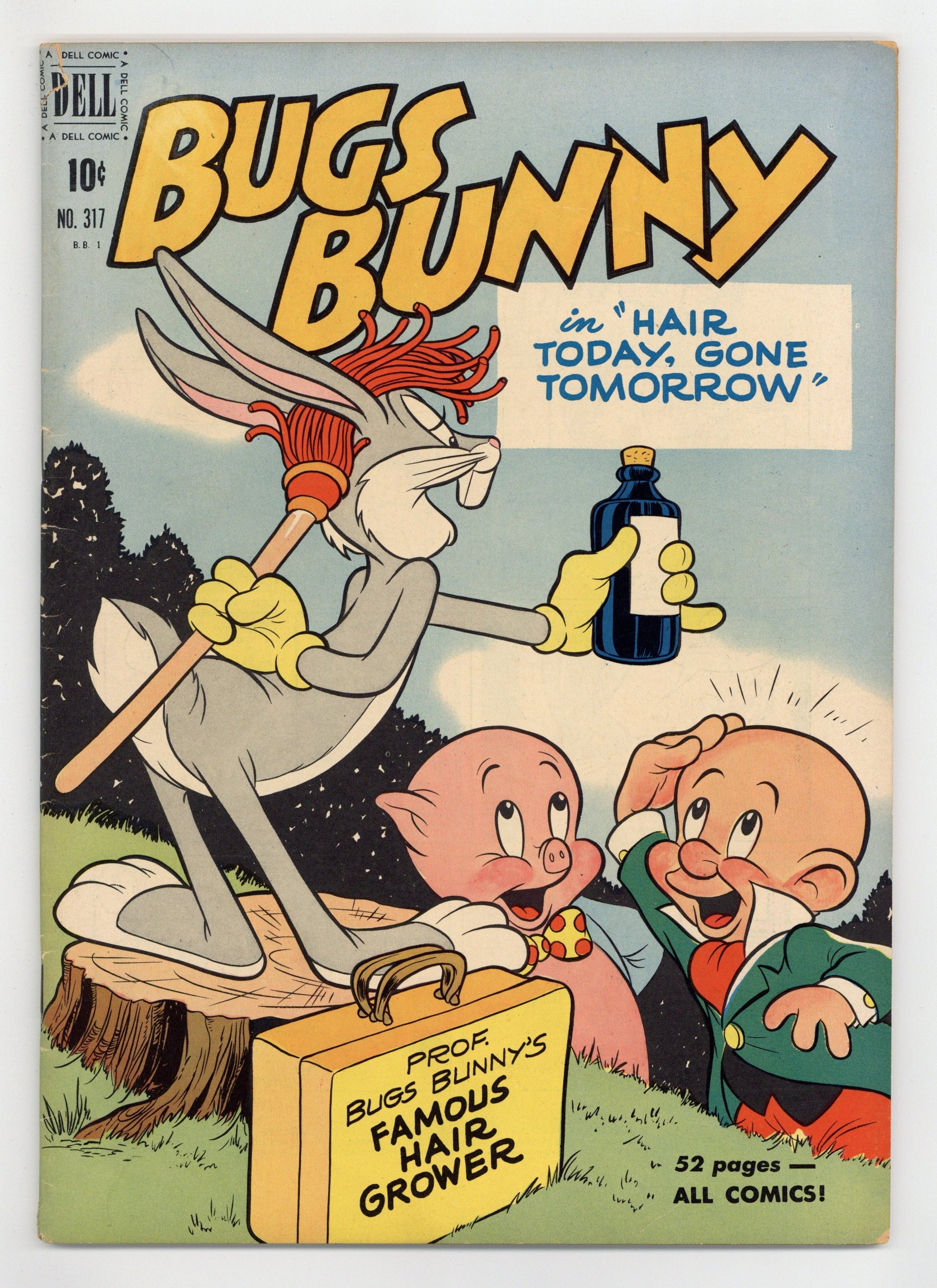 Cover by Ralph Heimdahl. Stories by Don R. Christensen and various. Art by Fred Abranz, John Carey and Tony Strobl. Featuring the tales "Hair Today, Gone Tomorrow," "Senor Bullfighter," "Duel at Dawn" and "[Backseat driver]," plus additional stories on the inside front and inside back covers, as well as the back cover. Starring Bugs Bunny! 52 pages, full color. Cover price $0.10.