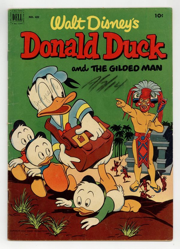 Cover art by Carl Barks. Stable Prices; Scrooge complains about the price at Donald's riding stable. Donald Duck and "The Gilded Man"; The ducks go to British Guiana in search of the world's rarest stamp, a one-cent magenta of 1856, and find it on a letter in the possession of El Dorado, a giant golden Indian; After they retrieve the letter, the ducks learn that it is addressed to a deceased Duckburg resident who named Gladstone her only heir. Armored Cat Rescue; Donald puts on sturdy clothing to bring Daisy's cat down from a telephone pole. All scripts and art by Carl Barks. 36 pages, full color. Cover price $0.10.