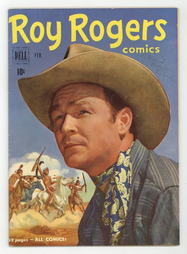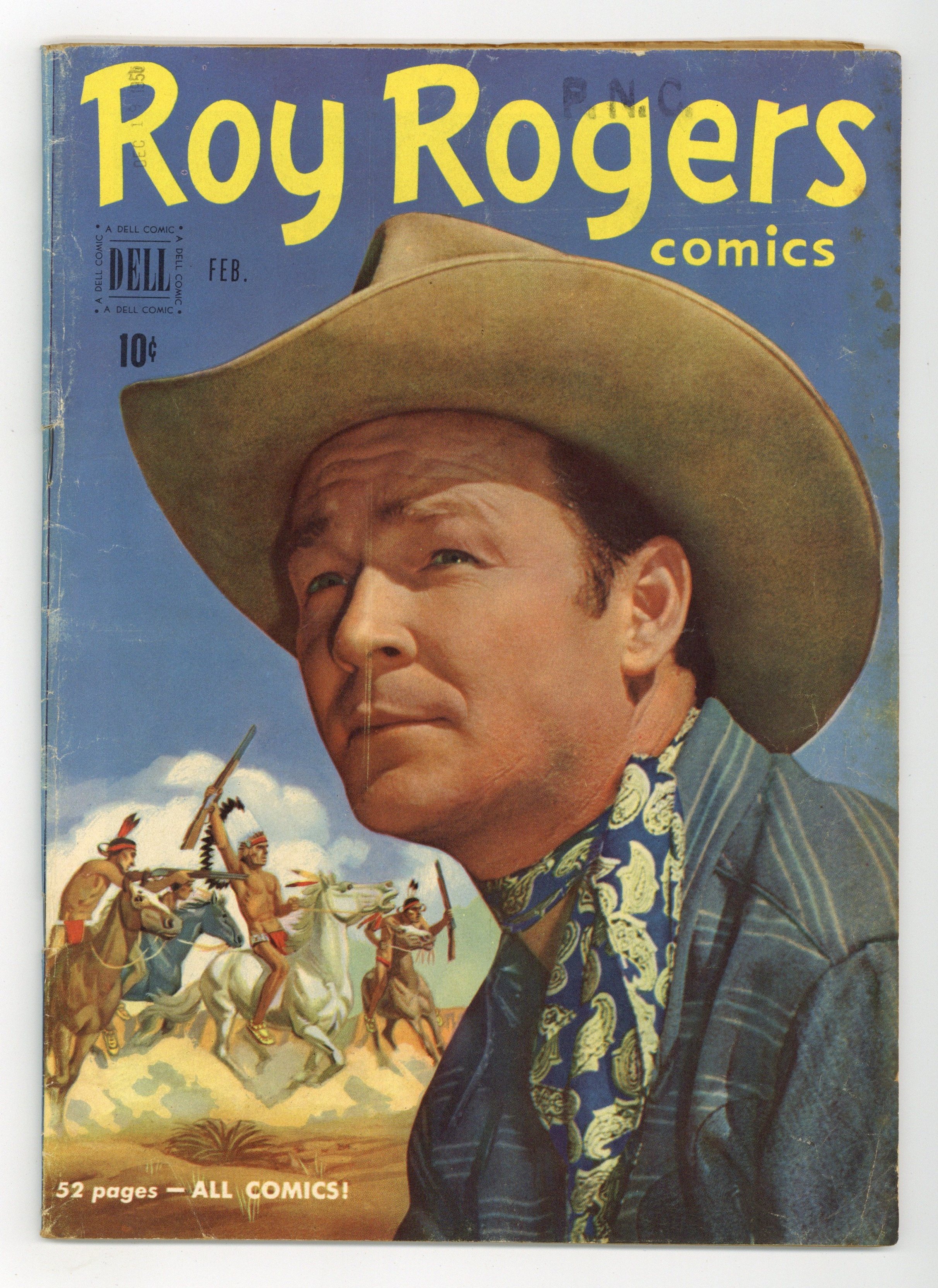 Photo cover of the famous singing cowboy, plus interior photos. The Boss of the Unagalla starring Roy Rogers, art by Albert Micale; the Sheriff needs legal proof that the new Unagalla Cattle Co is stealing the stock and shooting the riders of the small ranchers. Horse Thief Canyon starring Roy Rogers, art by Al McKimson team; Horse thieves steal all the mares and colts in Trigger Junior's bunch. Pioneers of the Old West text story, art by Albert Micale. Trigger story, art by Harry Parks. 52 pages, full color. Cover price $0.10.