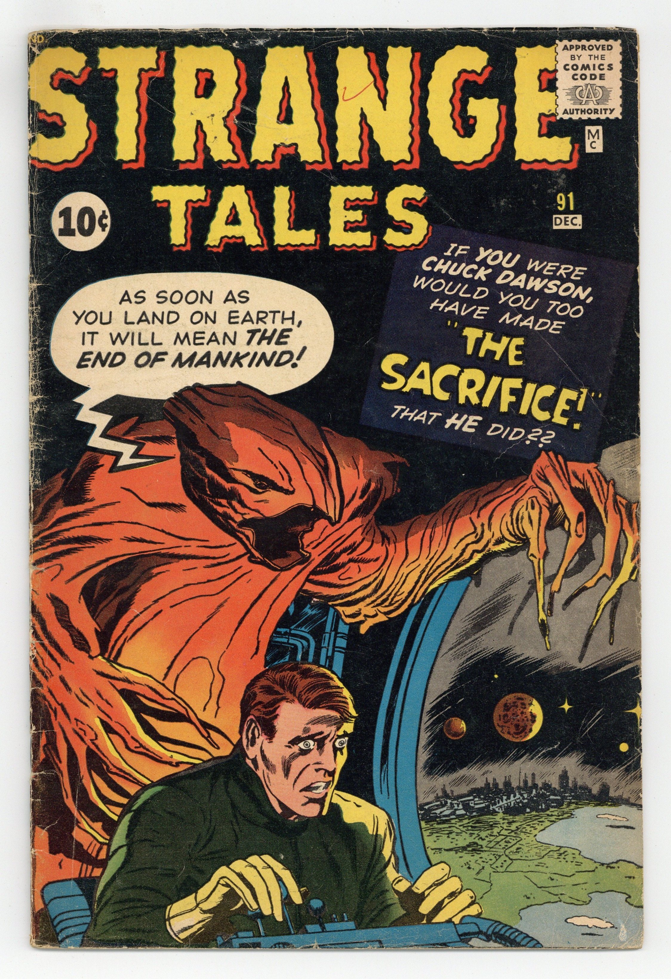 Cover pencils by Jack Kirby, inks by Dick Ayers. "The Sacrifice!", pencils by Jack Kirby, inks by George Klein; An astronaut sent to Mars encounters a telepathic plant that destroyed all life on Mars and forces him to take it to Earth; The man kills himself by blowing up the spaceship and stranding the plant in space. "Strange Mission" text story, art by Joe Maneely. "The Coming of the Giants," art by Paul Reinman; Alien giants menace New York, but retreat at token resistance; The people find a projector and decide that the aliens' giant size was an illusion. "The Mask of Morgumm!", art by Don Heck; A baby-faced criminal gets an ugly mask to disguise himself and intimidate people; When he removes the mask he finds that it has made his face just as ugly as the mask and so easily recognizable. "The Warning!", script by Stan Lee, art by Steve Ditko; A man frantically tries to convince people in a park that he saw a statue move; When he is unsuccessful he is satisfied, since now he knows that his alien people's plan to infiltrate Earth with soldiers disguised as statues will work. 36 pgs., full color. Cover price $0.10.