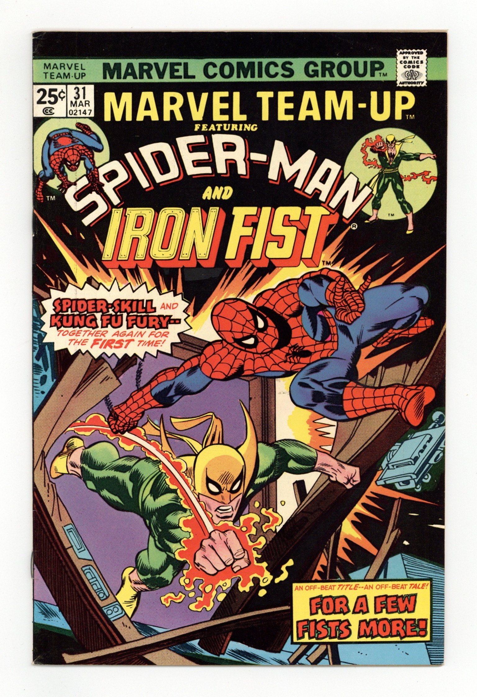 "For A Few Fists More!" Guest-starring Spider-Man and Iron Fist. Script by Gerry Conway. Pencils by Jim Mooney. Inks by Vince Colletta. Cover by Gil Kane and Frank Giacoia. Iron Fist and Spider-Man battle Drom the Backwards Man! If Spider-Man and the Living Weapon can reverse time, they will straighten out the backwards man! (Notes: This issue features the first meeting between Iron Fist and Spider-Man, and was reprinted in Marvel Treasury Edition #18. The letters page includes a letter from comics writer Ralph Macchio.) This issue 36 pages. Cover price $0.25.