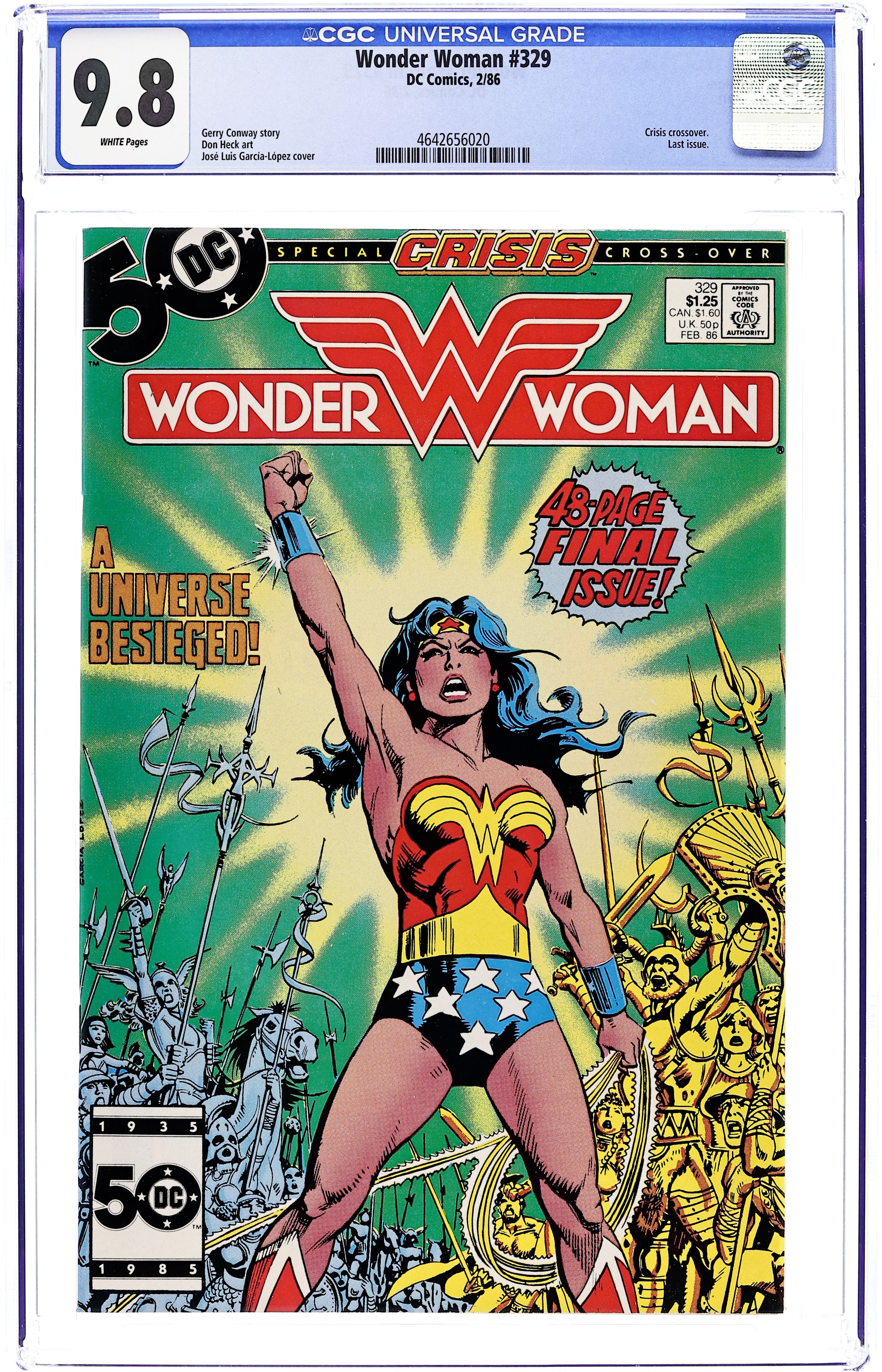 Crisis crossover. Last issue in this series. Cover by Jose Luis Garcia-Lopez. "Of Gods and Men," script by Gerry Conway, art by Don Heck; After meeting with both the Anti-Monitor and Mars, Hades agrees to help his newfound allies against the Olympian gods and Amazons; On Paradise Island, despite Wonder Womans encouragement, Hippolyte sees devastation and refuses to try to continue; But Kore appears to both Amazons and tells them Hades, her husband, has fallen in with the Anti-Monitor, and both of them will find no respite in the underworld; At that point, the dead Amazons are reanimated by Hades, turned into zombies, and sent against Hippolyte, Wonder Woman, and Kore, but Diana defeats them and Kore sends them back to Hadess realm. On Earth, Lauren Haley dies as she falls in a crevasse; Wonder Woman returns to Washington, D.C. and reunites with Steve Trevor; They kiss, embrace, and declare their love for each other, leaving Etta alone with Howard; Howard admits he is in love with Etta, and she says that she has a feeling they will never see Wonder Woman or Steve again; Steve heads for Olympus with Wonder Woman in the Robot Plane; On Olympus, Wonder Woman, Steve, and Hippolytas Amazons face Mars and his zombie legions. 52 pages, Full Color. Cover price $1.25.