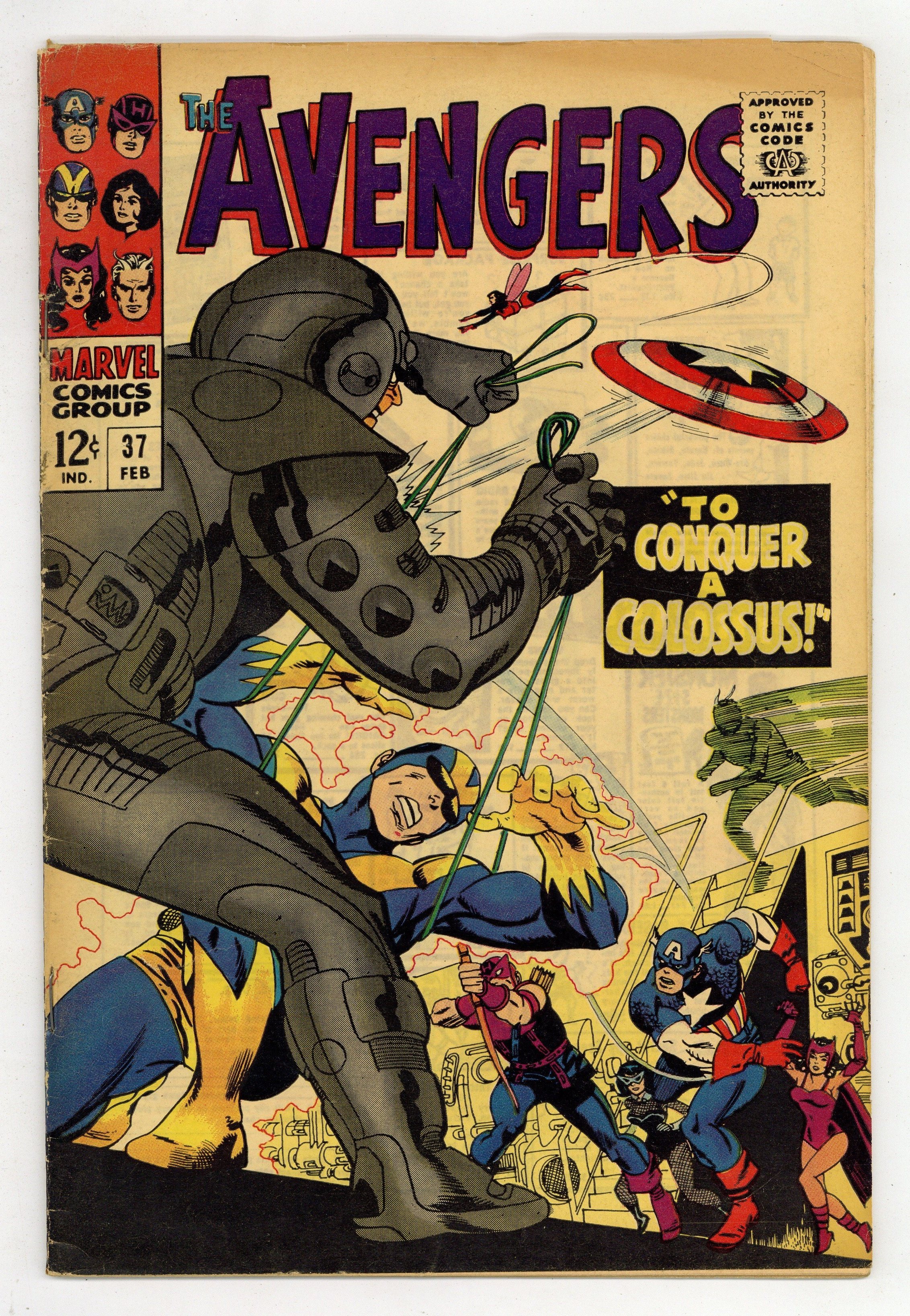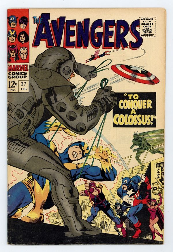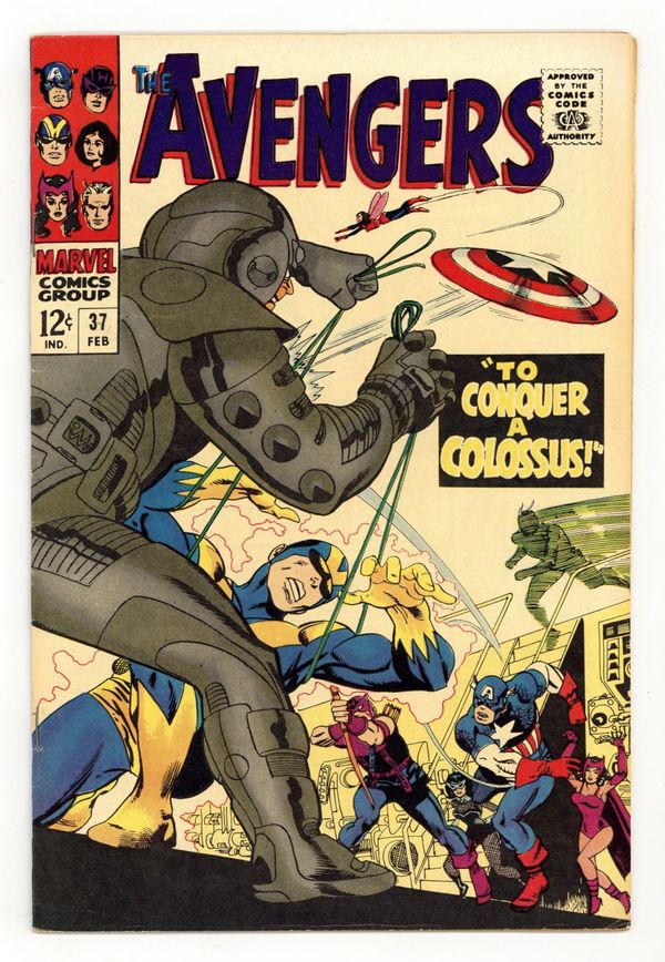 "To Conquer a Colossus!" Part 2 of 2. Script by Roy Thomas. Art by Don Heck. Cover by Gil Kane. Against their will the Avengers blast off into outer space onboard Ixar's spaceship! The alien mastermind wants to transfer the Avengers' powers into his army of ultroids! And then merge all the ultroids into one colossal ultroid! But Earth's Mightiest Heroes have a few tricks up their sleeve! Plus one ace in the hole...or perhaps better stated: a widow in the hole. Will Ixar's disregard of Natasha lead to hisdownfall? The Black Widow has a deadly bite! Avengers Lineup: Captain America, Goliath, Hawkeye, Quicksilver, Scarlet Witch, and the Wasp. (Note: This issue was reprinted in Marvel Triple Action #29.) 36 pages. Cover price $0.12.