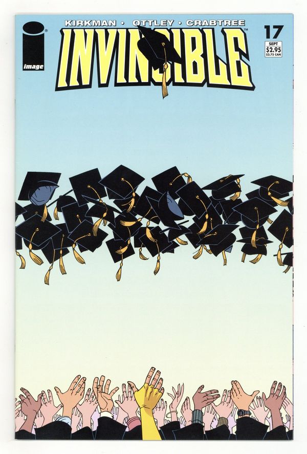 09.15/$2.95 monthly ongoing series full color/32 pages written by ROBERT KIRKMAN art by RYAN OTTLEY cover by CORY WALKER & BILL CRABTREE CONCEPT: Mark Grayson is just like everyone else his age, except that his father is the most powerful superhero on the planet. And now he's begun to inherit his father's powers. It all sounds okay at first, but how do you follow in your father's footsteps when you know you will never live up to his standards? THIS ISSUE: Old doors close as new ones open. Mark Grayson, AKA Invincible, has reached the end of his high school years. Watch as our hero dons that goofy-looking cap and gown and hope some big super-villain doesn't crash his graduation ceremony. Then again, what are the chances of THAT happening? Cover price $2.95.