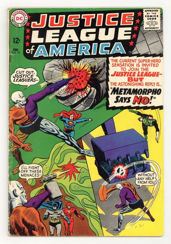 Cover pencils by Mike Sekowsky, inks by Murphy Anderson. Metamorpho Says--NO!, script by Gardner Fox, pencils by Mike Sekowsky, inks by Bernard Sachs; When Metamorpho refuses membership in the JLA, the Unimaginable demands to be admitted in his place. 36 pgs. $0.12. Cover price $0.12.