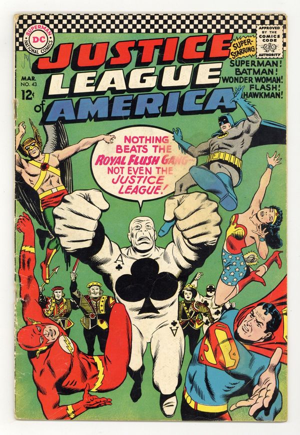 Starts Apr 4 Cover pencils by Mike Sekowsky, inks by Murphy Anderson. Card Crimes of the Royal Flush Gang, script by Gardner Fox, pencils by Mike Sekowsky, inks by Bernard Sachs; The JLA fights the Royal Flush Gang and their stelleration-powered abilities to a draw until they play their wild card...Snapper. 36 pgs. $0.12. Cover price $0.12.