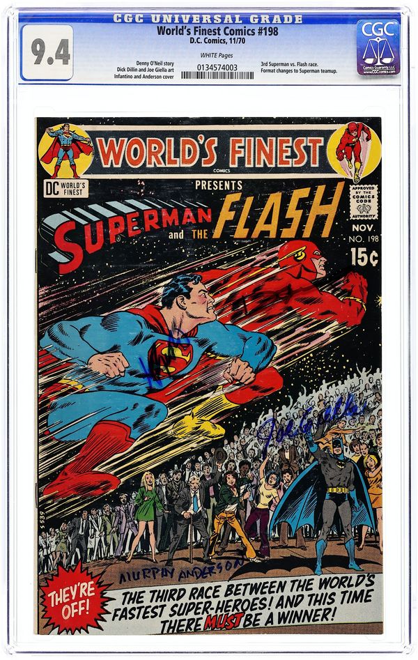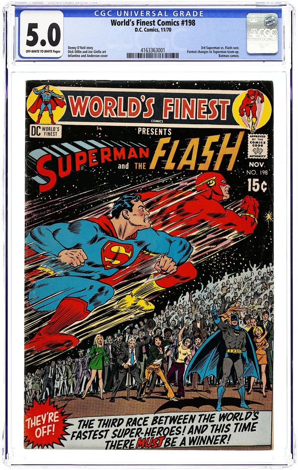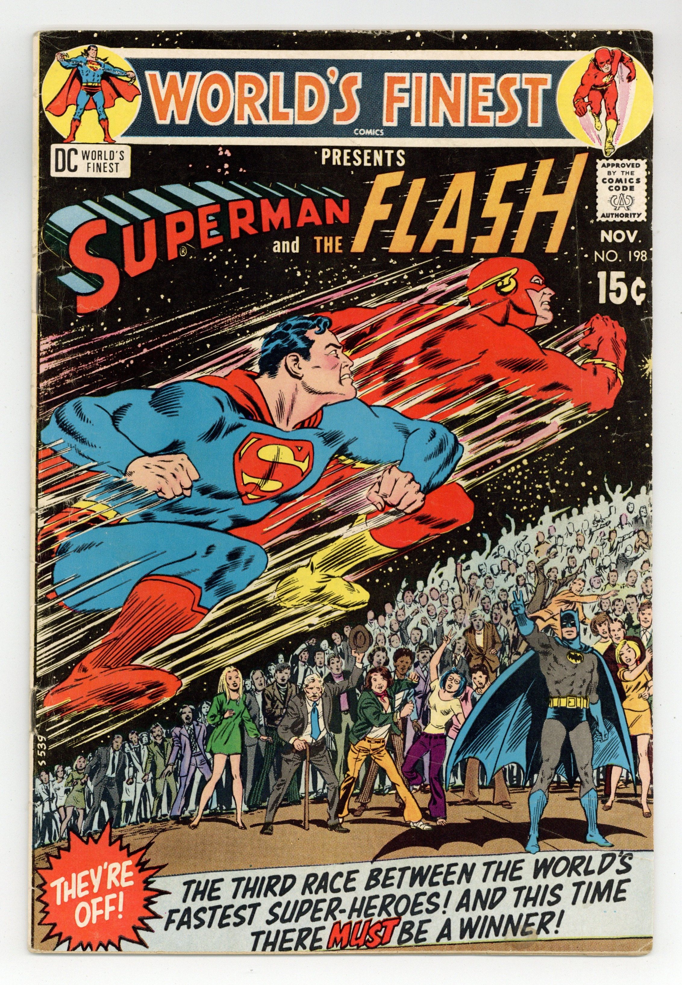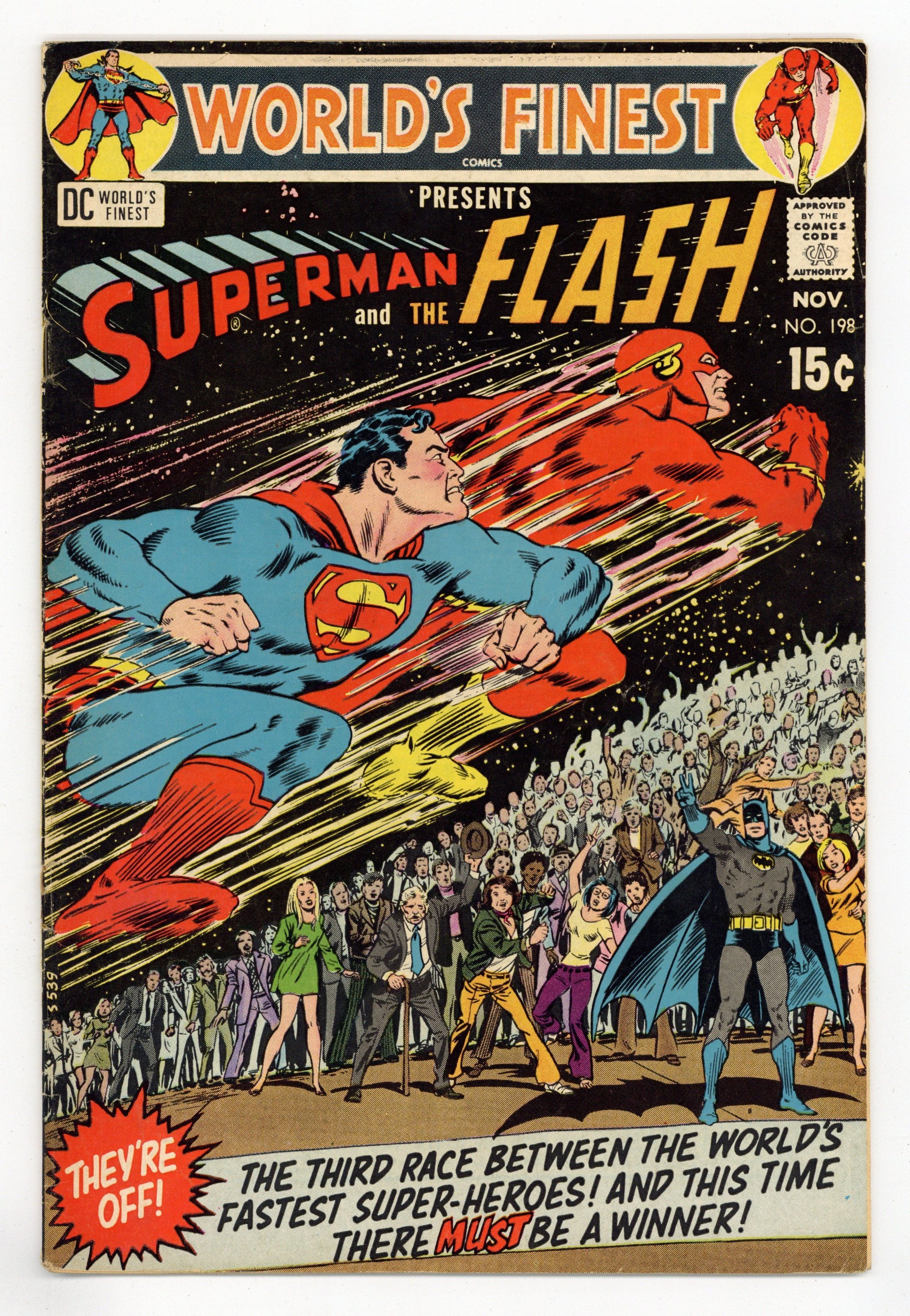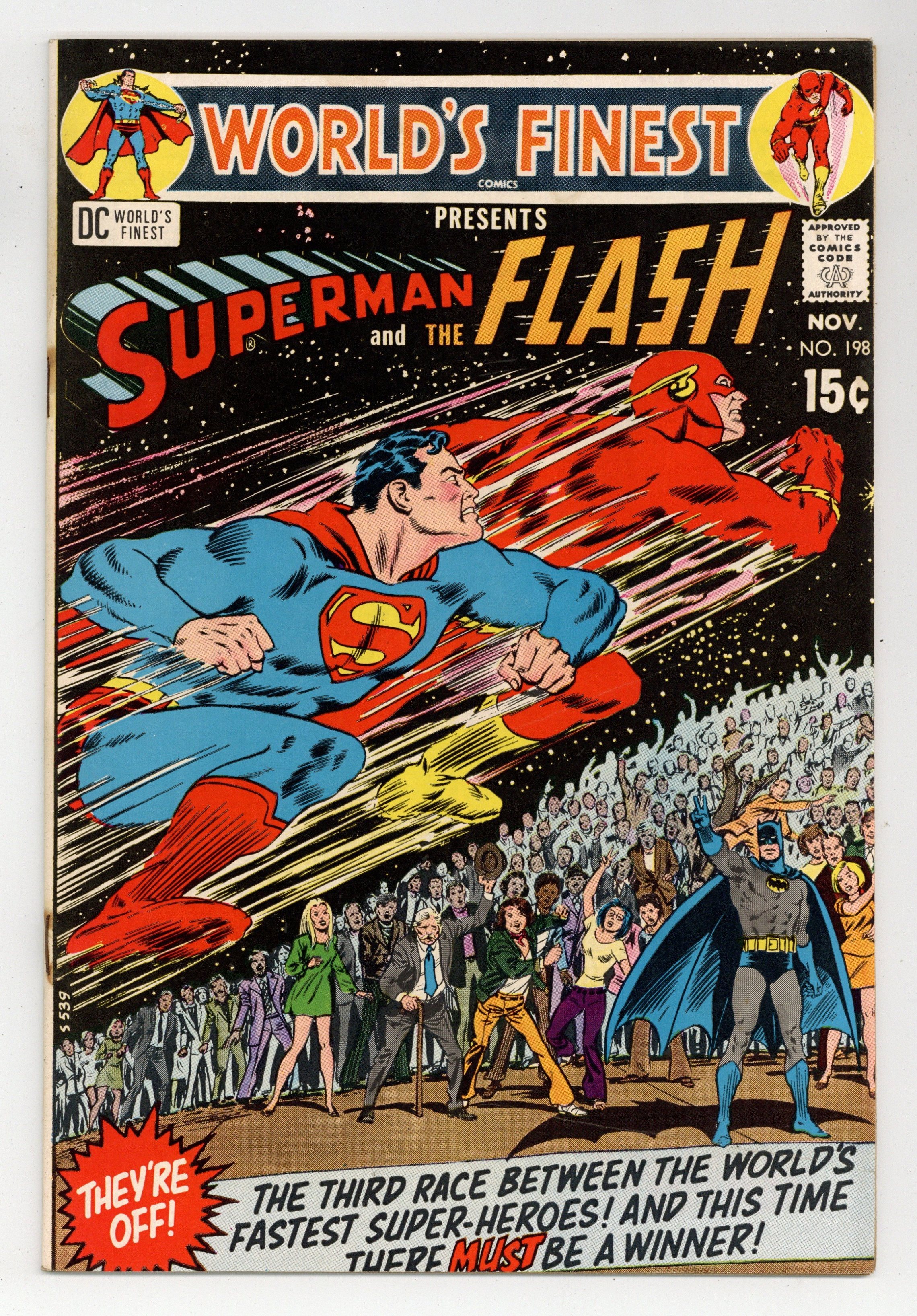 3rd Superman/Flash race. Cover pencils by Curt Swan, inks by Murphy Anderson. Race to Save the Universe! starring Superman and Flash, script by Dennis O'Neil, pencils by Dick Dillin, inks by Joe Giella; Superman and Flash run at twice the speed of light. Joanie Swift, Queen of Speed!--Editors' Round Table: Johnny Quick, art by Paul Norris. 36 Pages, Full Color. Cover price $0.15.