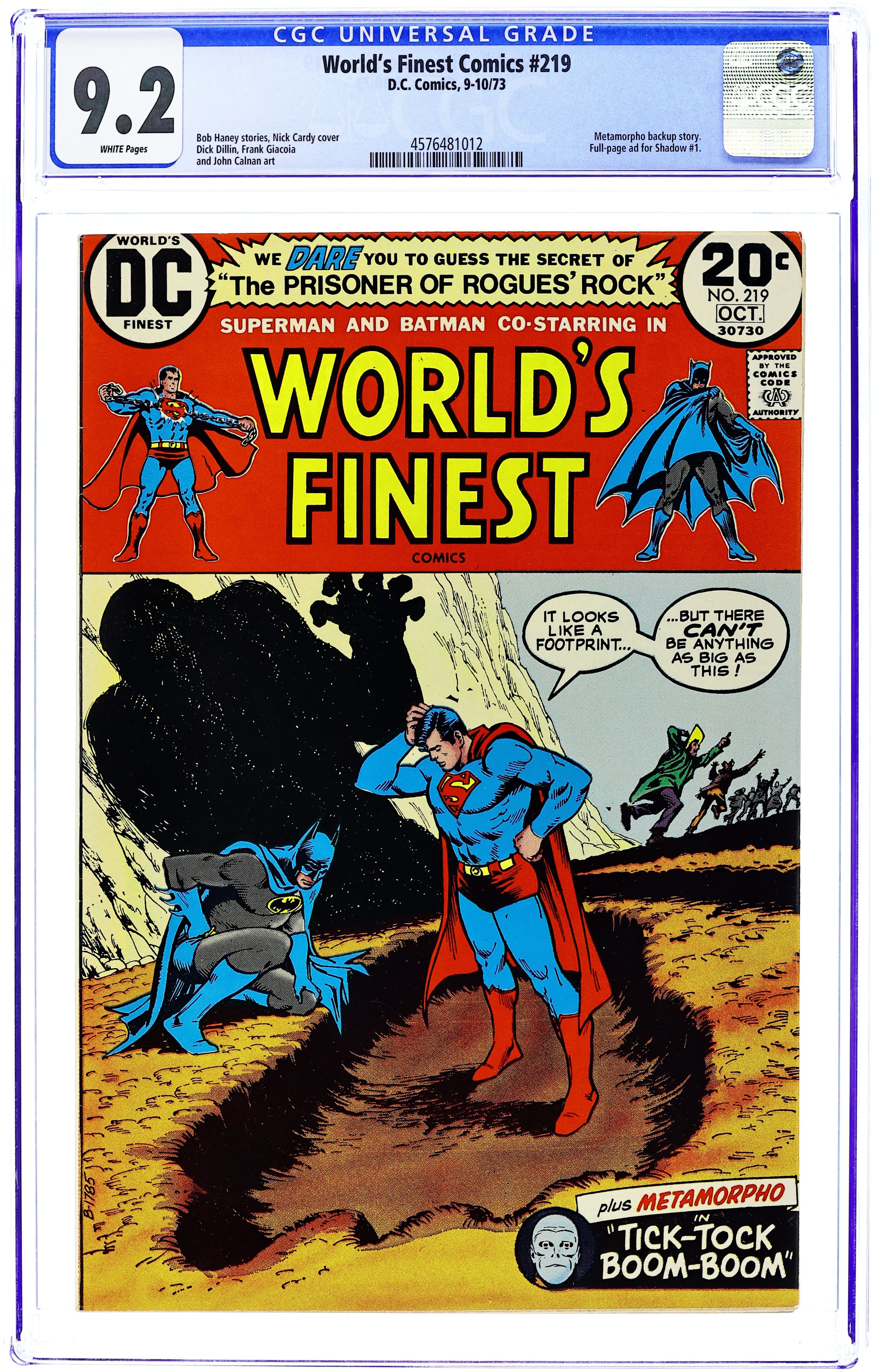 Cover art by Nick Cardy. The Prisoner of Rogues' Rock!, script by Bob Haney, pencils by Dick Dillin, inks by Frank Giacoia; Superman and Batman travel to South America to discover the secret of El Monstro and why he is distributing Nazi gold to poor peasents. Tick-Tock Boom Boom starring Metamorpho, script by Bob Haney, art by John Calnan; Someone is setting bombs in all of Stagg's properties. A letter from comics writer Bob Rozakis. 36 Pages, Full Color. Cover price $0.20.