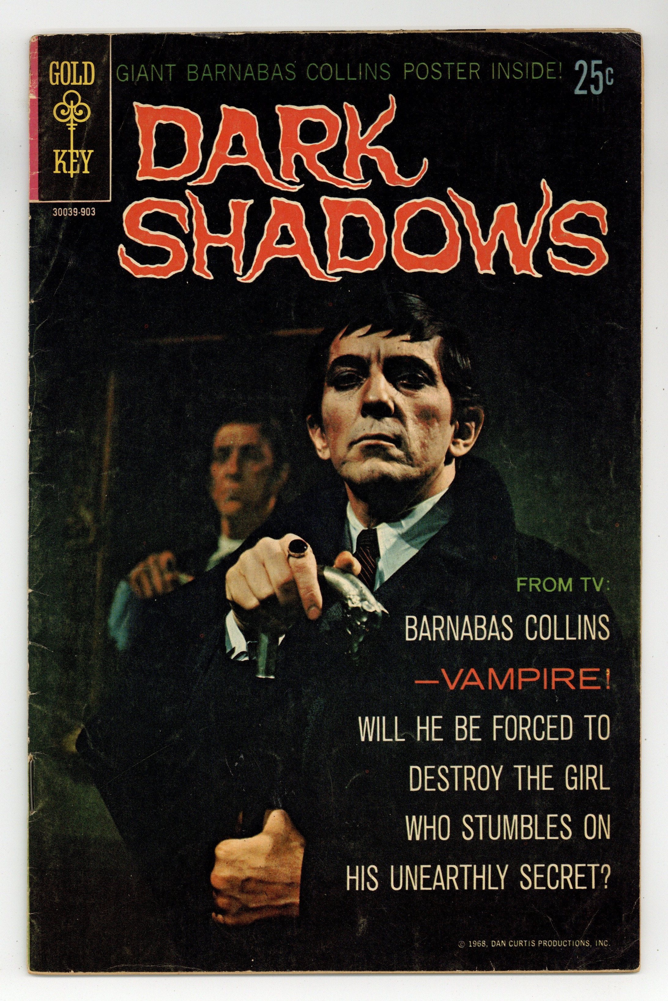 # on cover: 30039-903 no date. Does not have pull-out poster. From TV: Barnabas Collins -- vampire! Will he be forced to destroy the girl who stumbles on his unearthly secret? Find out in "The Vampire's Prey"! Characters: Barnabas Collins (first appearance; origin); Angelique Bouchard (first appearance; villain; a ghost). Written by Don Arneson, with art by Joe Certa. Photo cover. Cover price $0.25.