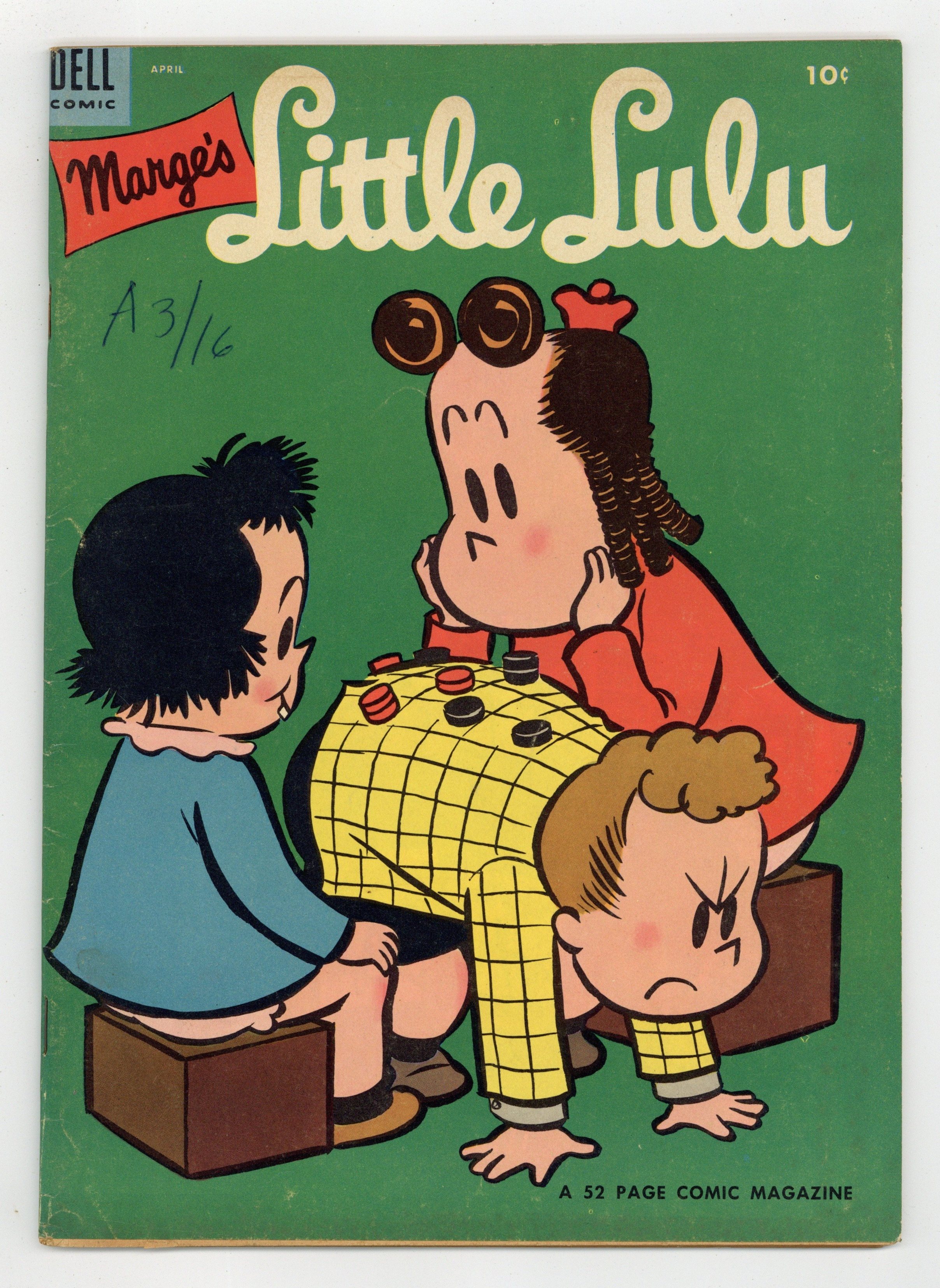 Published Apr 1954 by Dell/Gold Key.$18.00Two Lulus; A department store dummy maker makes one that looks just like Lulu. The Clown; Tubby tries to cheer up Lulu after her doll's head breaks. The Hunters; The Fellers play a trick on Lulu with jelly beans. Black Mumday; Iggy accidentally talks to Lulu on Mumday and is thrown out of the club. Cats; Tubby and Iggy round up all the stray cats in the neighborhood. A Bus to Fairyland; Lulu tells Alvin about the little girl who found Fairyland. Three Feathers; Wilbur dresses Alvin up like a baby to fool the Fellers. Two-page text story, Lulus Diry ("Diary"). 52 pages, full color. Cover price $0.10.