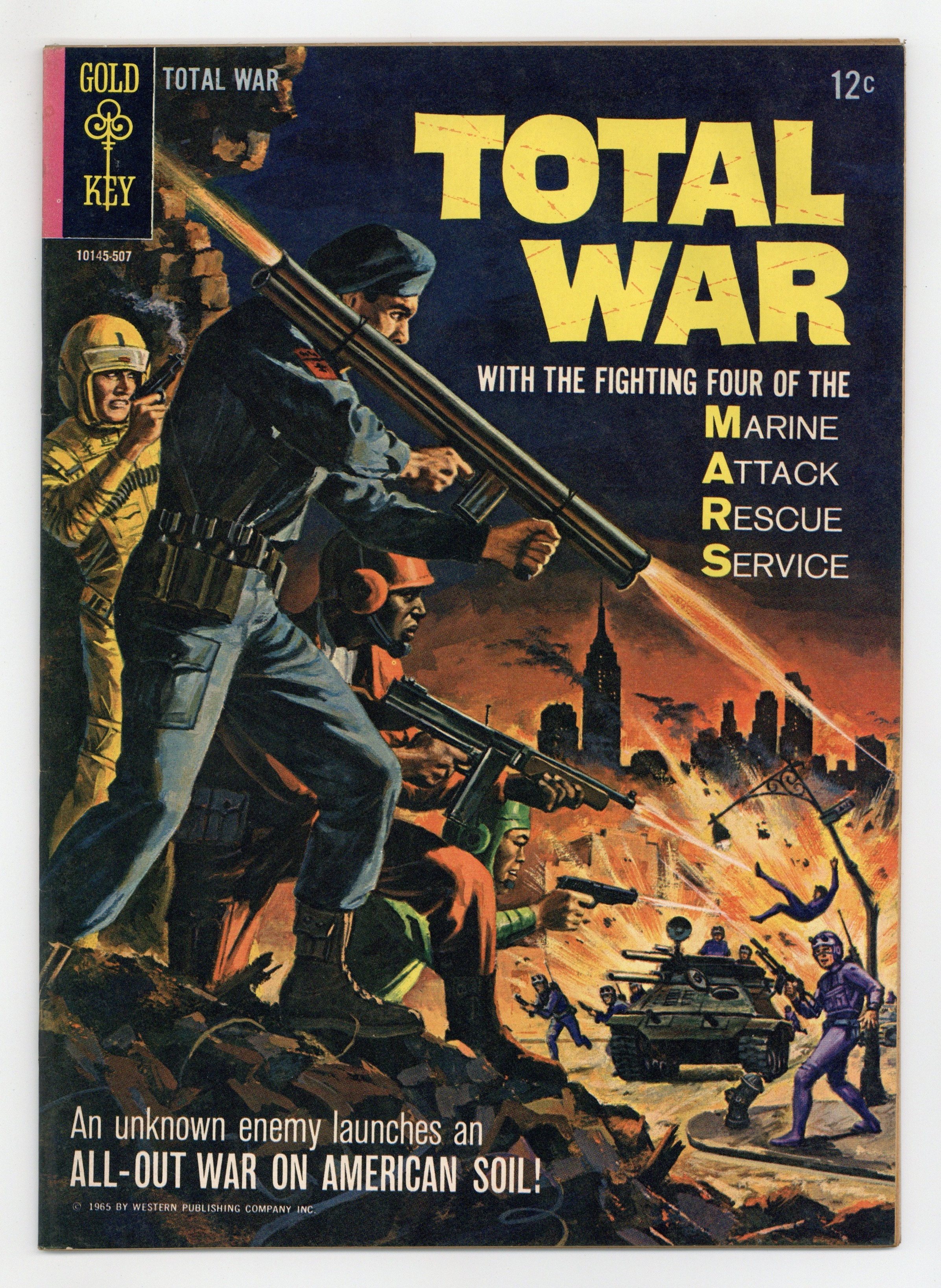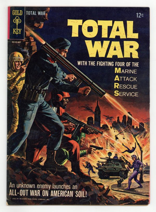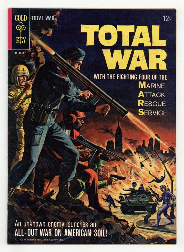 Painted front and back cover art by George Wilson. "Weapons and Warfare, Number 5: Modern Infantry Weapons" Keys of Knowledge page, art by Joe Certa. "Target: America," script by Leo Dorfman, art by Wally Wood; Strange invaders strike into America and around the world, ruthlessly killing as they go; The M.A.R.S. Patrol takes the lead in fighting them off between Philadelphia and New York City; The unknown enemy retreats and vanishes, killing their wounded as they go, but immediately strike again elsewhere. "Weapons and Warfare, Number 6: Modern Infantry Weapons" Keys of Knowledge page, art by Joe Certa. 36 pgs., full color. Cover price $0.12.